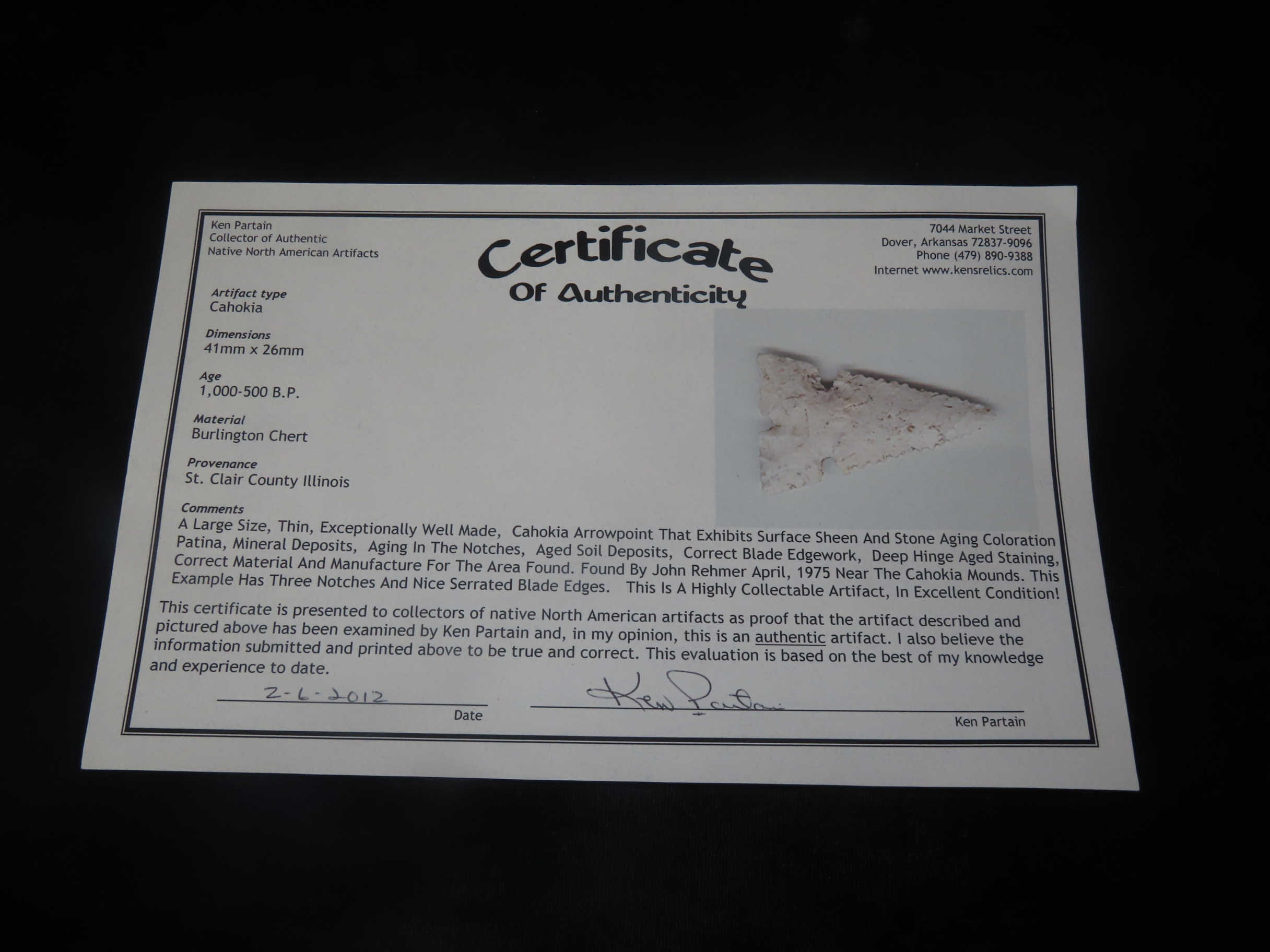 1 5/8″ X 1″ Cahokia, Partain COA, Found in St. Clair County IL.