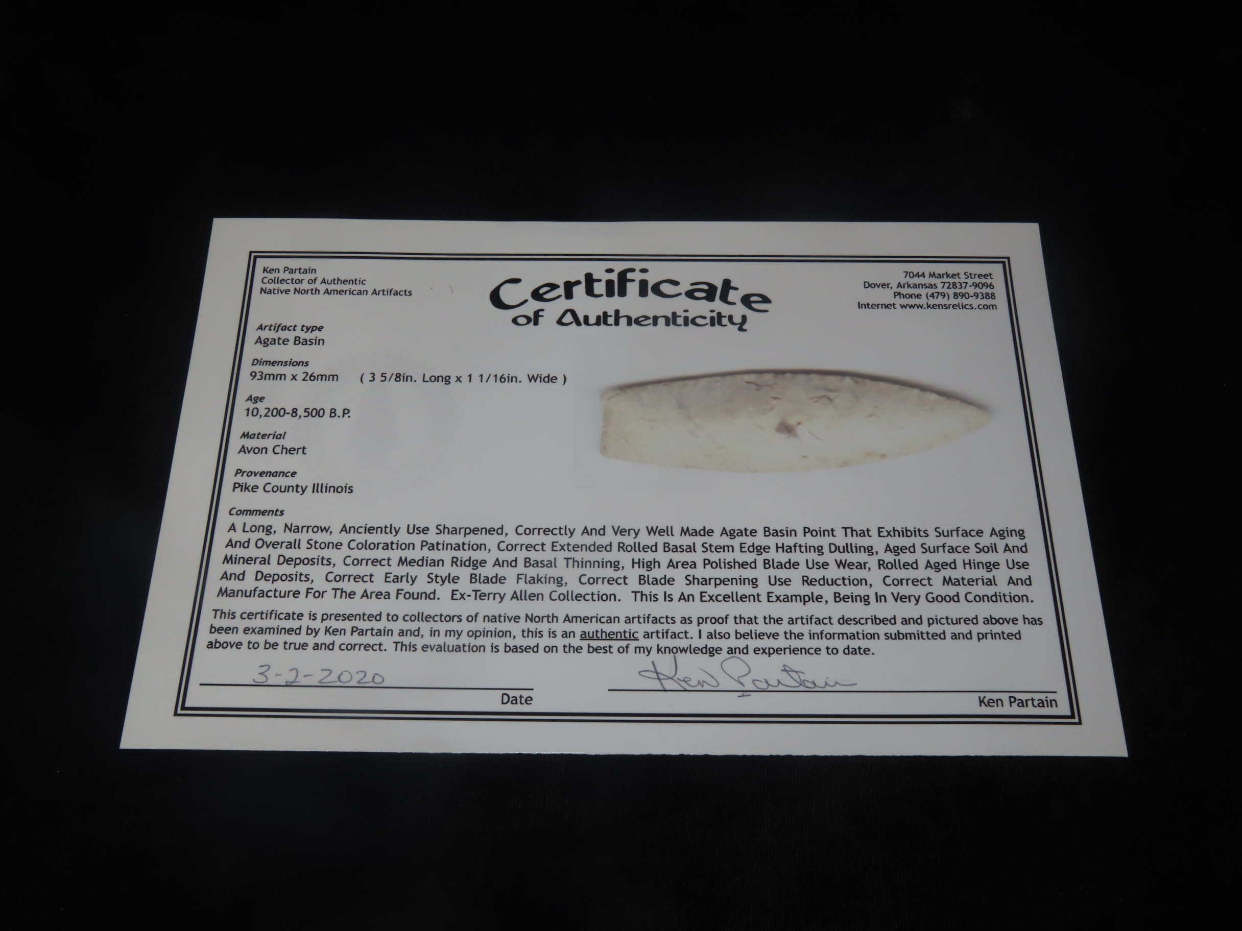 3 5/8" X 1 1/16" Agate Basin, Partain COA, Found in Pike County IL.