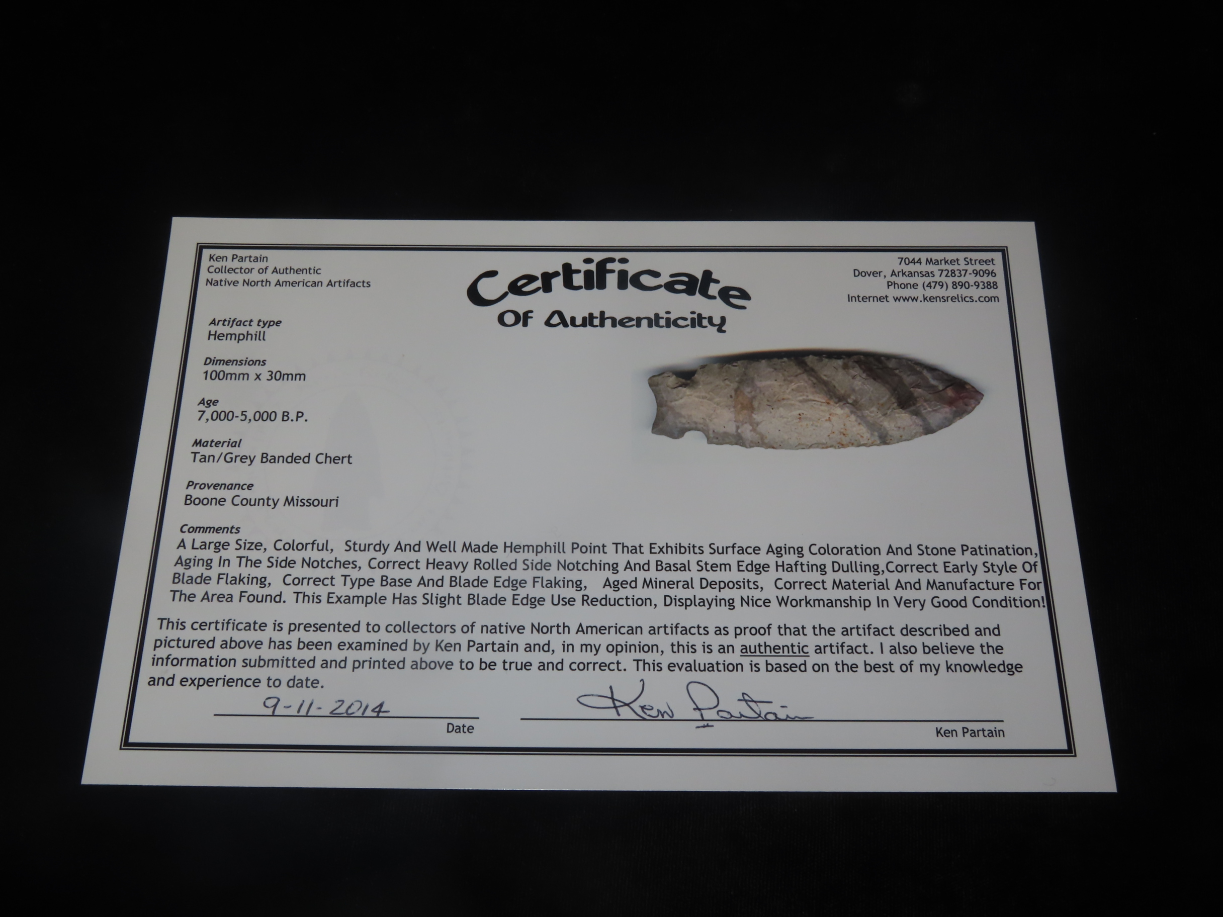3 15/16″ X 1 3/16″ Hemphill, Partain COA, Found in Boone County MO.