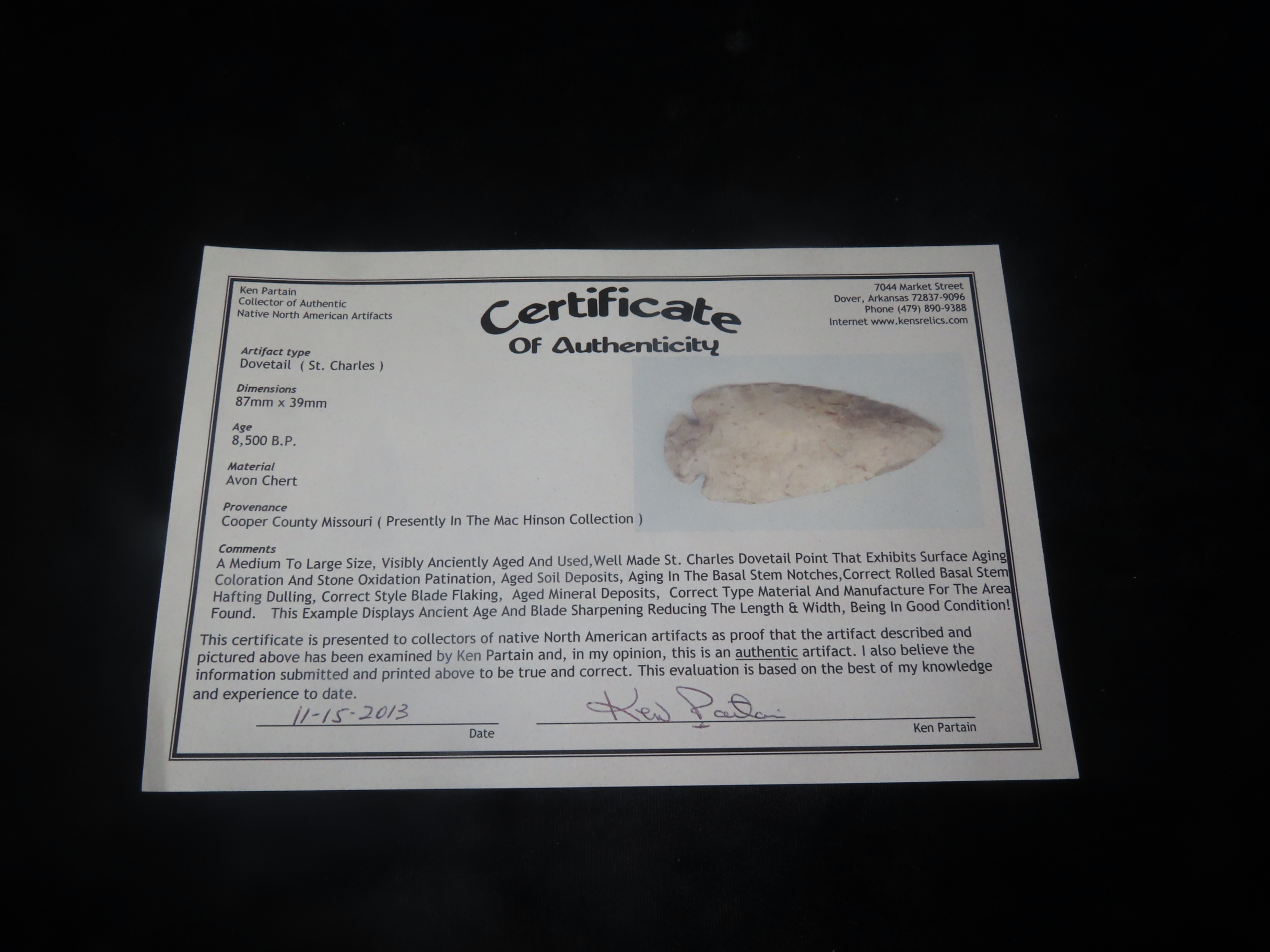 3 7/16″ X 1 1/2″ Dovetail, Partain COA, Found in Cooper County MO.