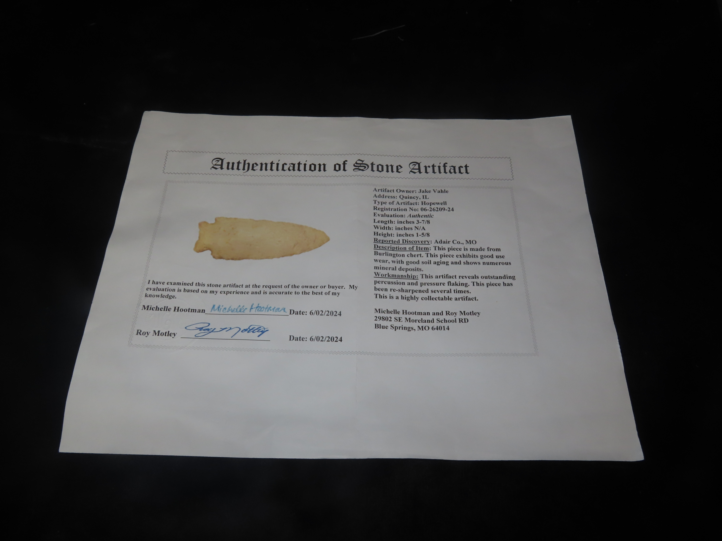 3 7/8″ X 1 5/8″ Hopewll, Burlington Chert, Motley COA, Found in Adair Co MO
