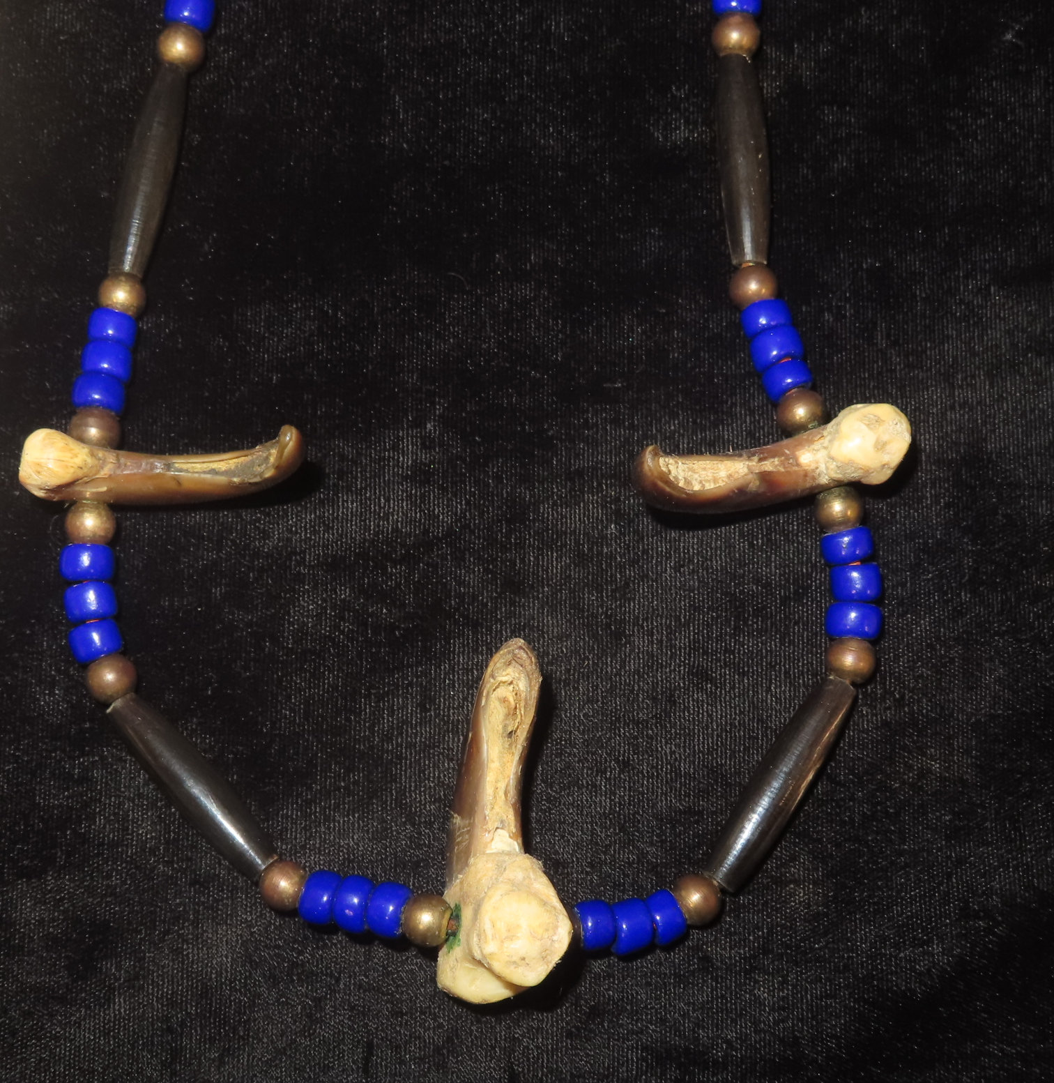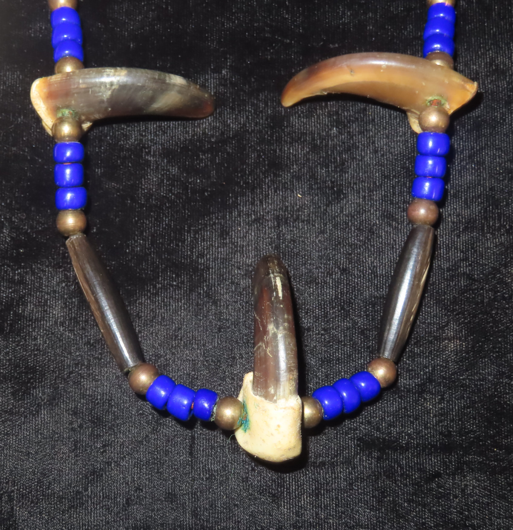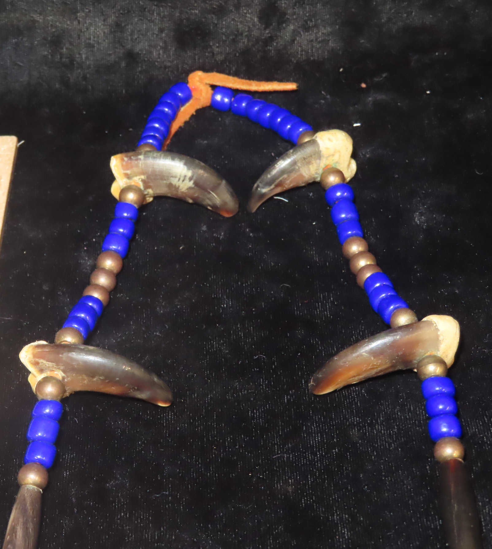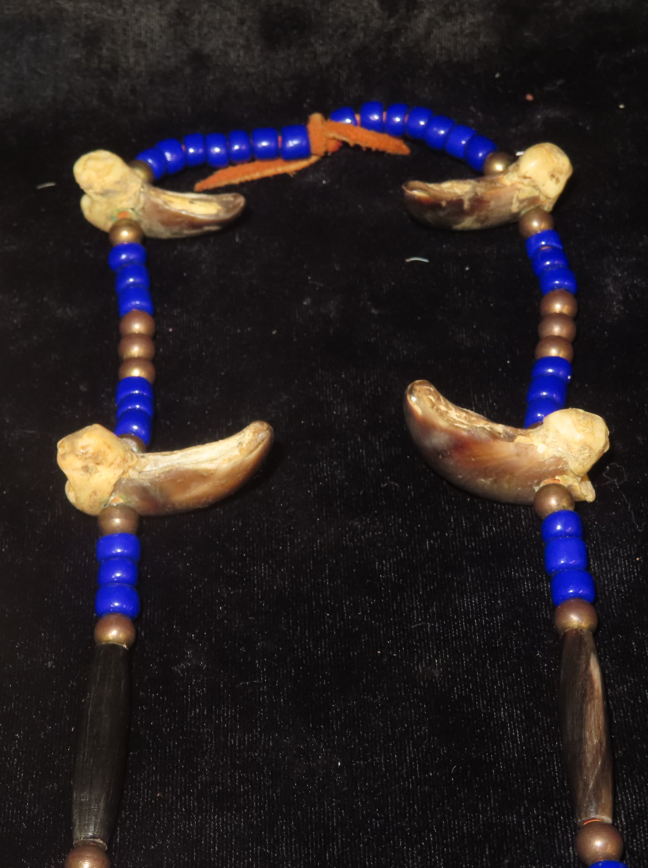20″ Bear Claw Necklace strung with Blue Trade Beads and Brass Spacer Beads, all on a leather thong.