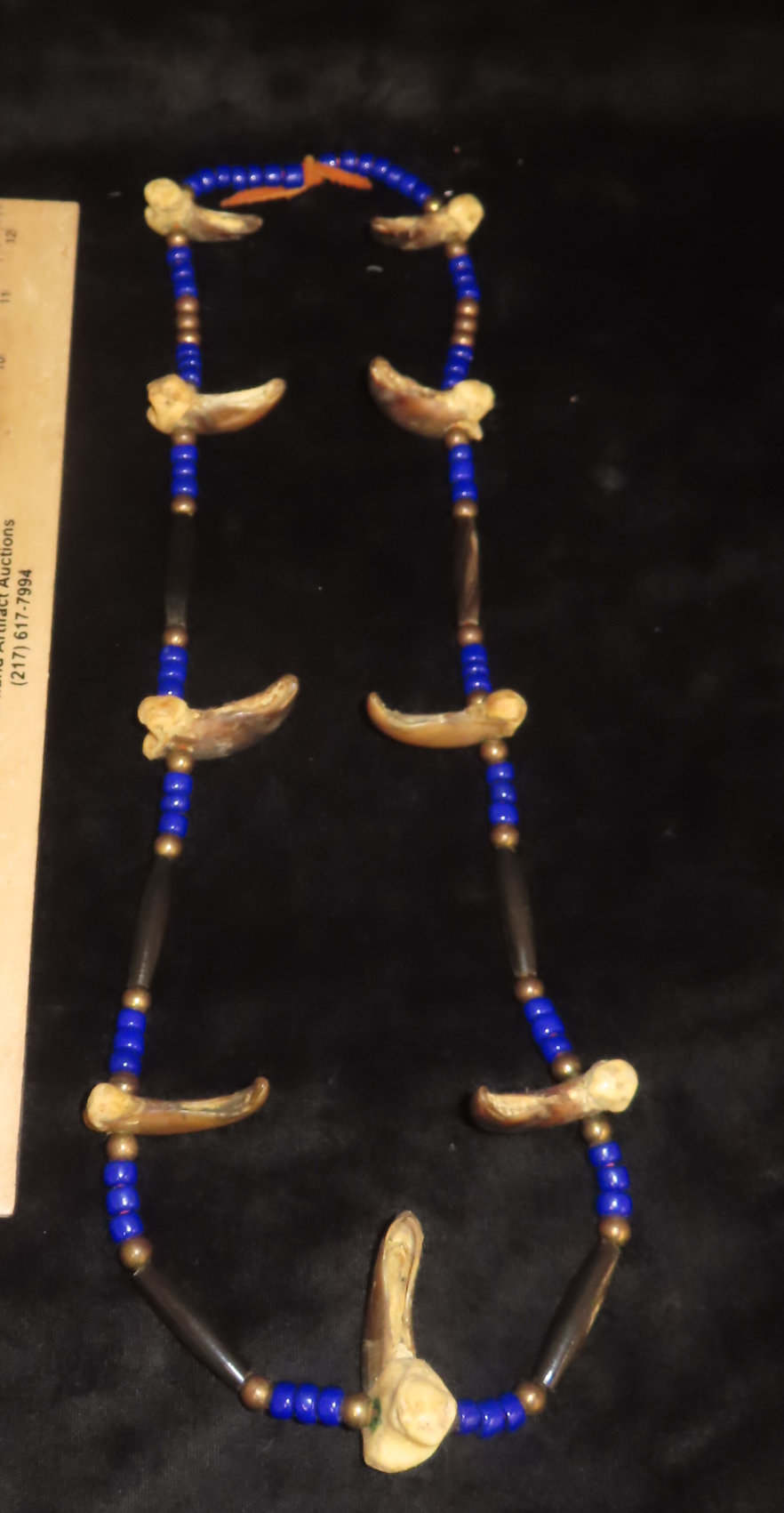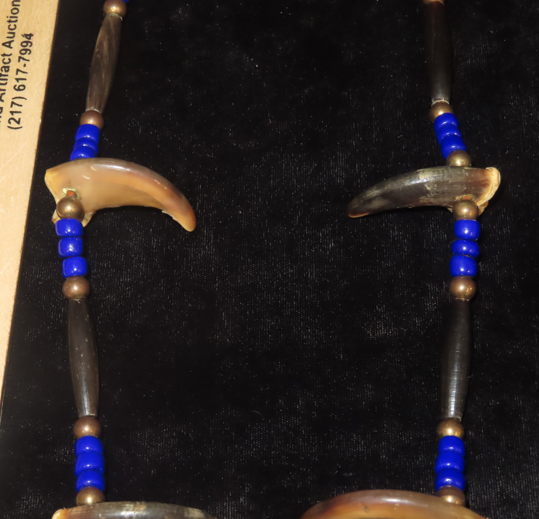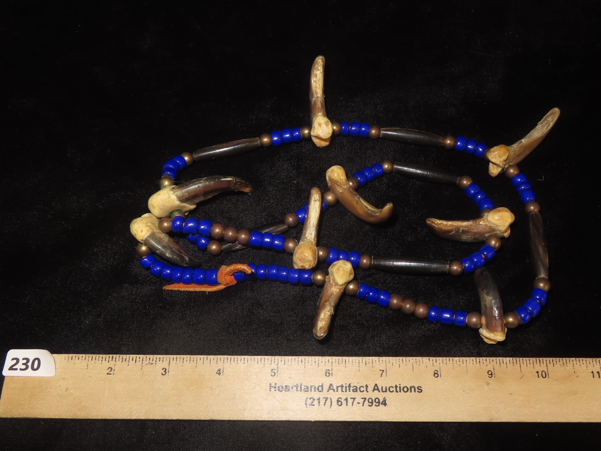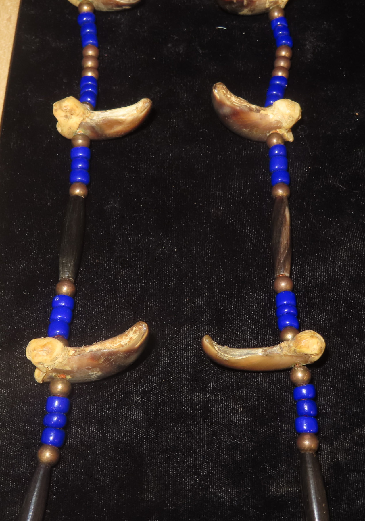 20″ Bear Claw Necklace strung with Blue Trade Beads and Brass Spacer Beads, all on a leather thong.