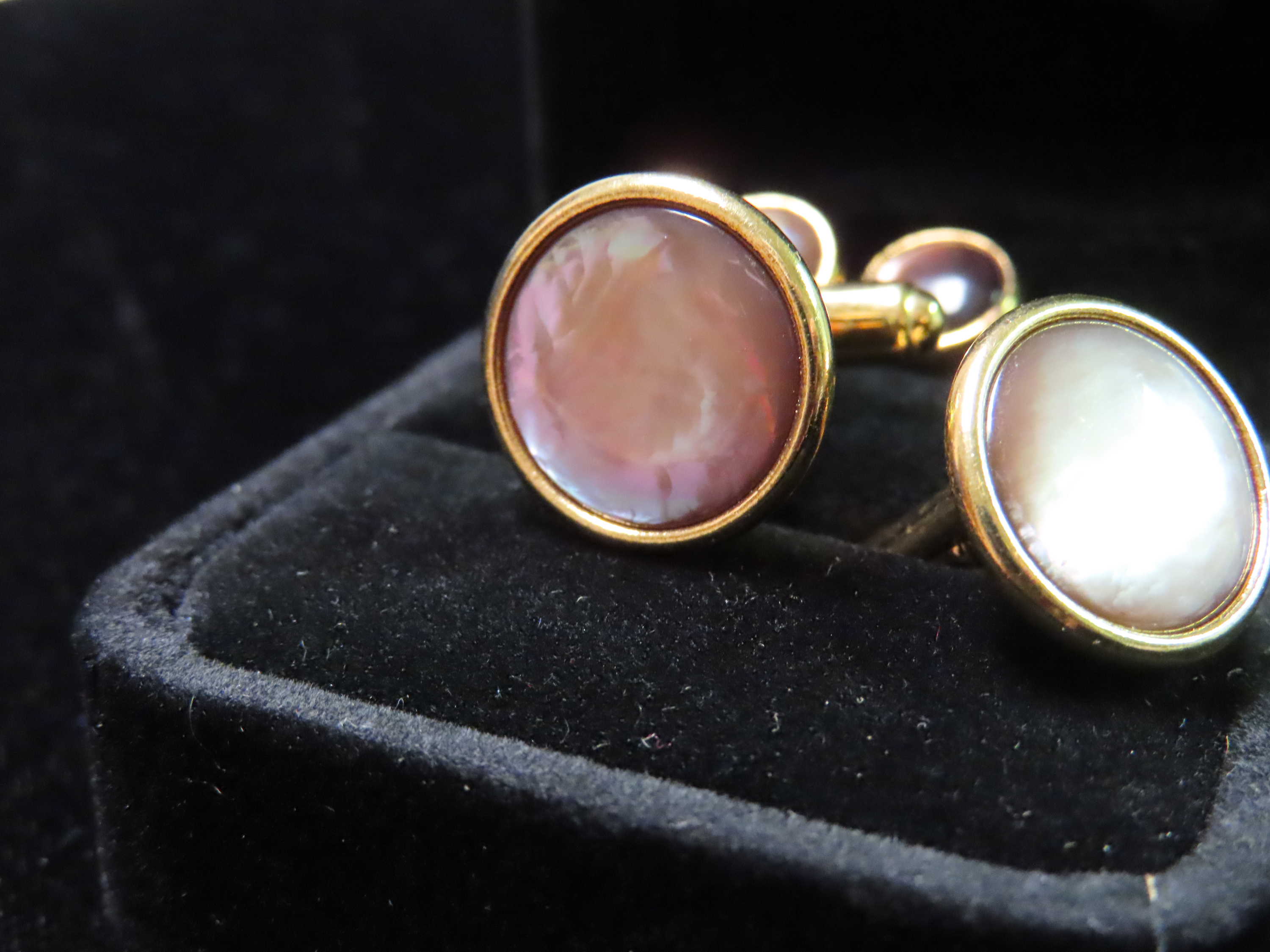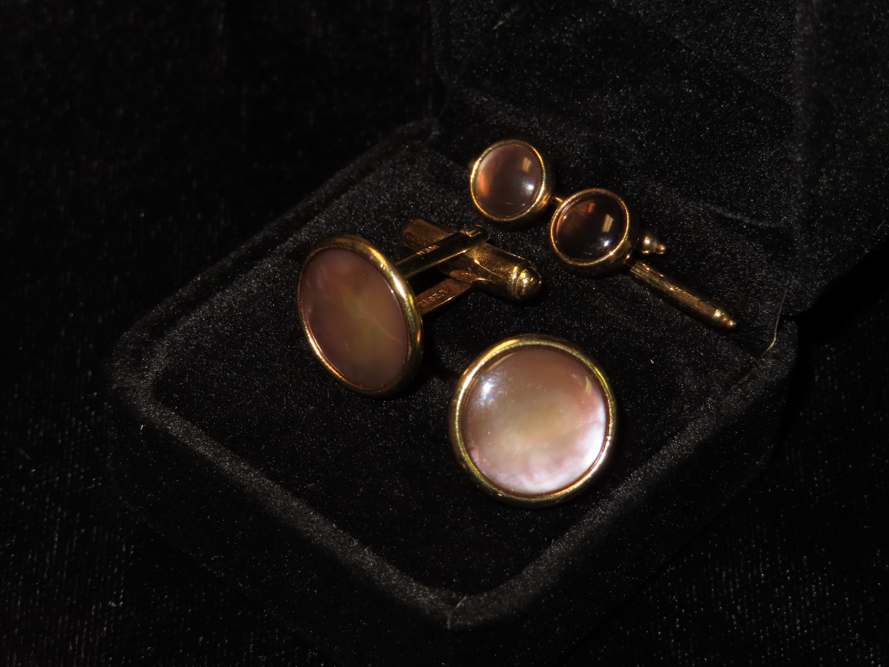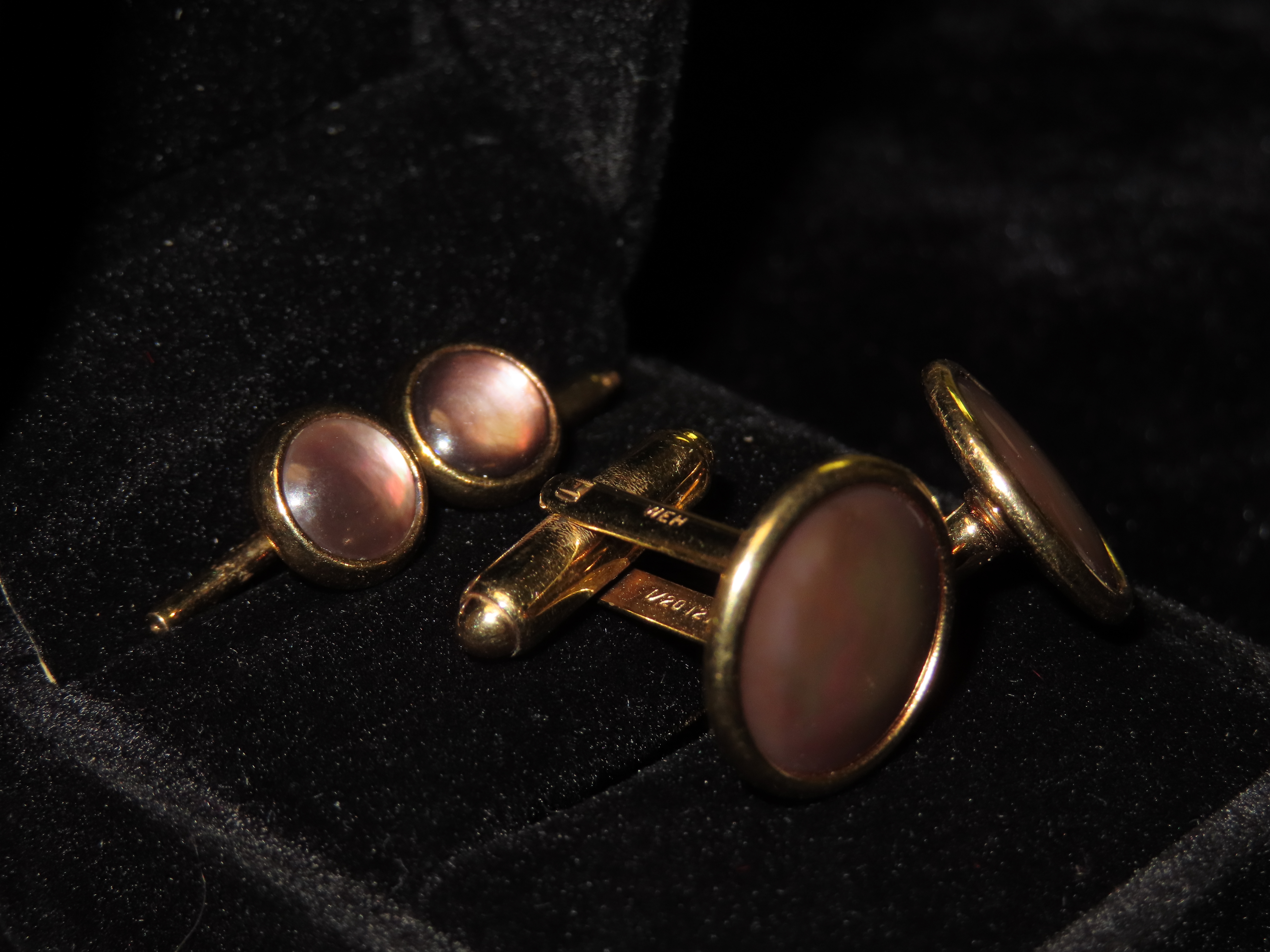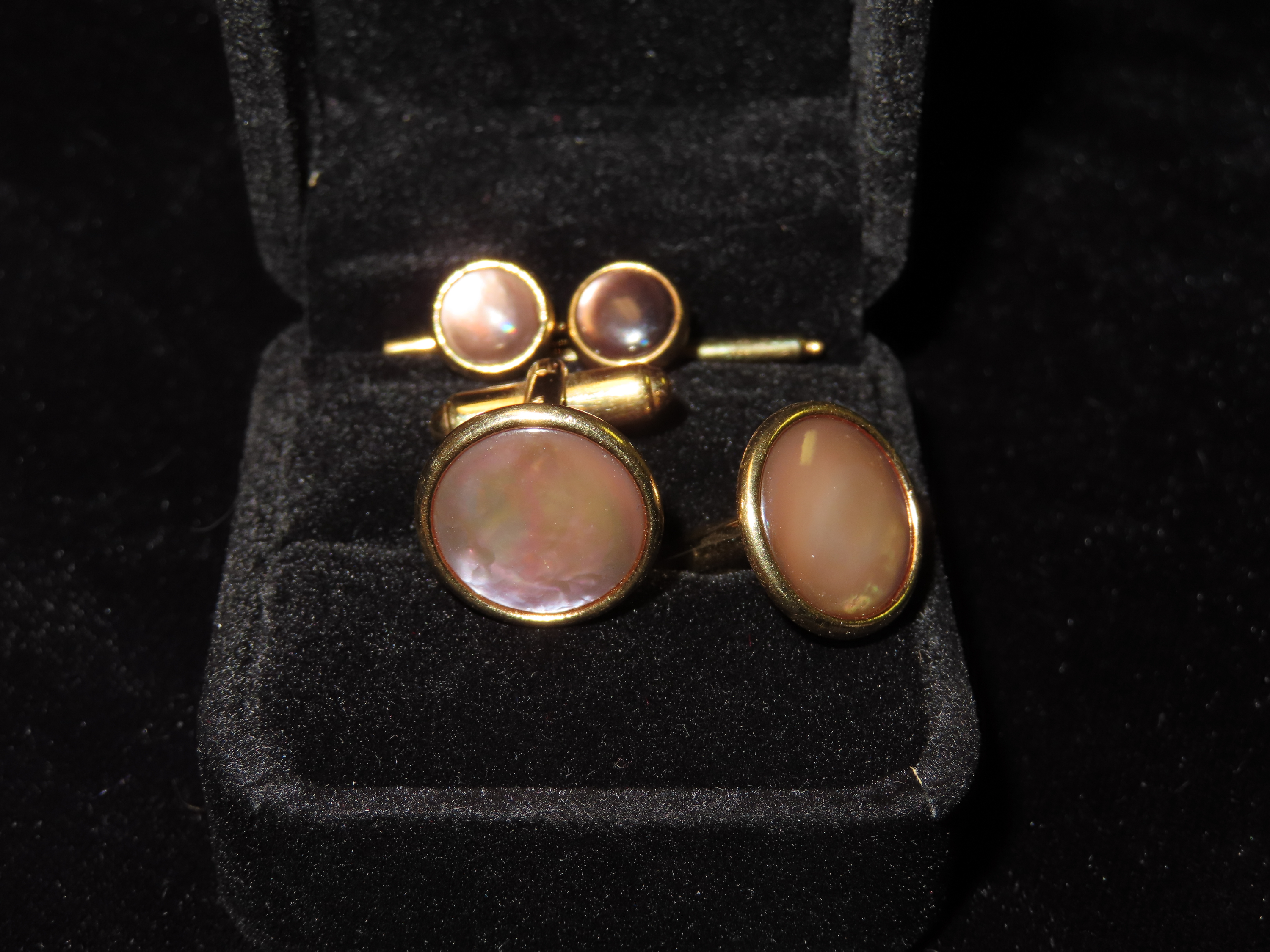 Vintage Mother of Pearl Cufflinks, with Matching Button Studs, made by Walter E Hayward Co., Attleboro, Massachusetts, Marked 1/20 12K G.F., over Sterling Silver