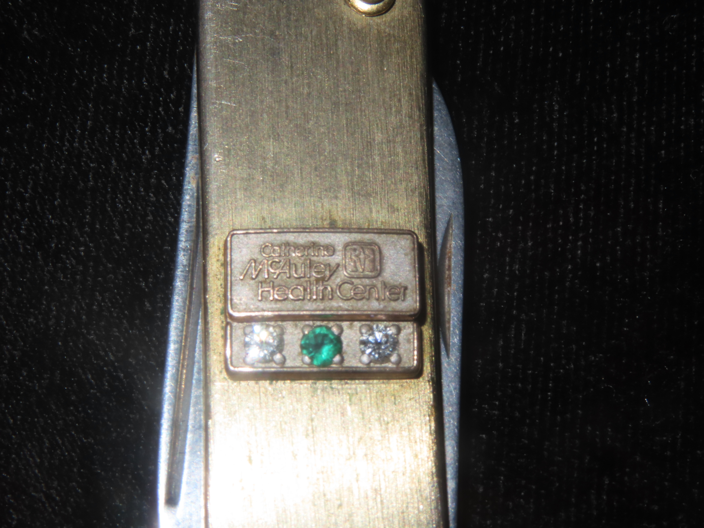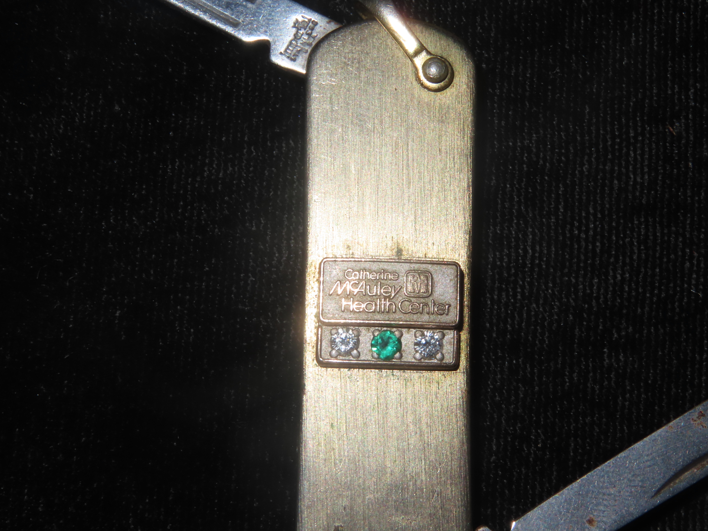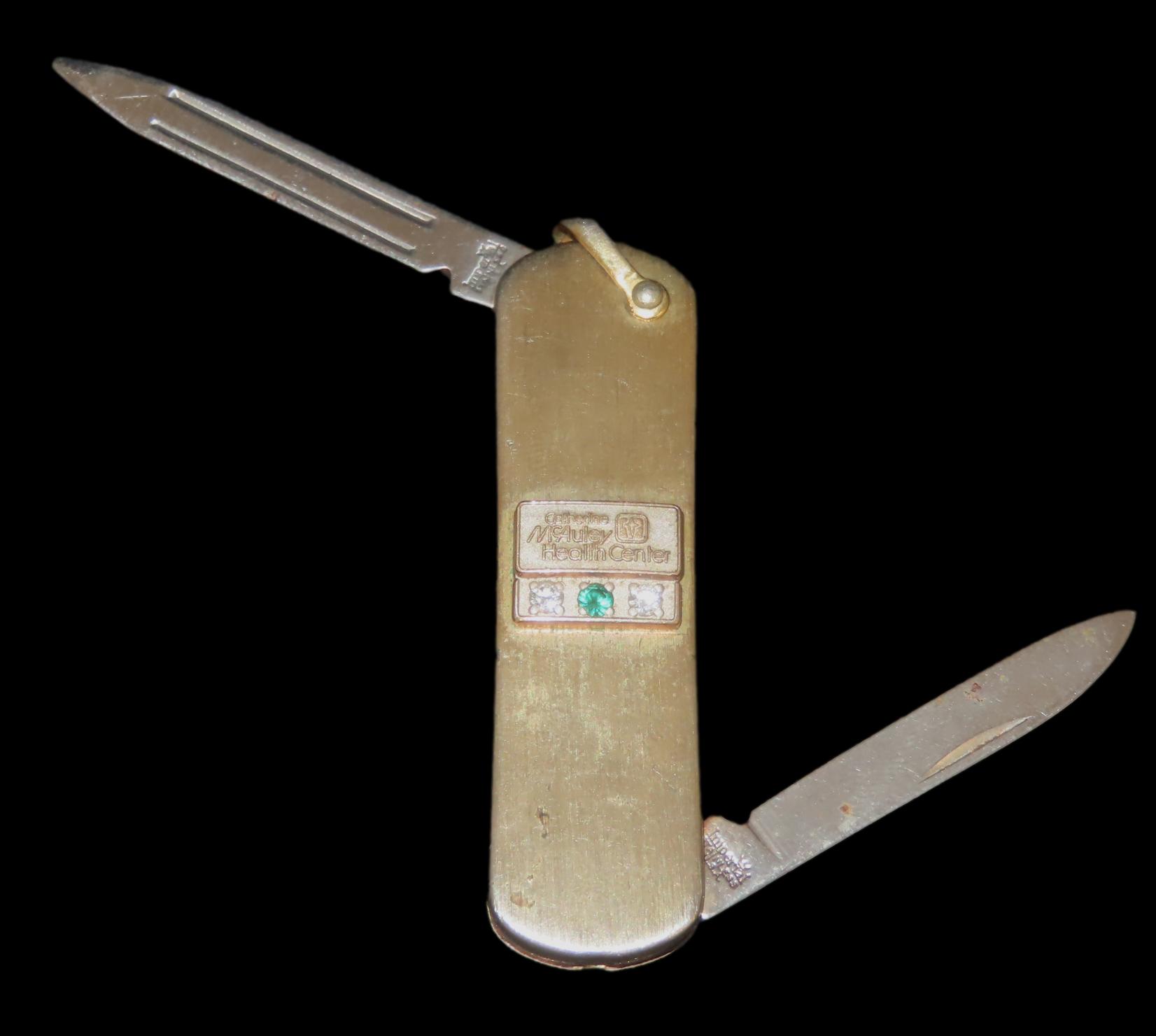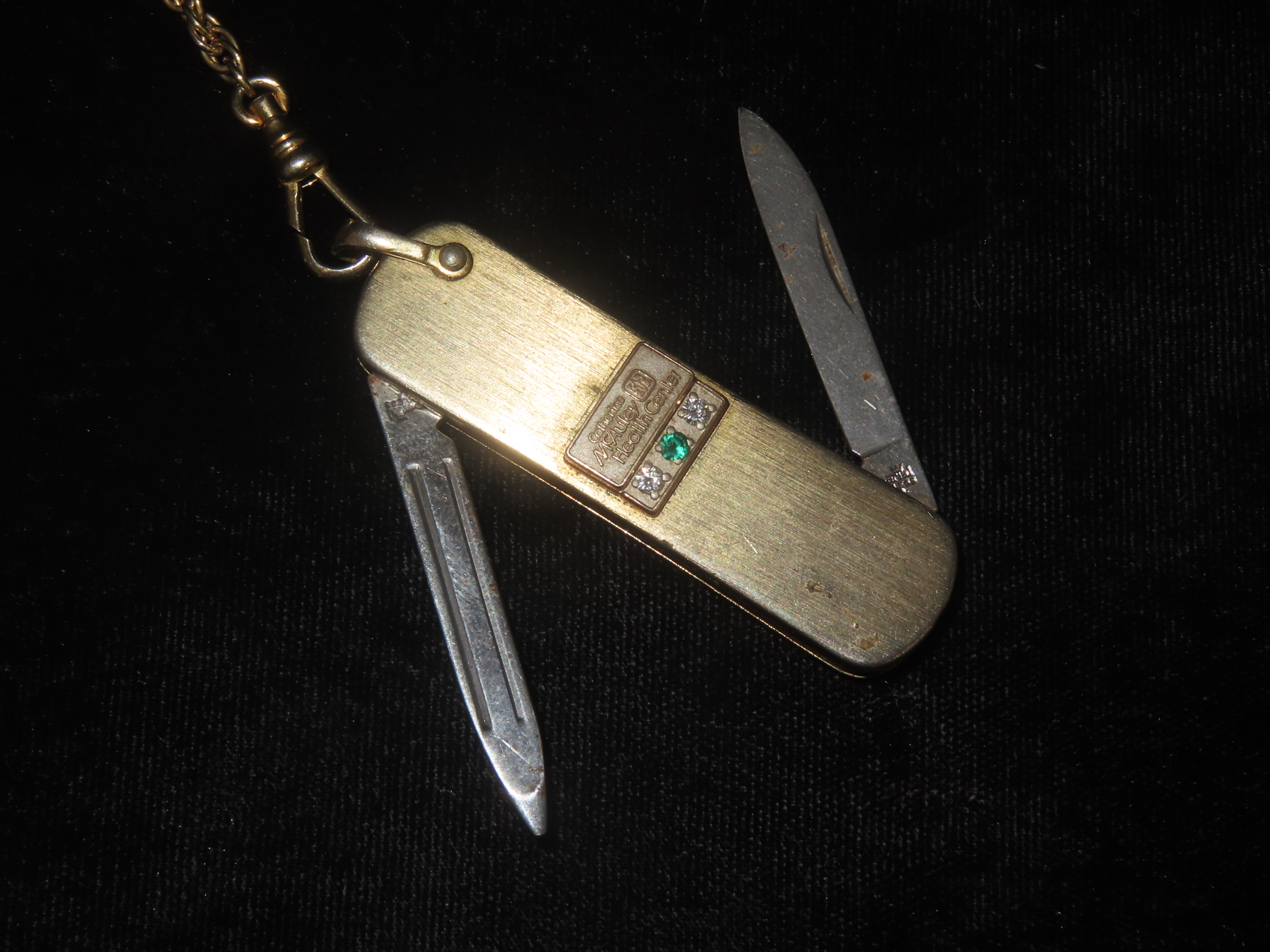 Vintage Service Award Watch Fob Pocket Knife/Nail File, on Chain, with 2 Diamonds & 1 Emerald, Presented by Catherine McAuley Health Center. Made by Imperial Stainless, USA