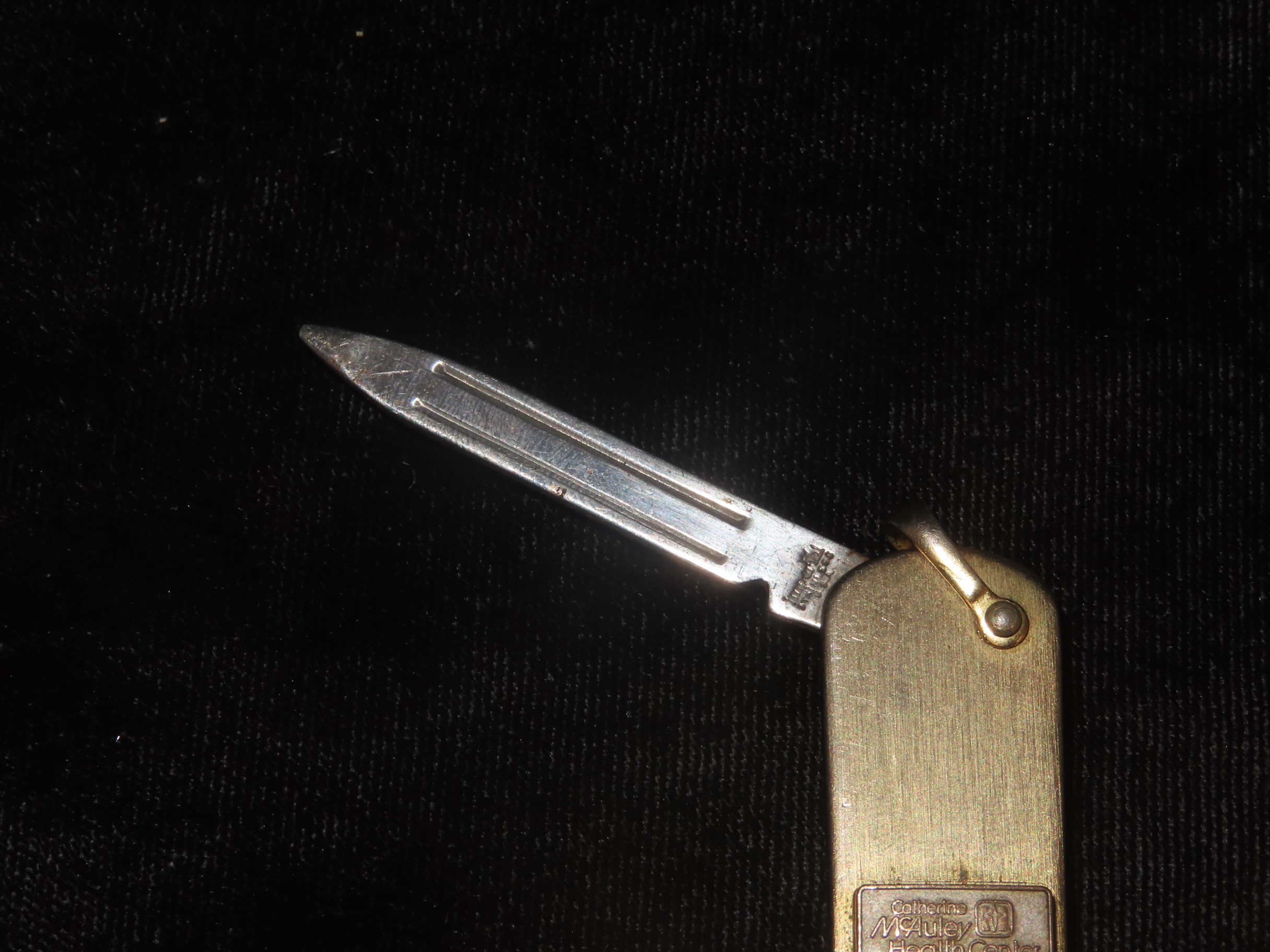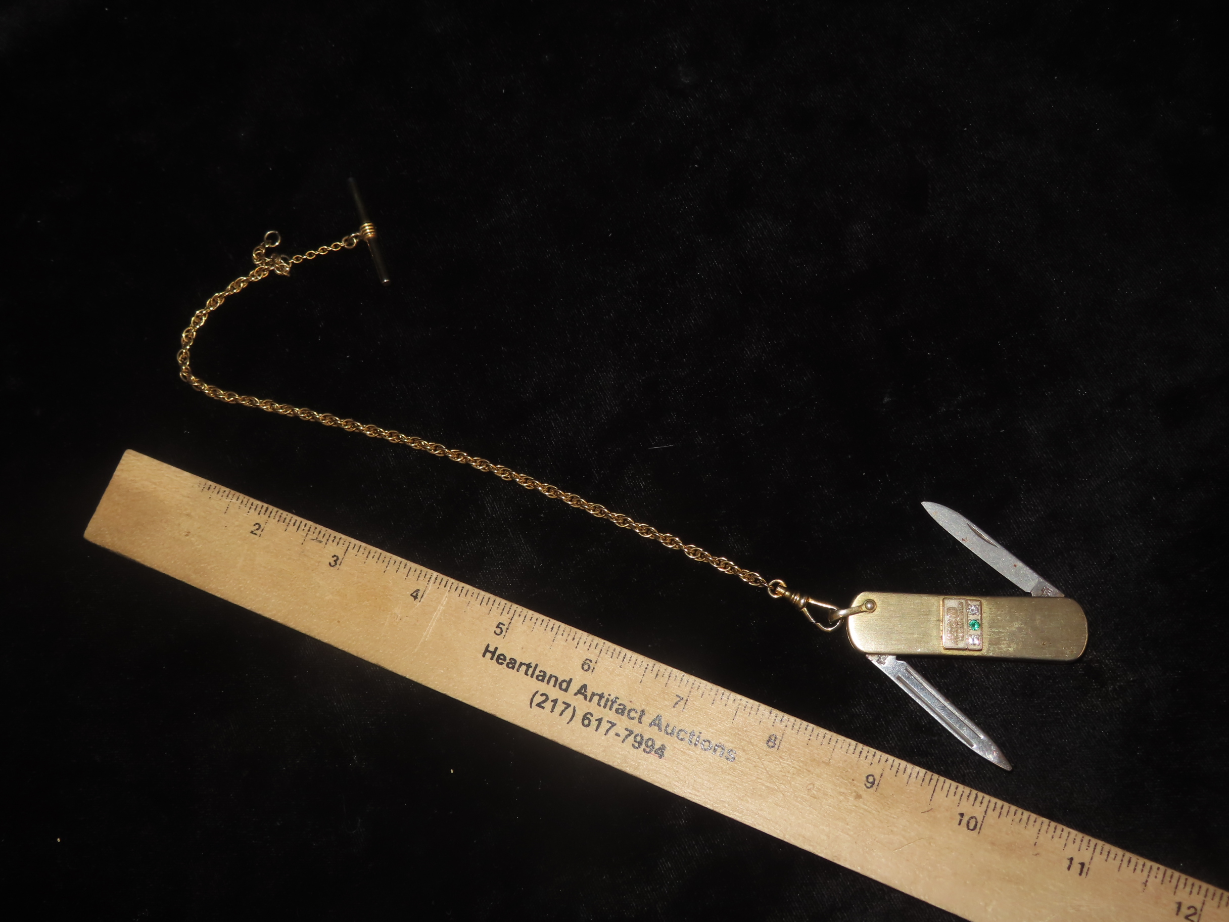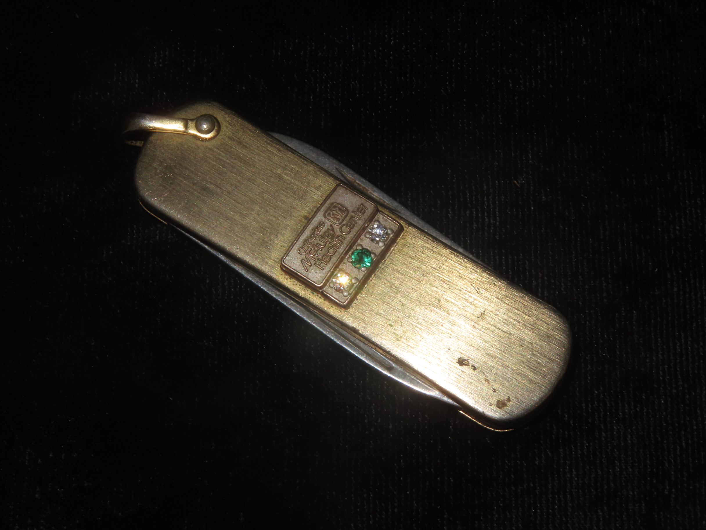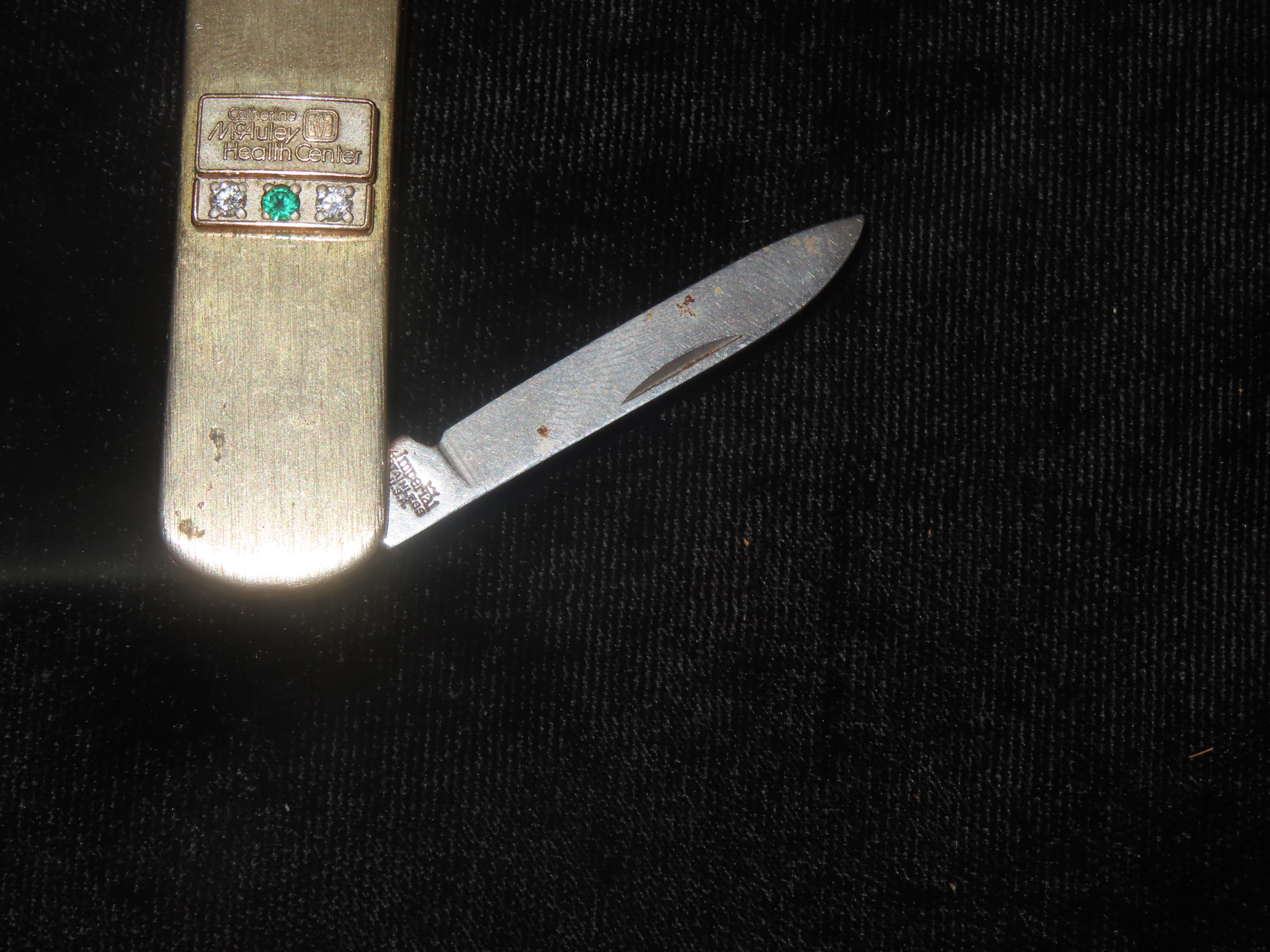 Vintage Service Award Watch Fob Pocket Knife/Nail File, on Chain, with 2 Diamonds & 1 Emerald, Presented by Catherine McAuley Health Center. Made by Imperial Stainless, USA
