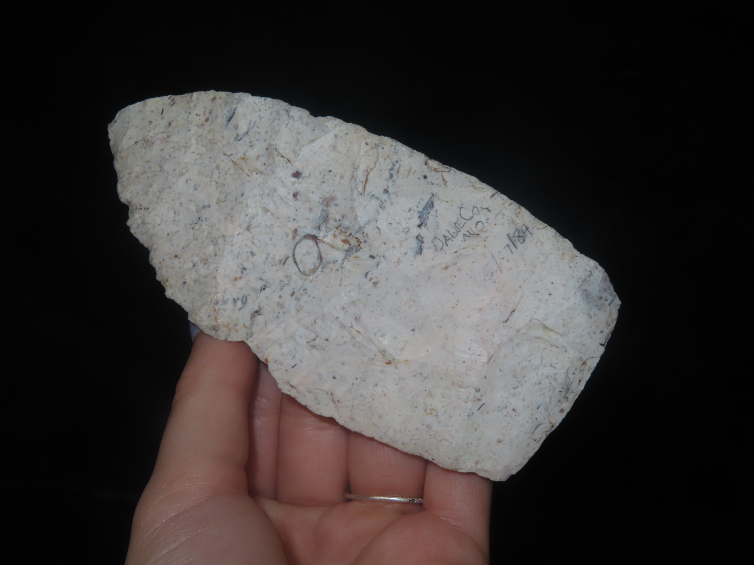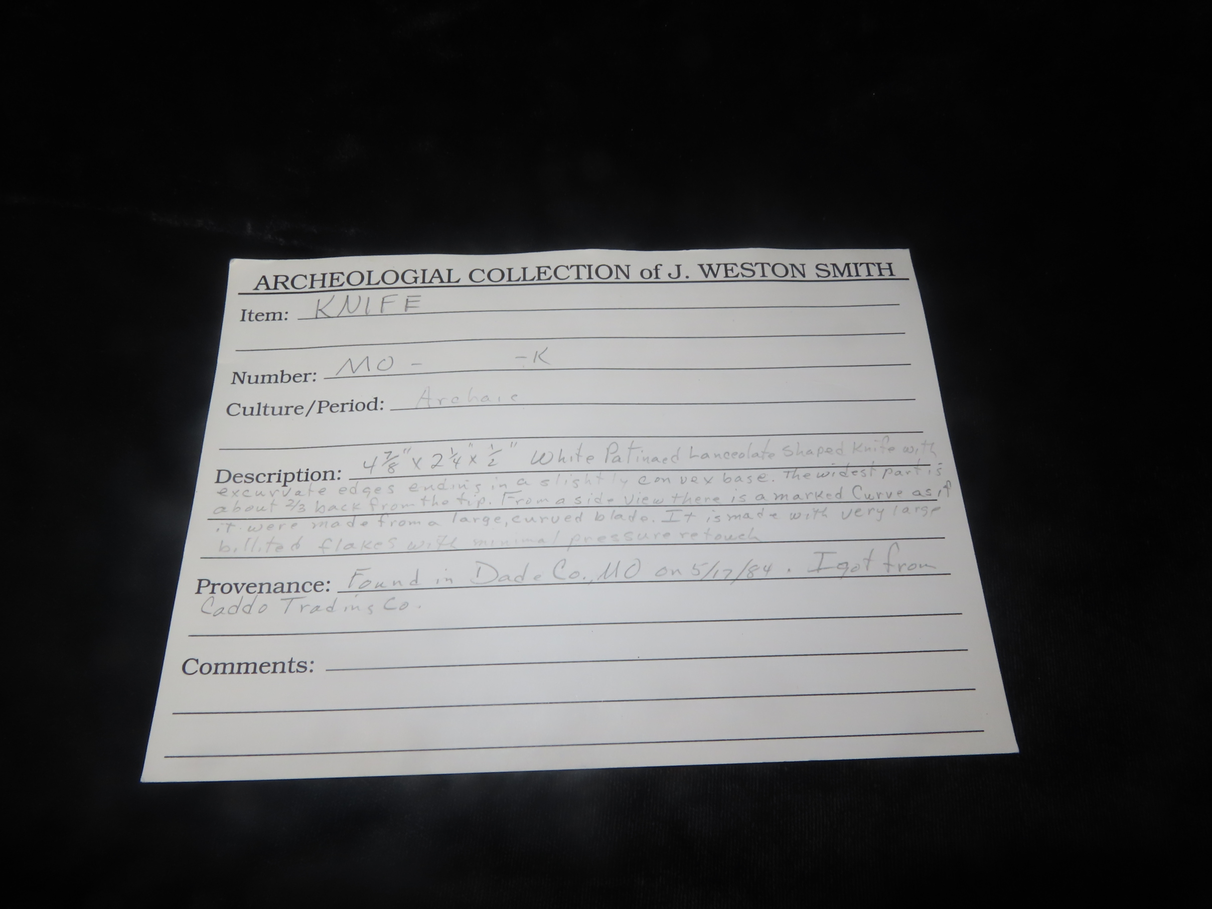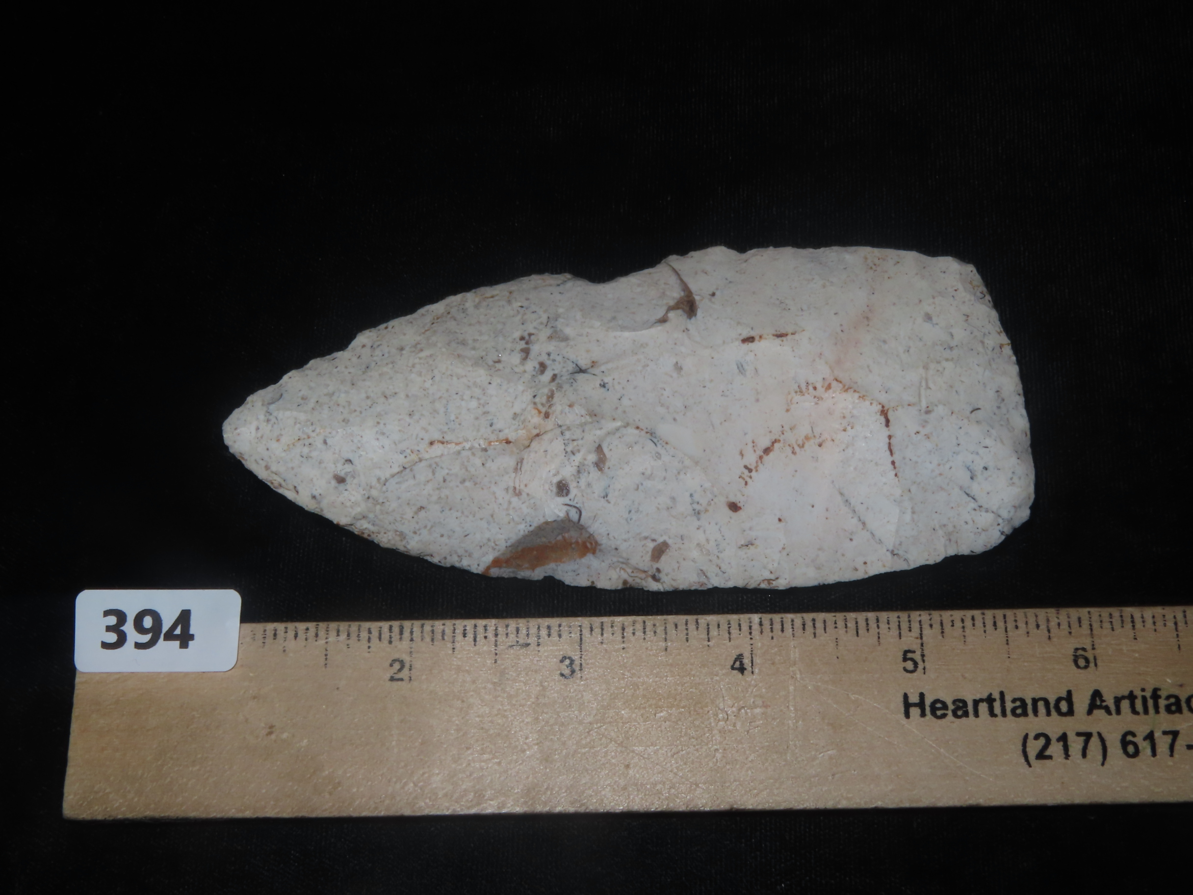 4 7/8″ X 2 1/4″ x 1/2″ Knife, White Patinaed Lanceolate, Found in Dade Co MO