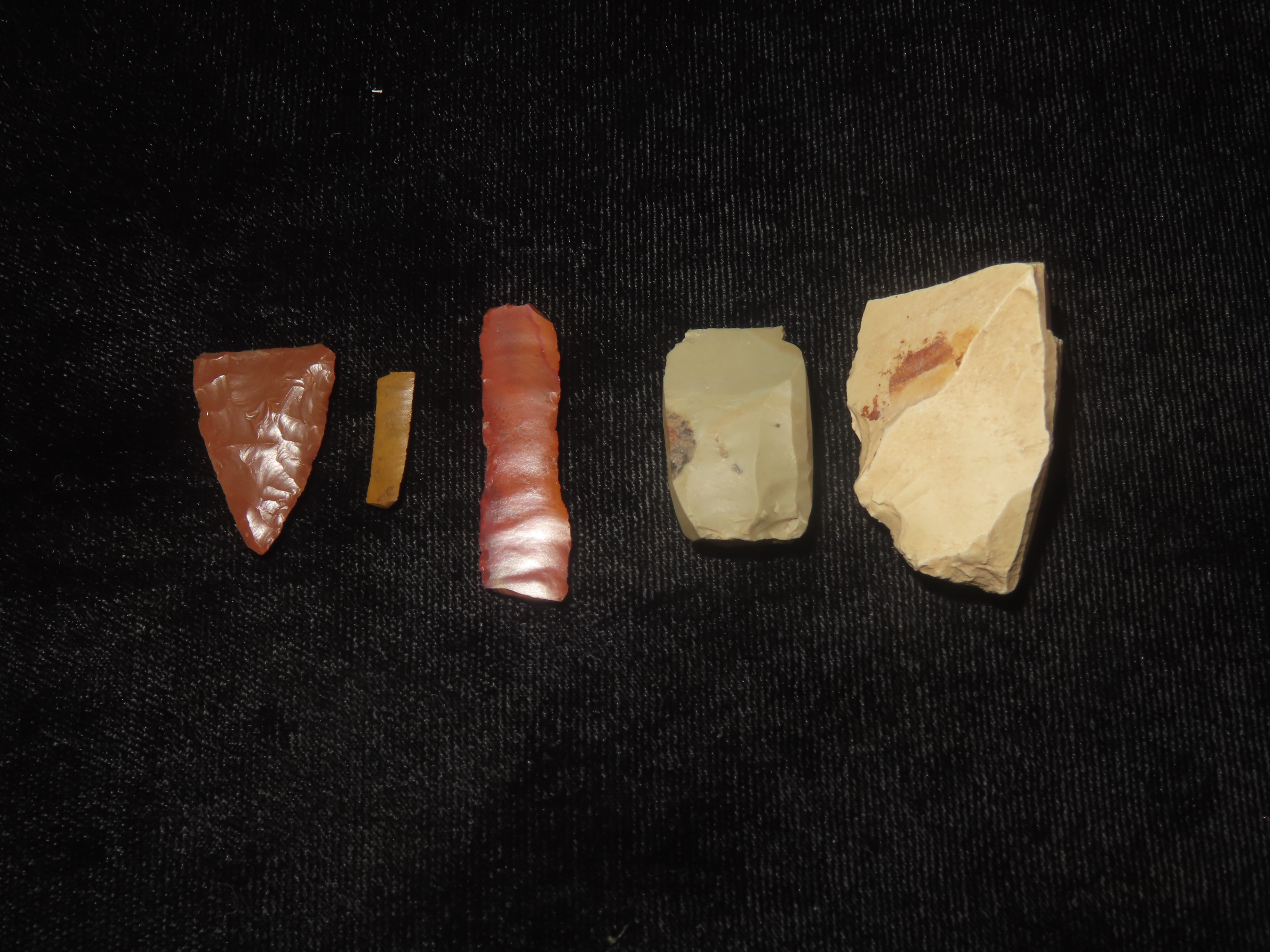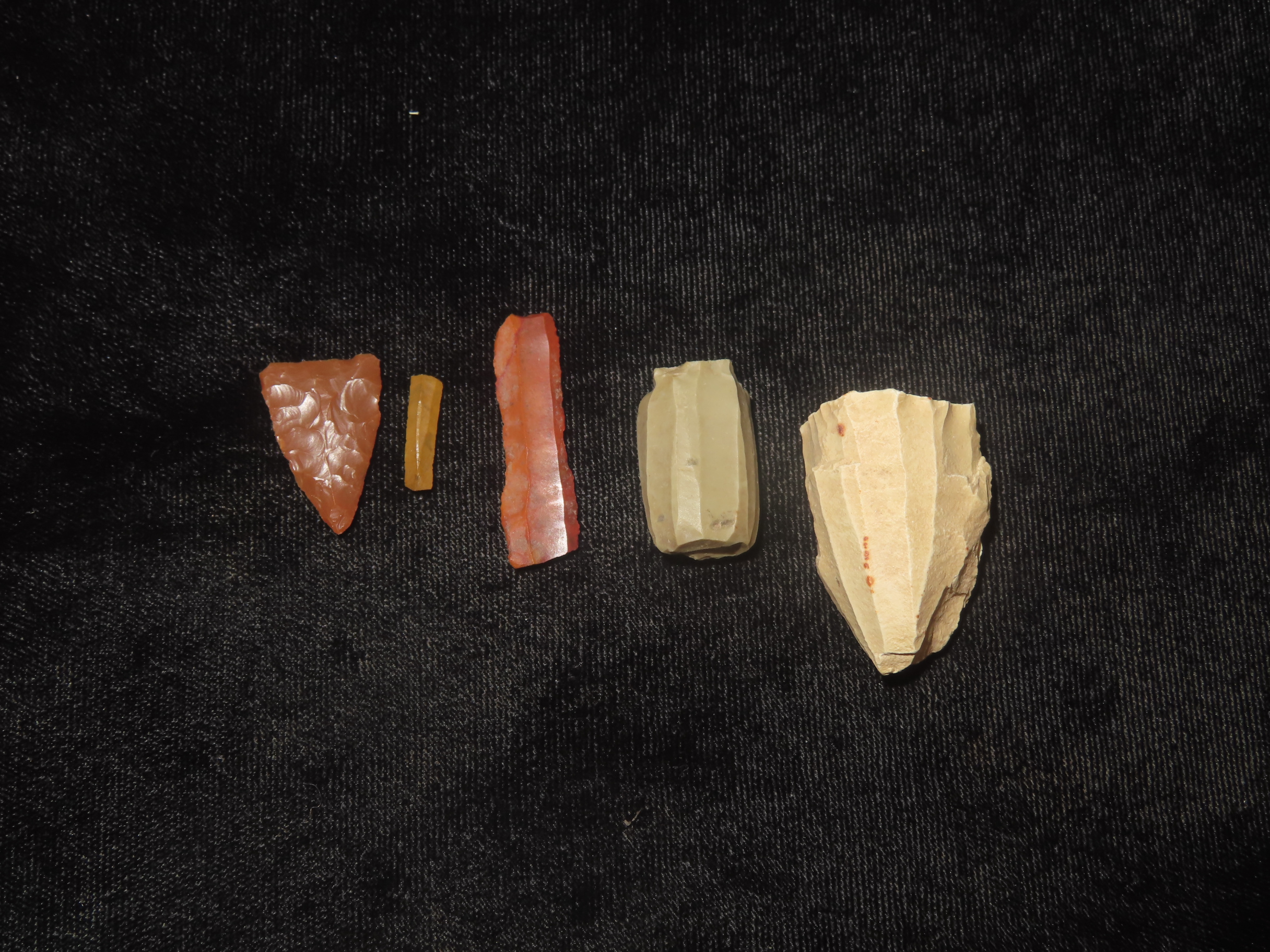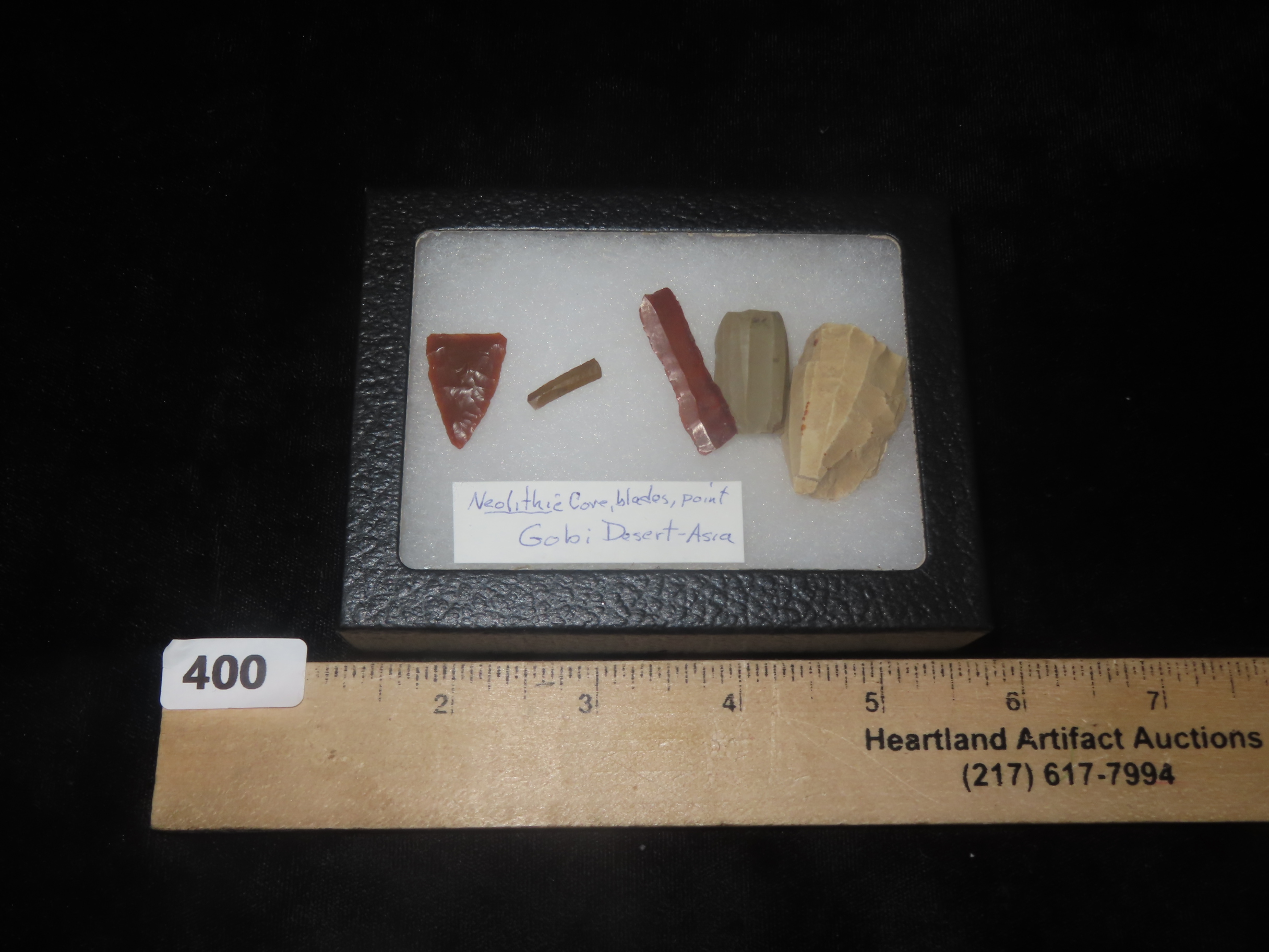 Micro Truncated Core, Blade and Arrowhead set, 5 piece, Jasper, Agate, Grey Chert. Neolithic, Gobi Desert Asia