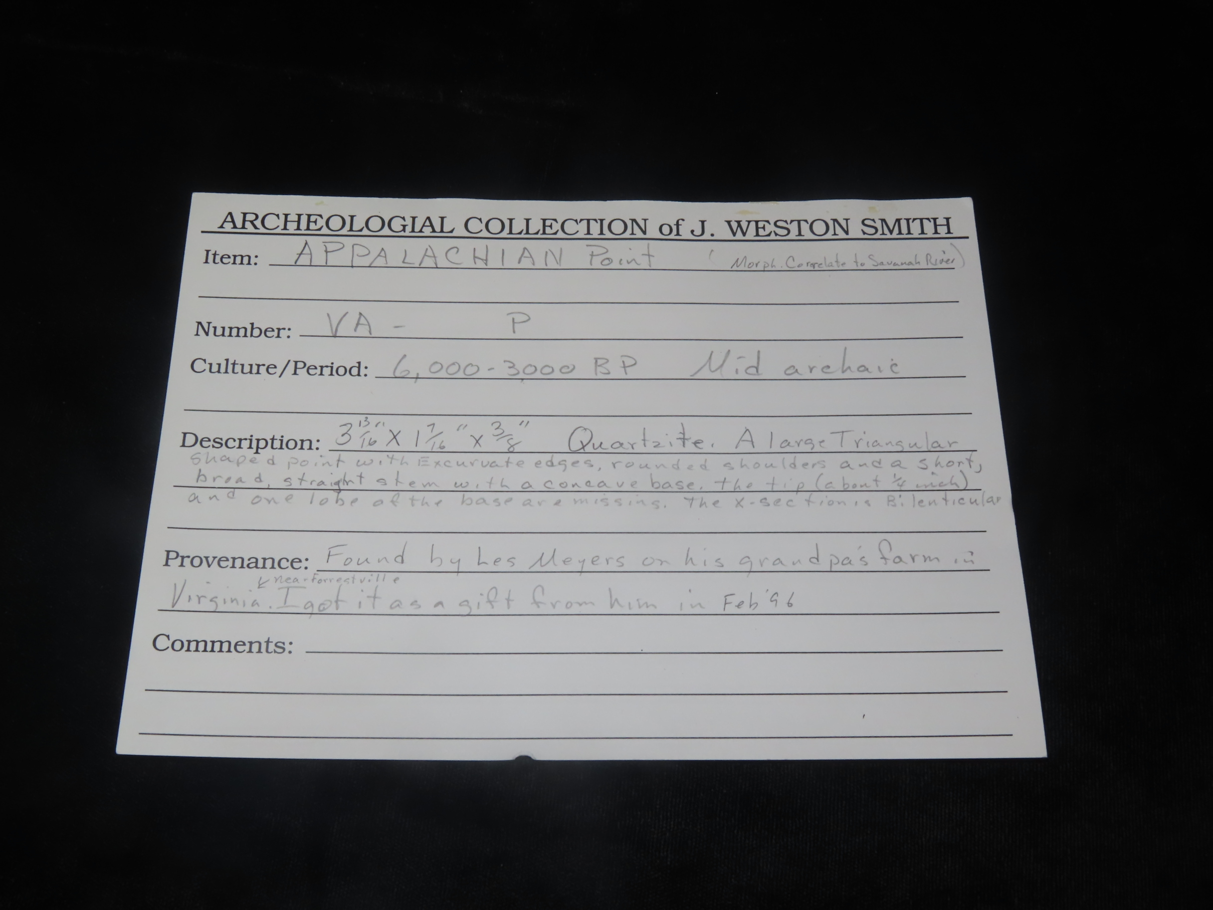 3 3/16″ X 1 7/16″ X 3/8″ Quartzite Appalachian Point, Found by Les Myers Near Forestville Virginia