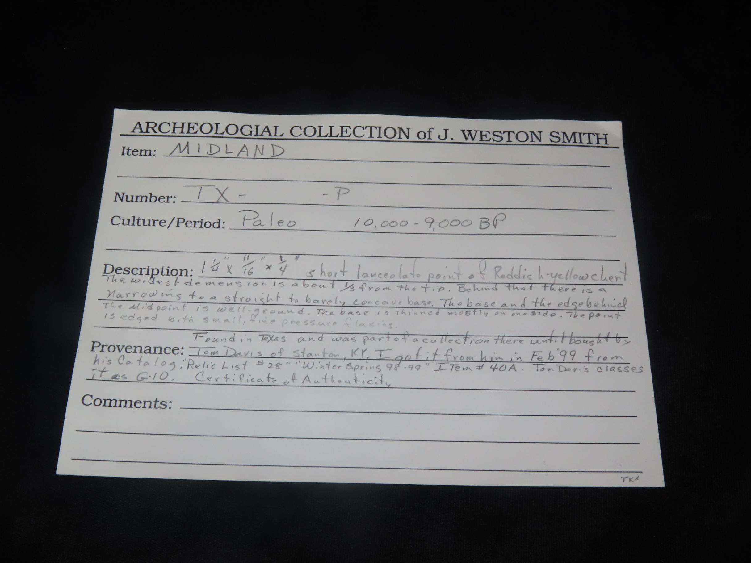 1 1/4″ X 11/16″ Paleo Midland Point, Found in Stanton Kentucky
