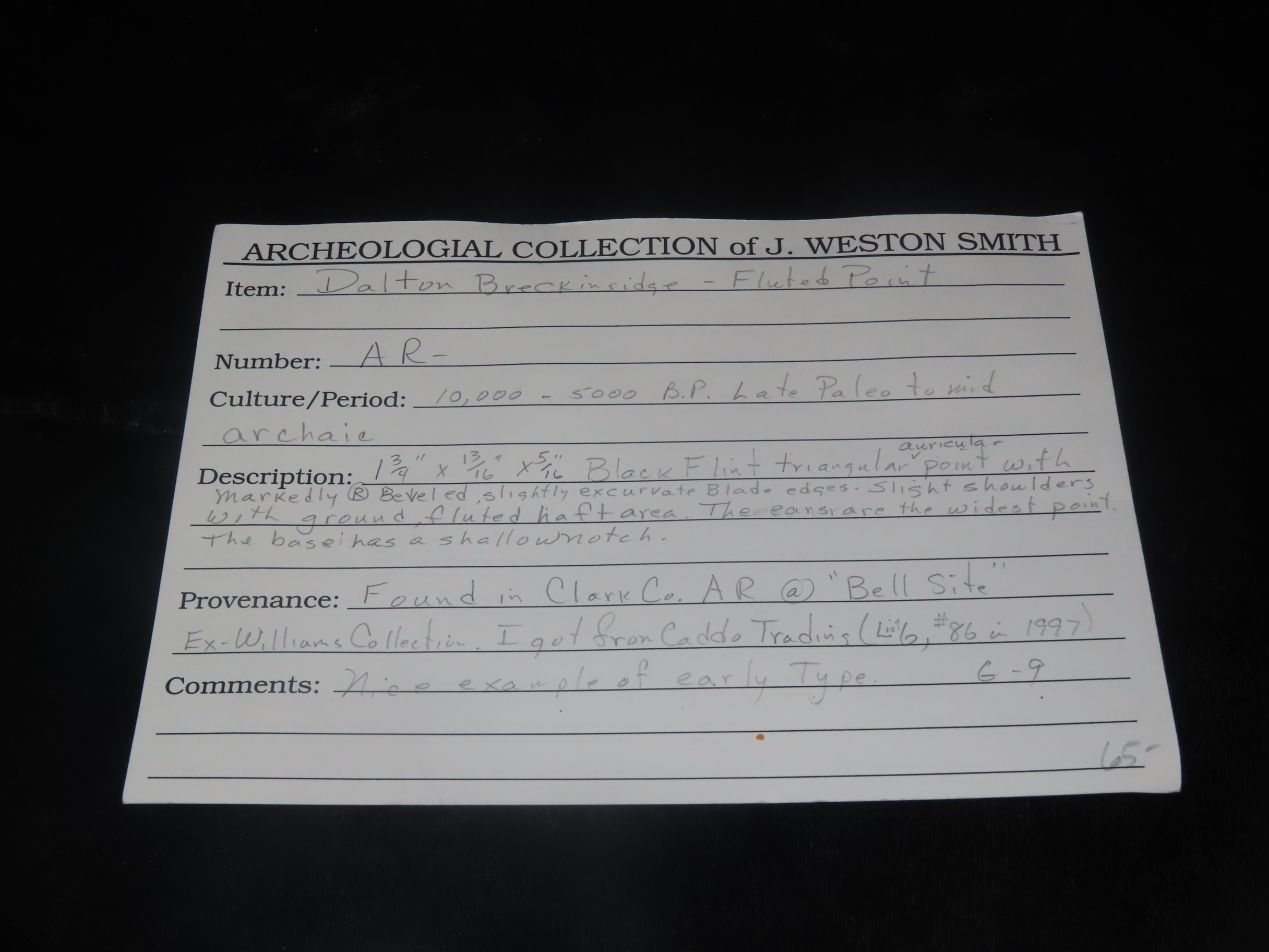 1 3/4″ X 13/16″ Dalton Breckinridge Fluted Point, Found in Clark County Arkansas, Bell Site