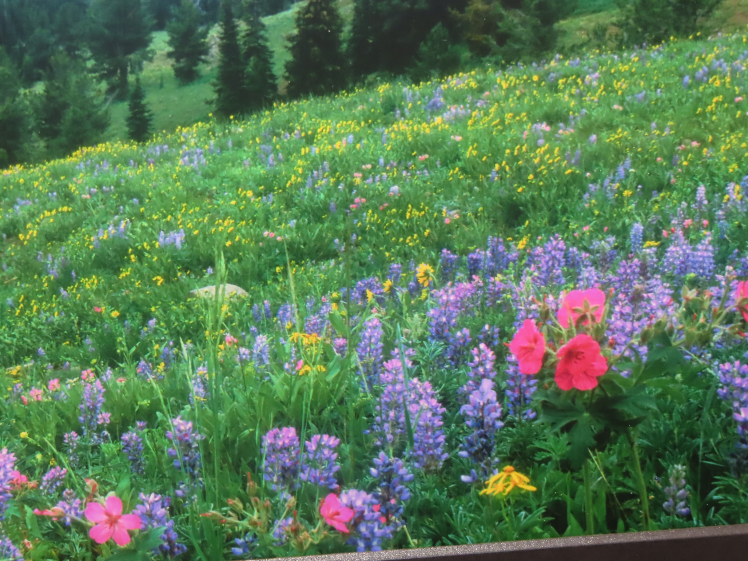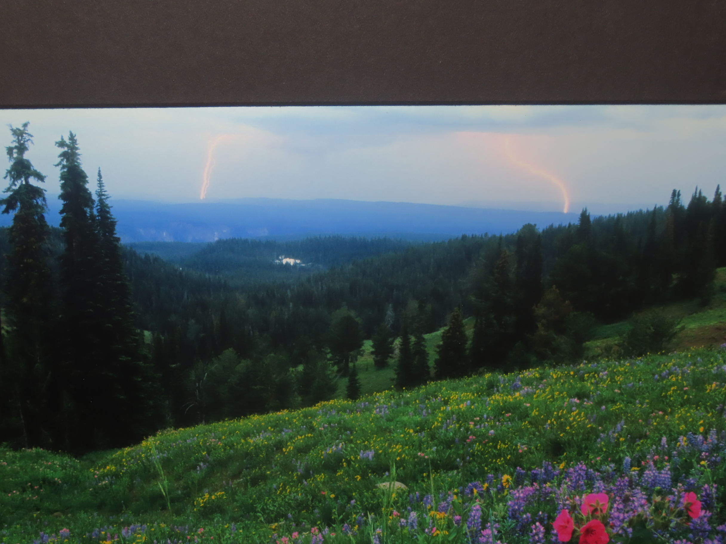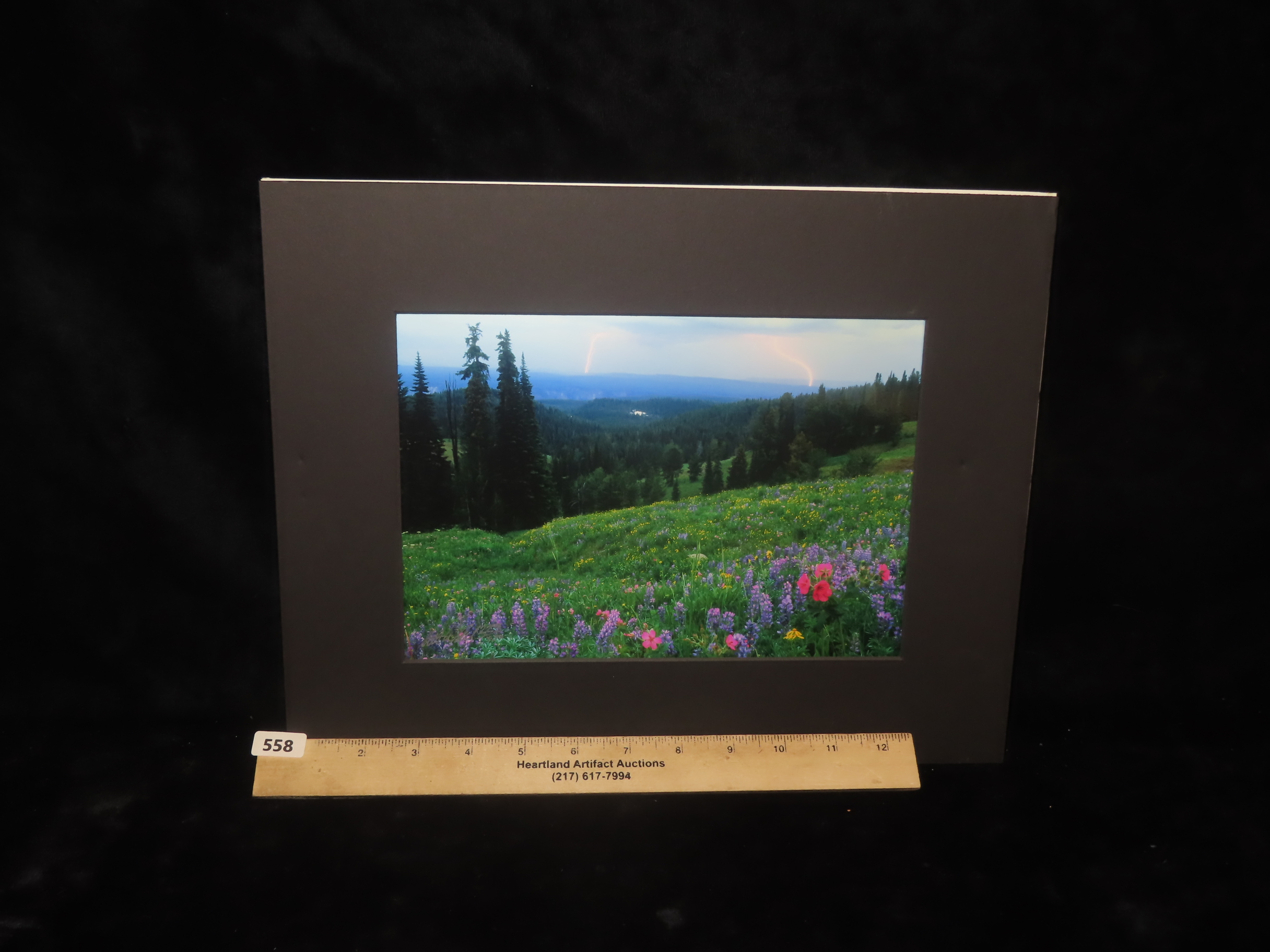 14″ x 11″ Scott Wheeler Original Photo, titled “Yellowstone Storm”- Beautiful brightly colored meadow flowers in the foreground, framed by pines, while double lightening strikes touch down in the distance. Stunning artwork, showcasing a hard to capture act of nature.
