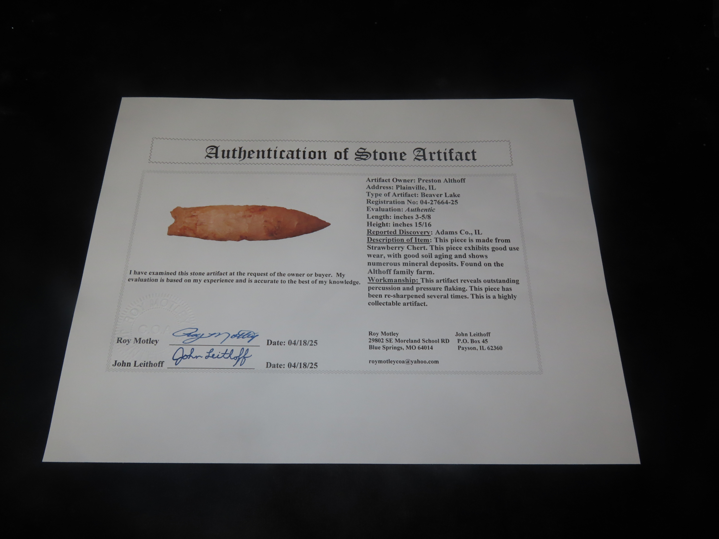 3 5/8″ X 15/16″ Beaver Lake, Motley COA, Found in Adams County IL.