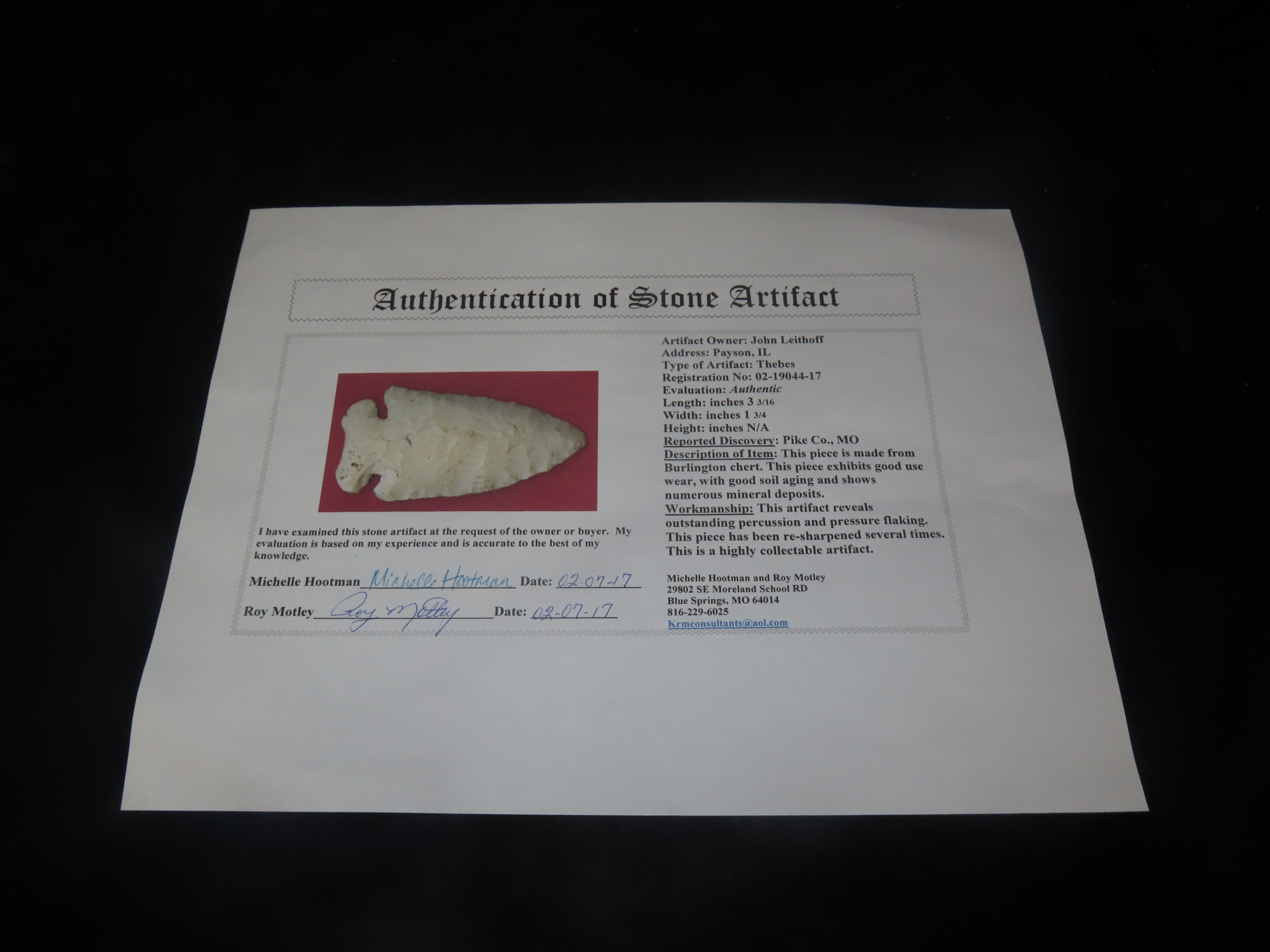 3 3/16″ X 1 3/4″ Thebes, Motley COA, Found in Pike County MO.