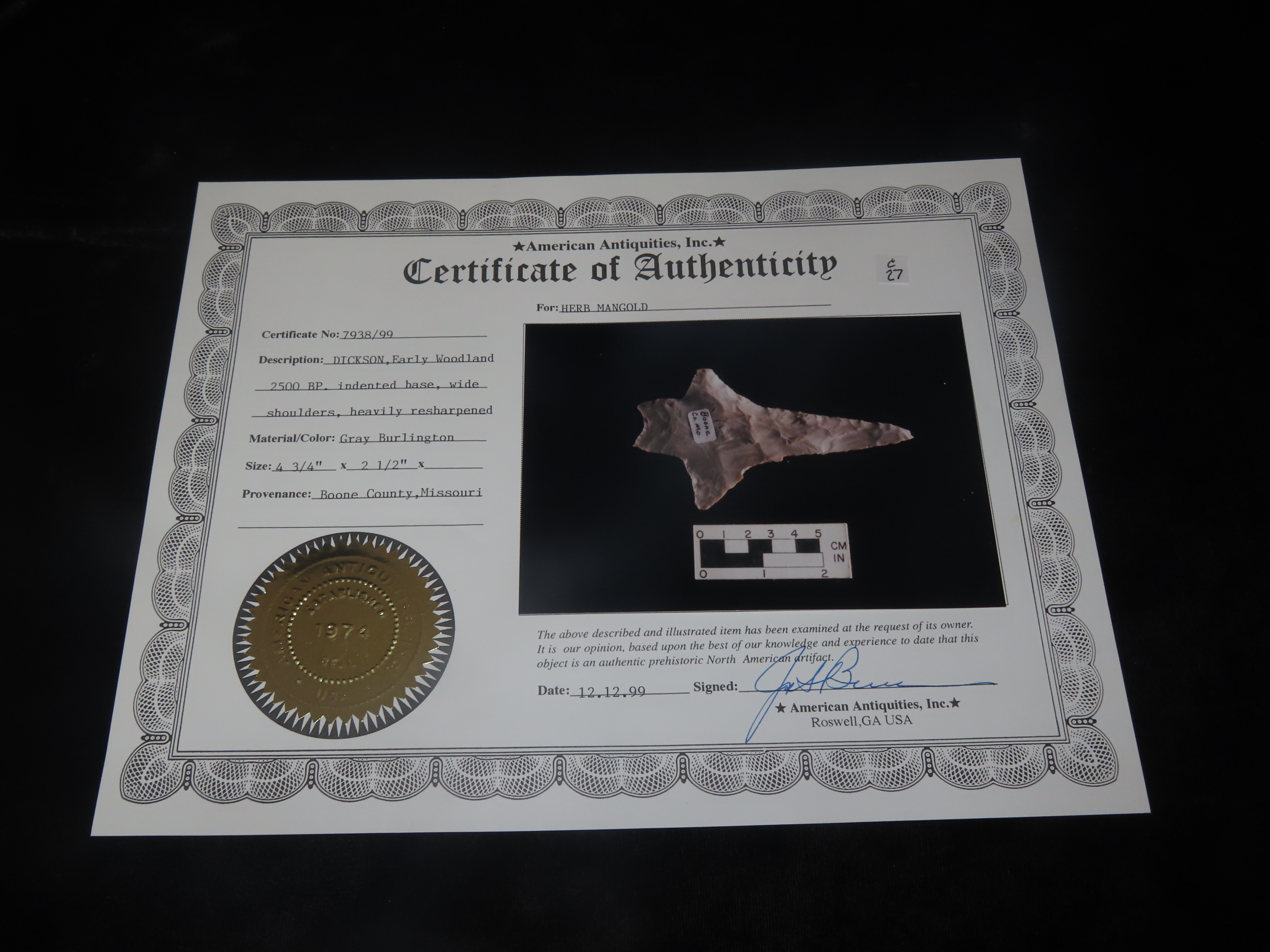 4 3/4″ X 2 1/2″ Dickson, AAI COA, Found in Boone County MO., Ex Herb Mangold Collection