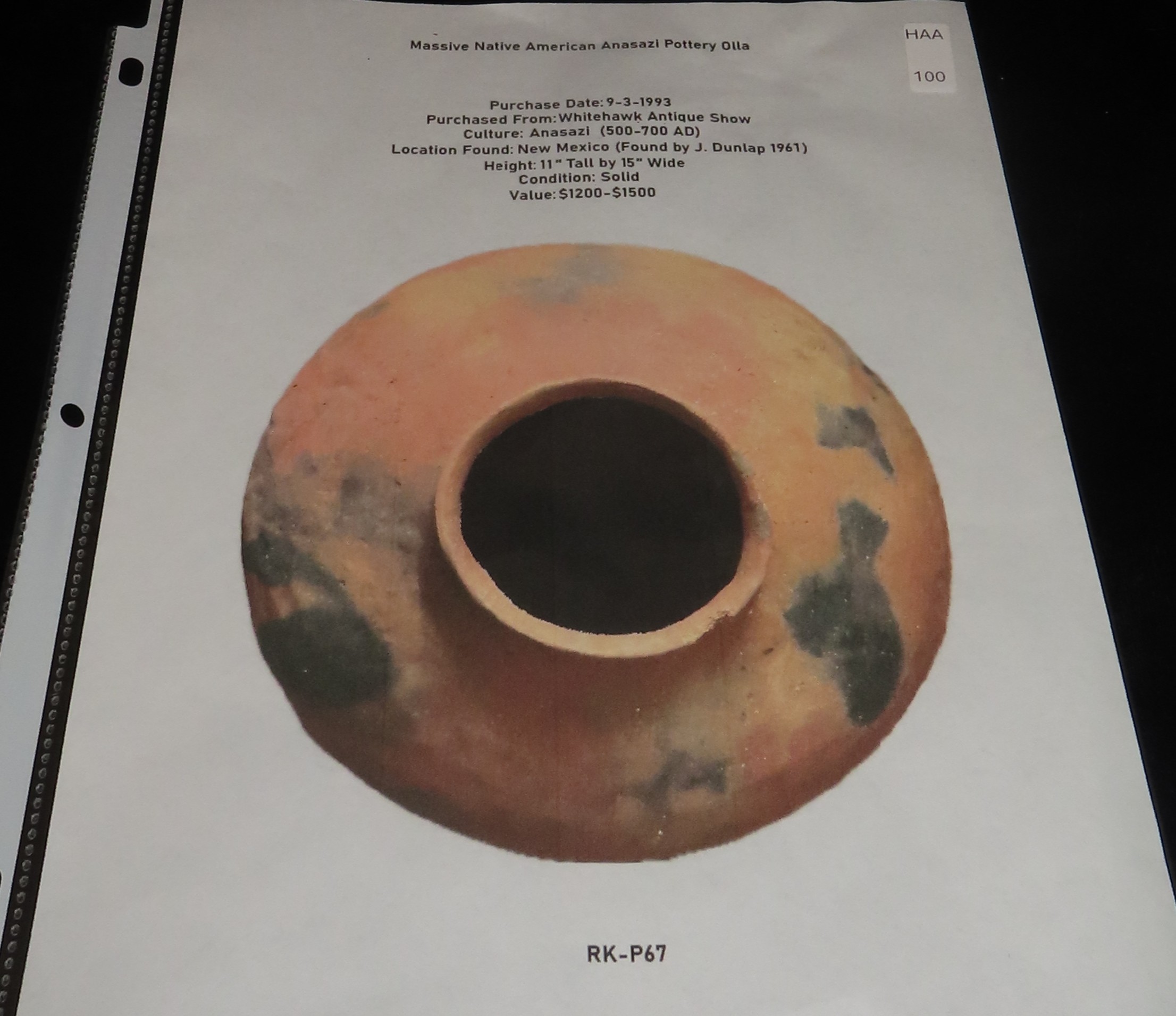 Massive 15″ x 11″ Native American Indian Anasazi Olla / Pot / Bowl, Found by J. Dunlap in New Mexico in 1961, Solid with No Restoration, #RK-P67