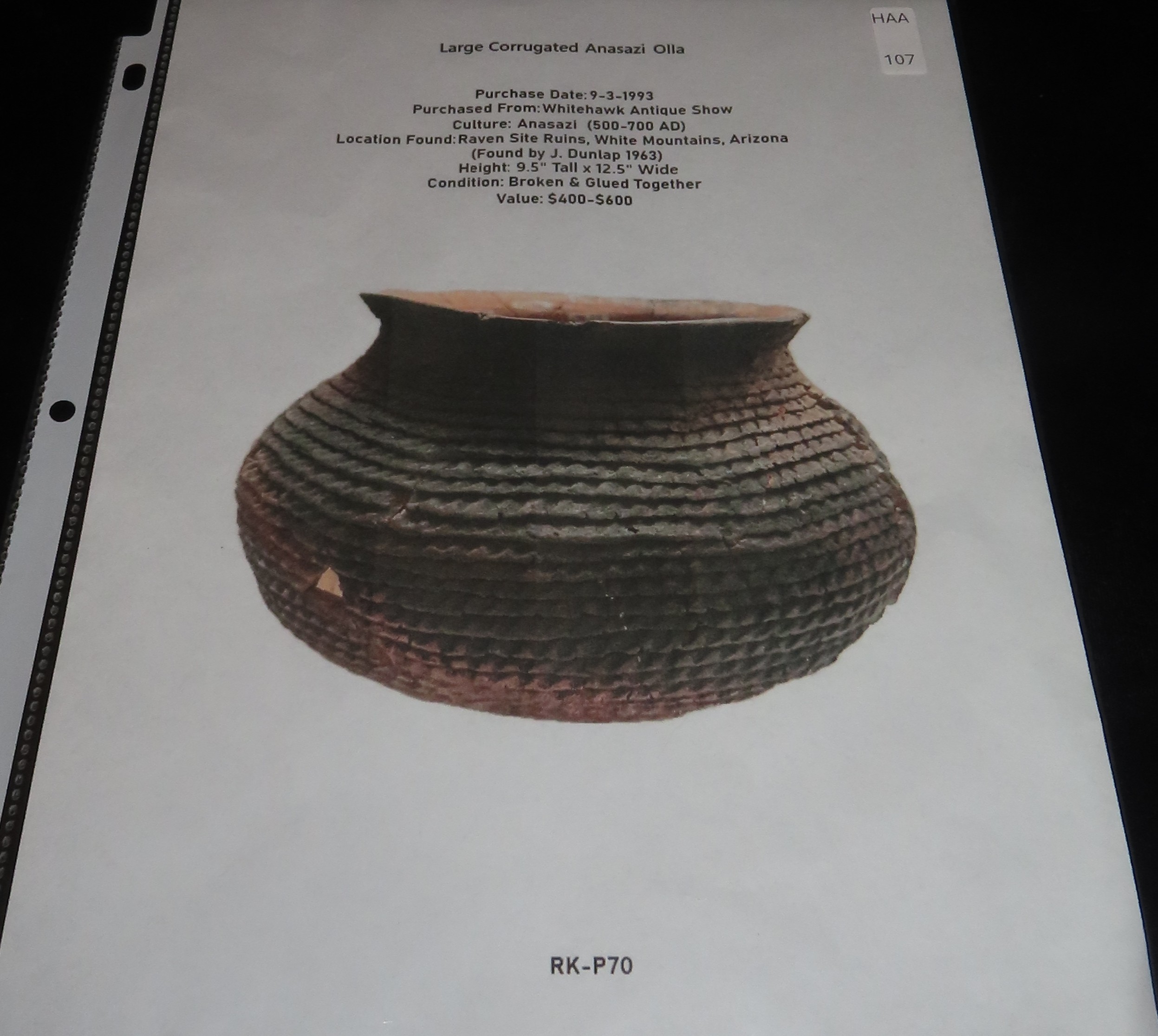 Huge 12 1/2″ Wide Anasazi Corrugated Olla, Found in 1963, Arizona, Pieced Together from Numerous Pieces, #RK-P70