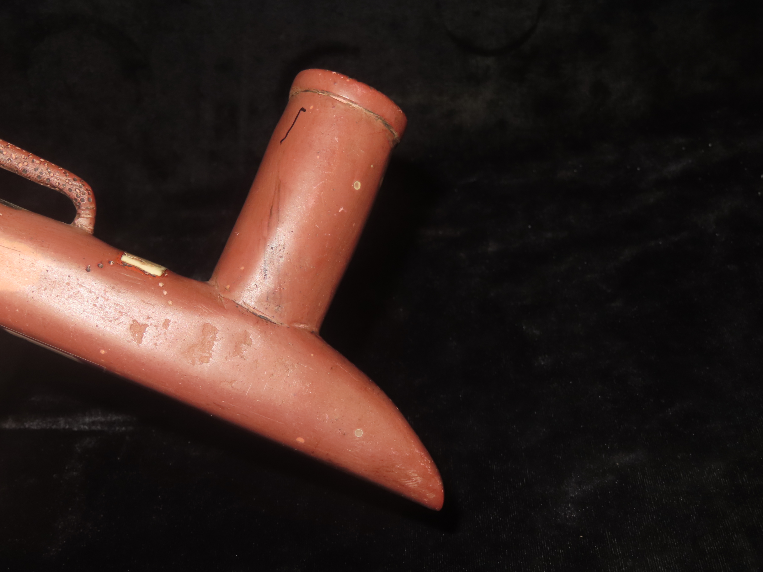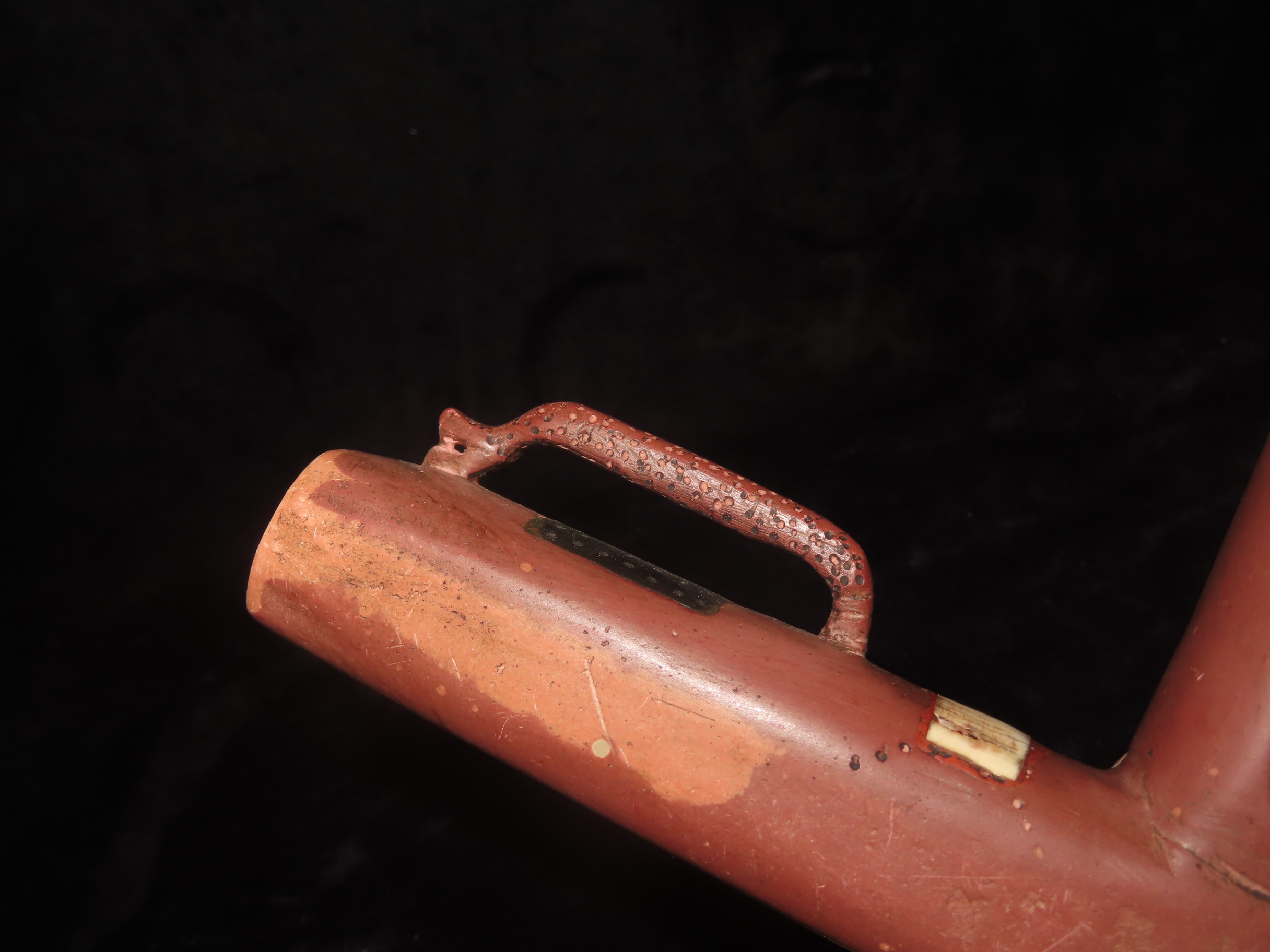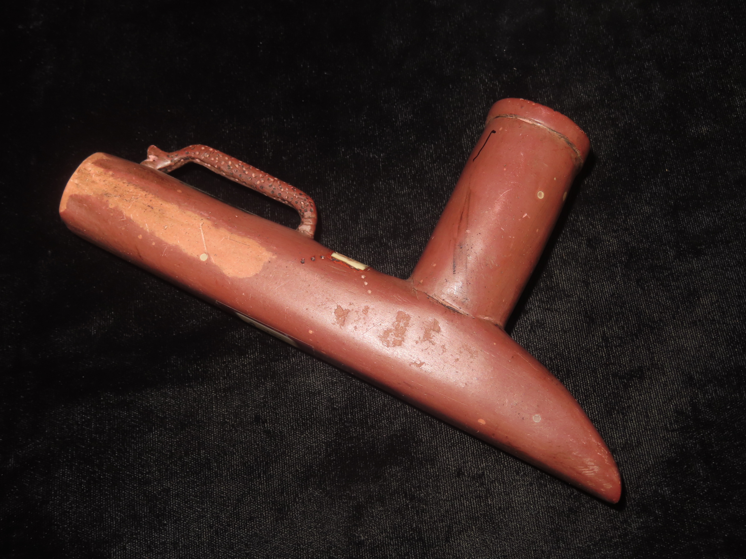 7 3/8" Catlinite Effigy Inlaid T-Pipe, Historic, Early 1900's Example, Numerous Intricate Shell & Stone Inlay & a Snake Carved on the Stem
