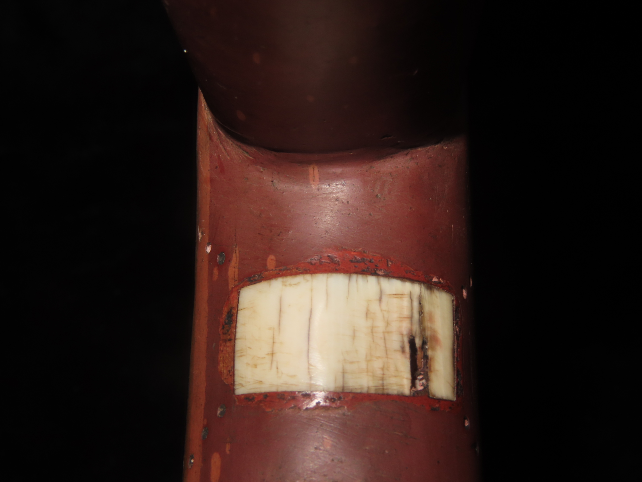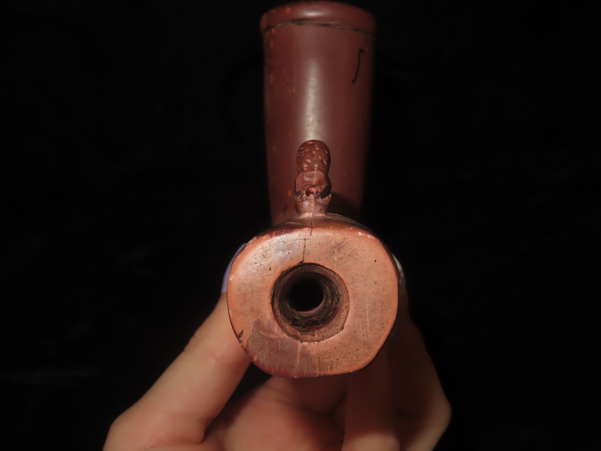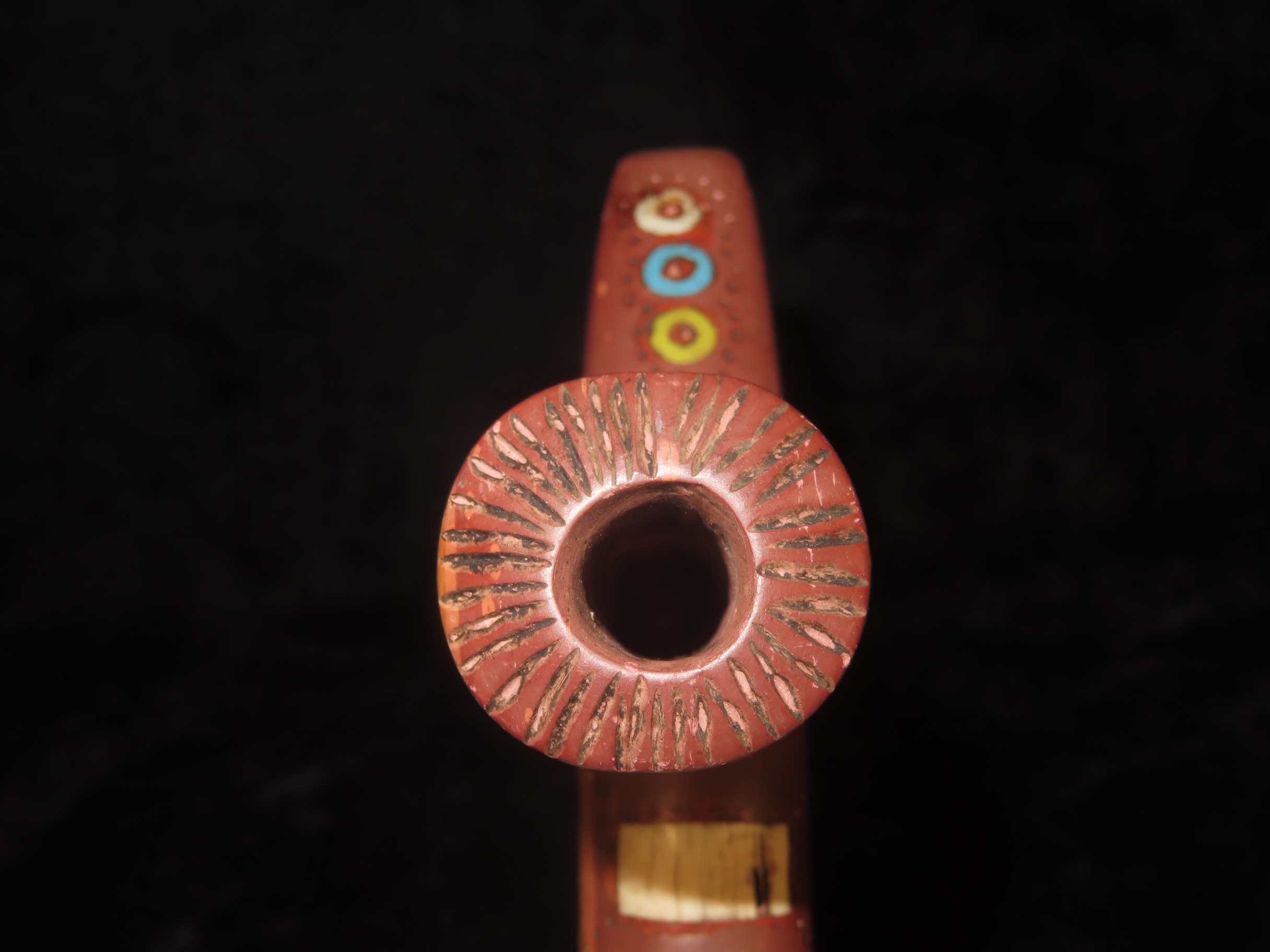 7 3/8" Catlinite Effigy Inlaid T-Pipe, Historic, Early 1900's Example, Numerous Intricate Shell & Stone Inlay & a Snake Carved on the Stem