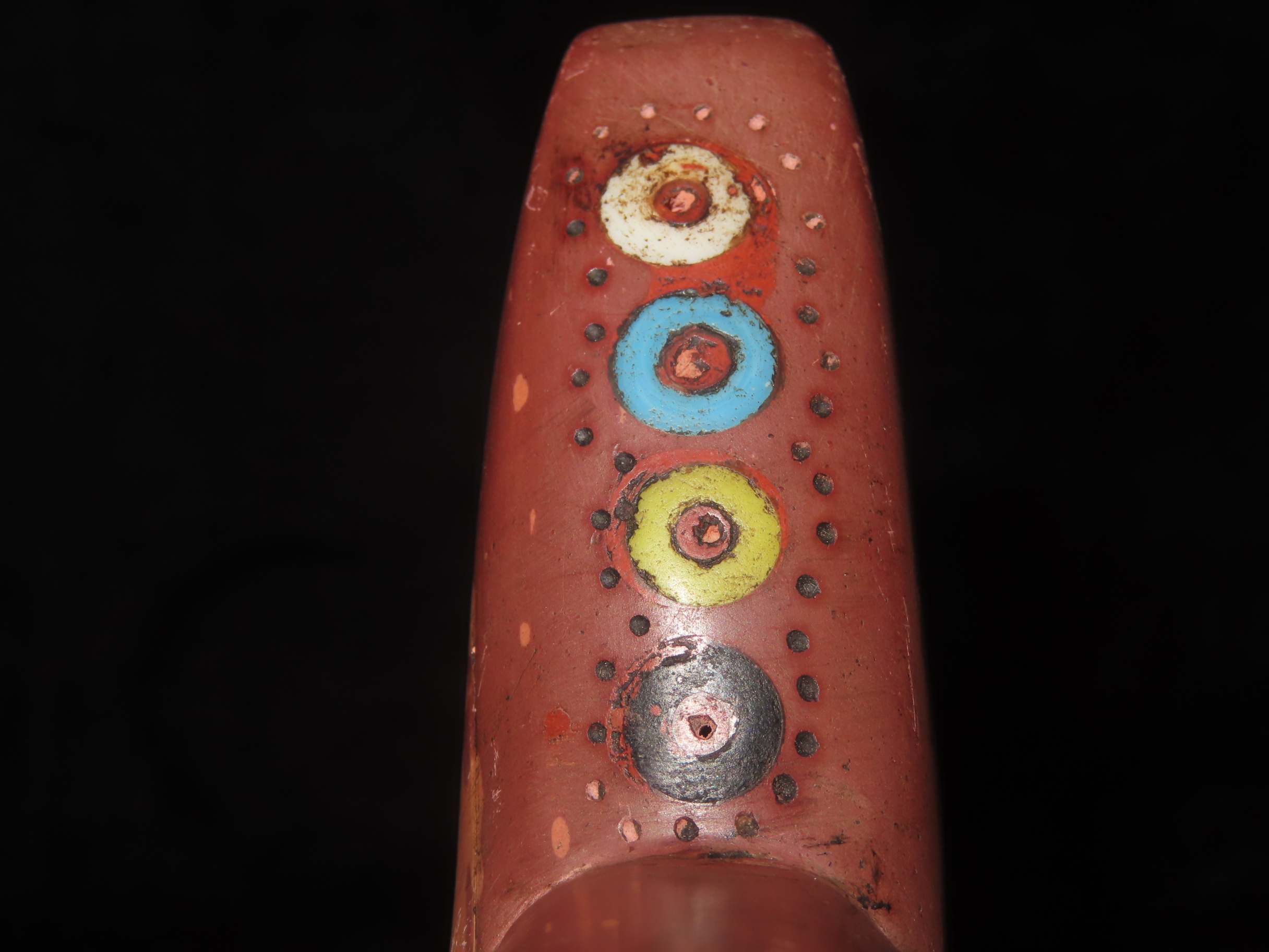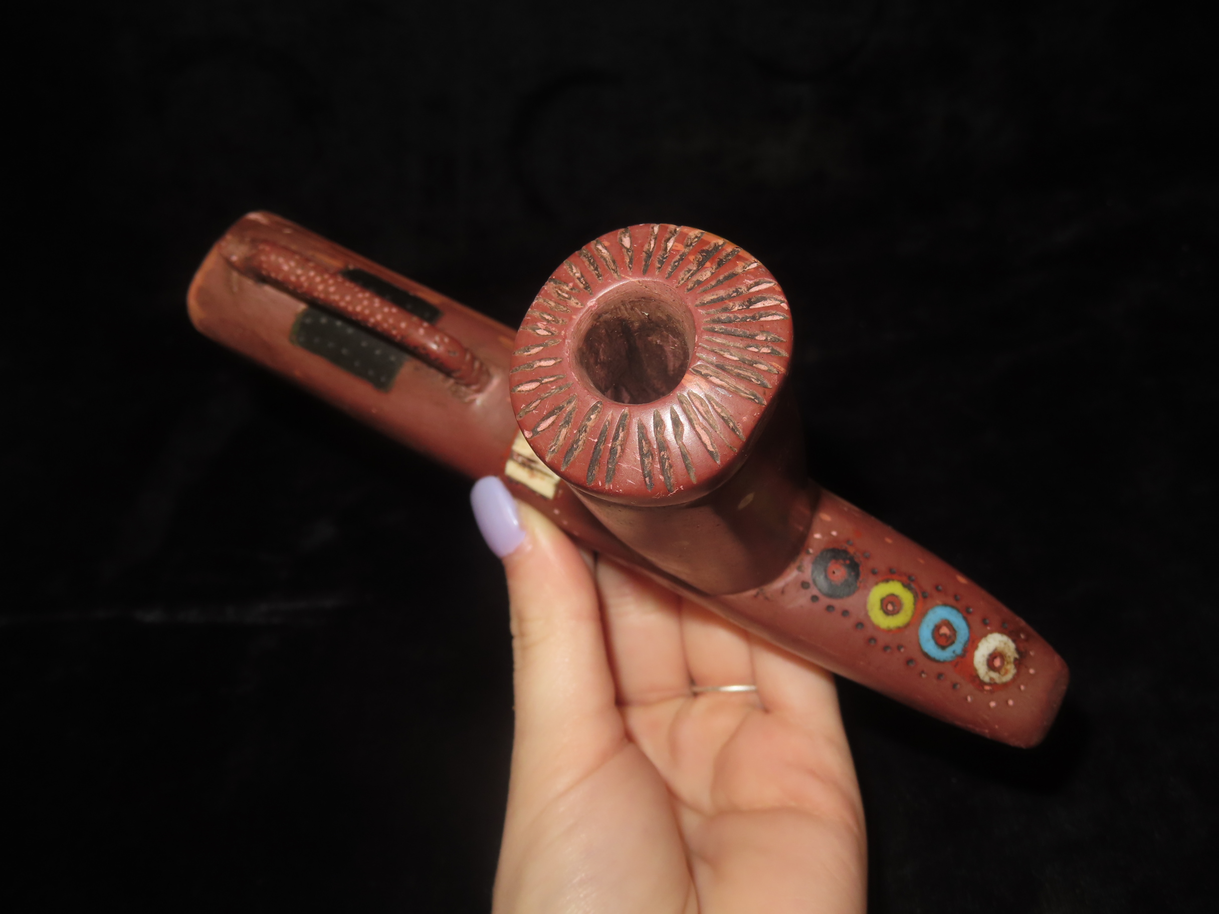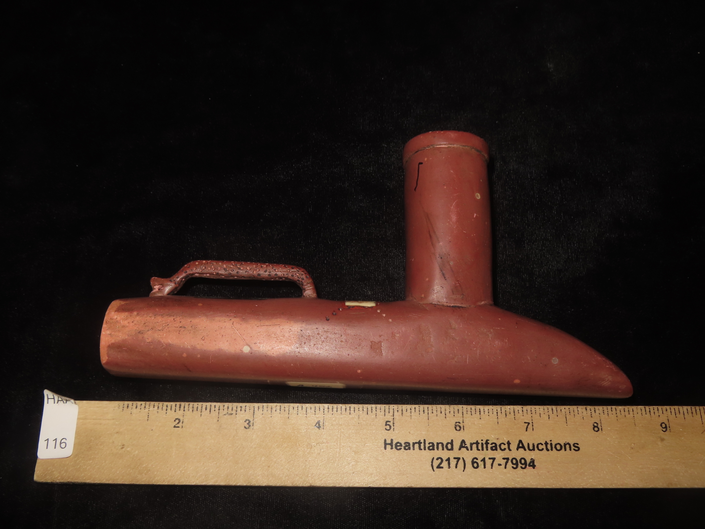 7 3/8″ Catlinite Effigy Inlaid T-Pipe, Historic, Early 1900’s Example, Numerous Intricate Shell & Stone Inlay & a Snake Carved on the Stem