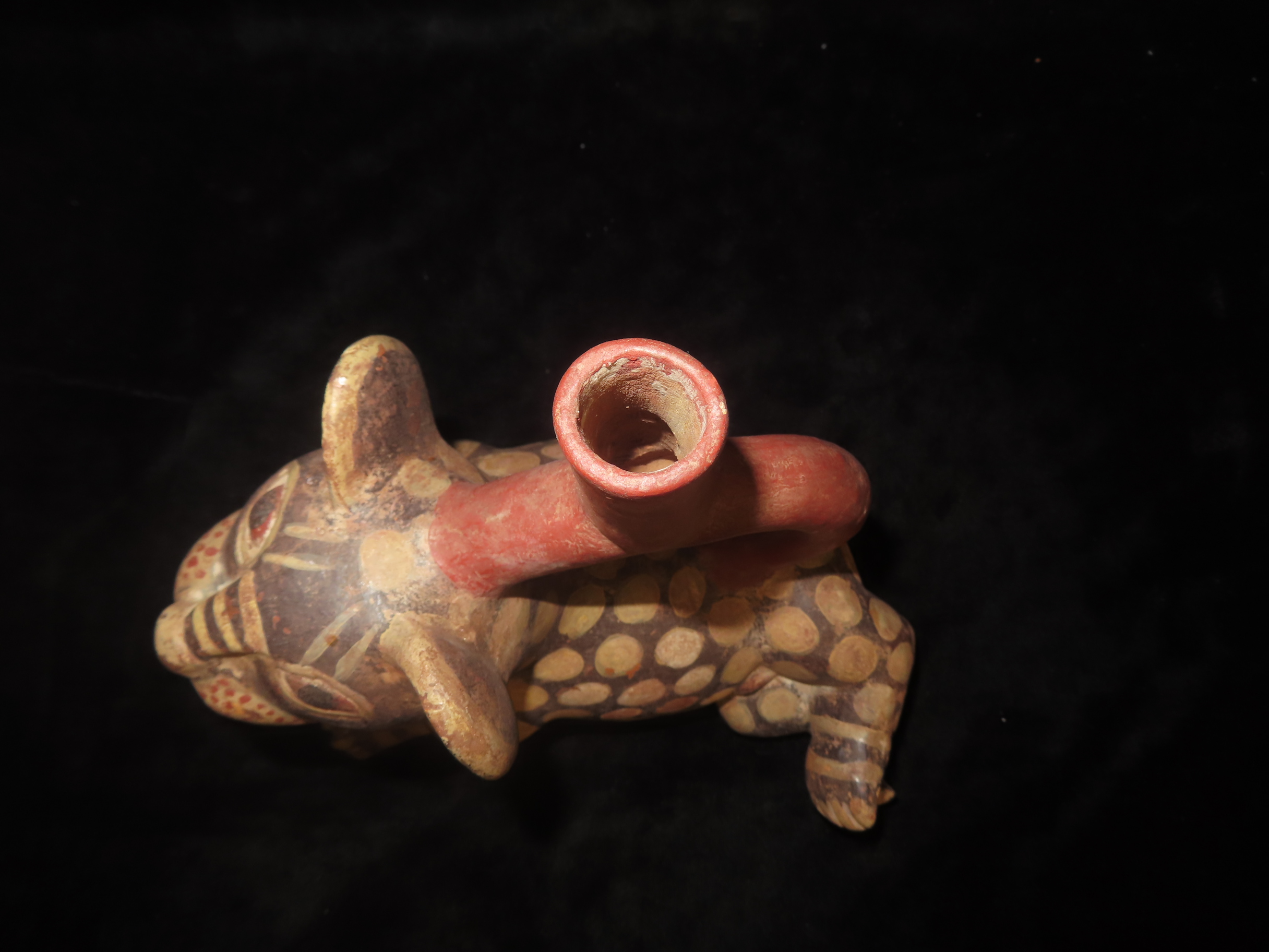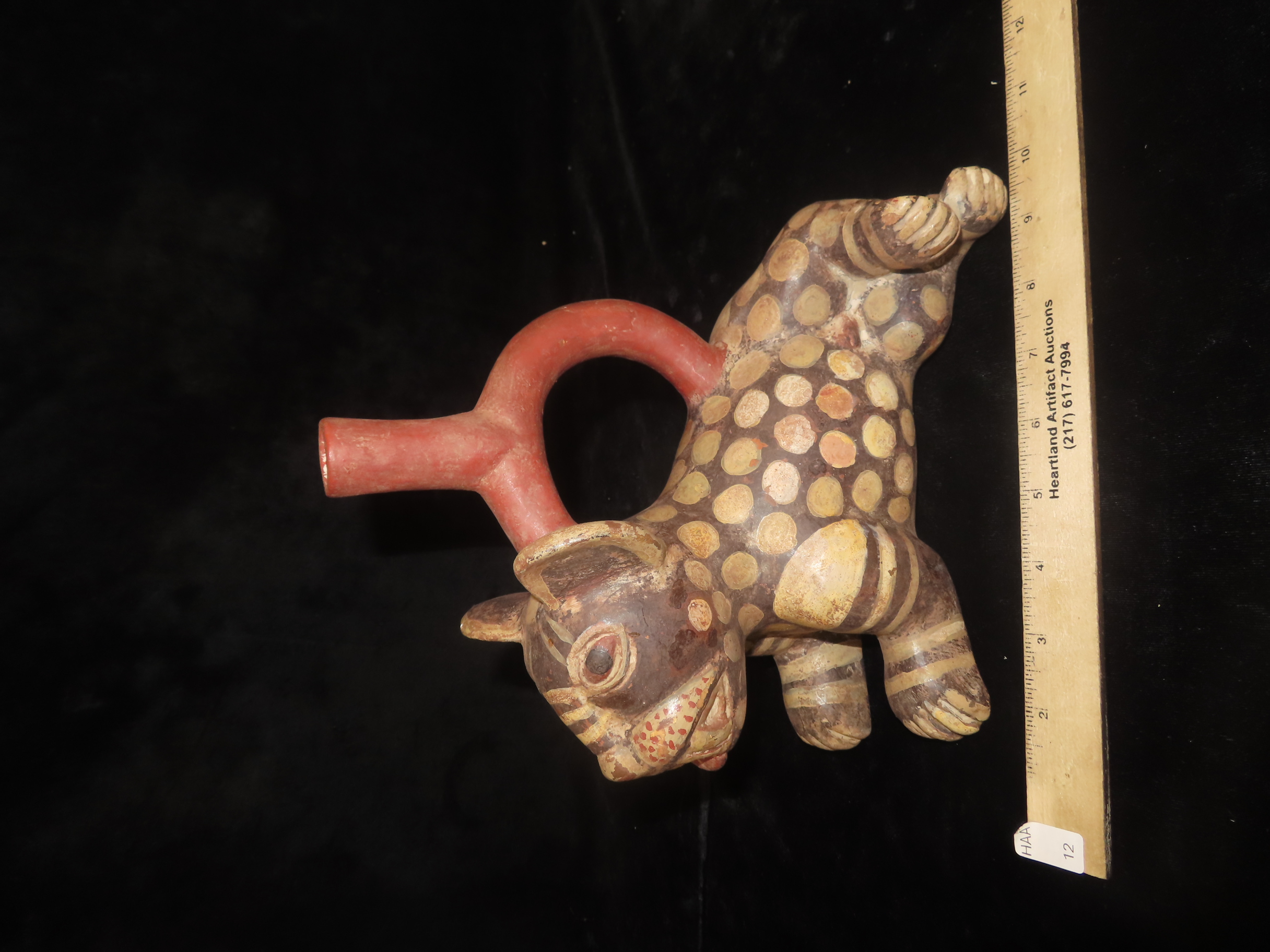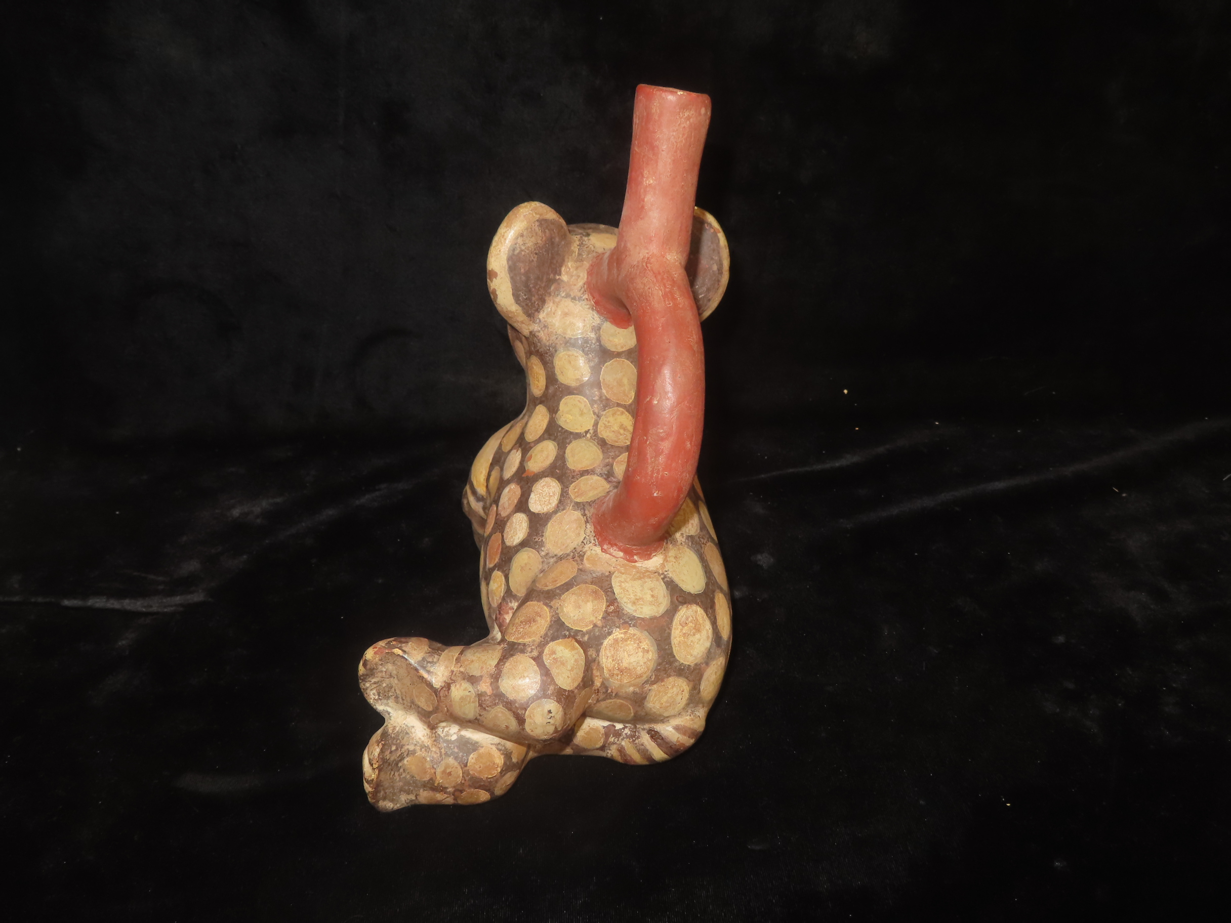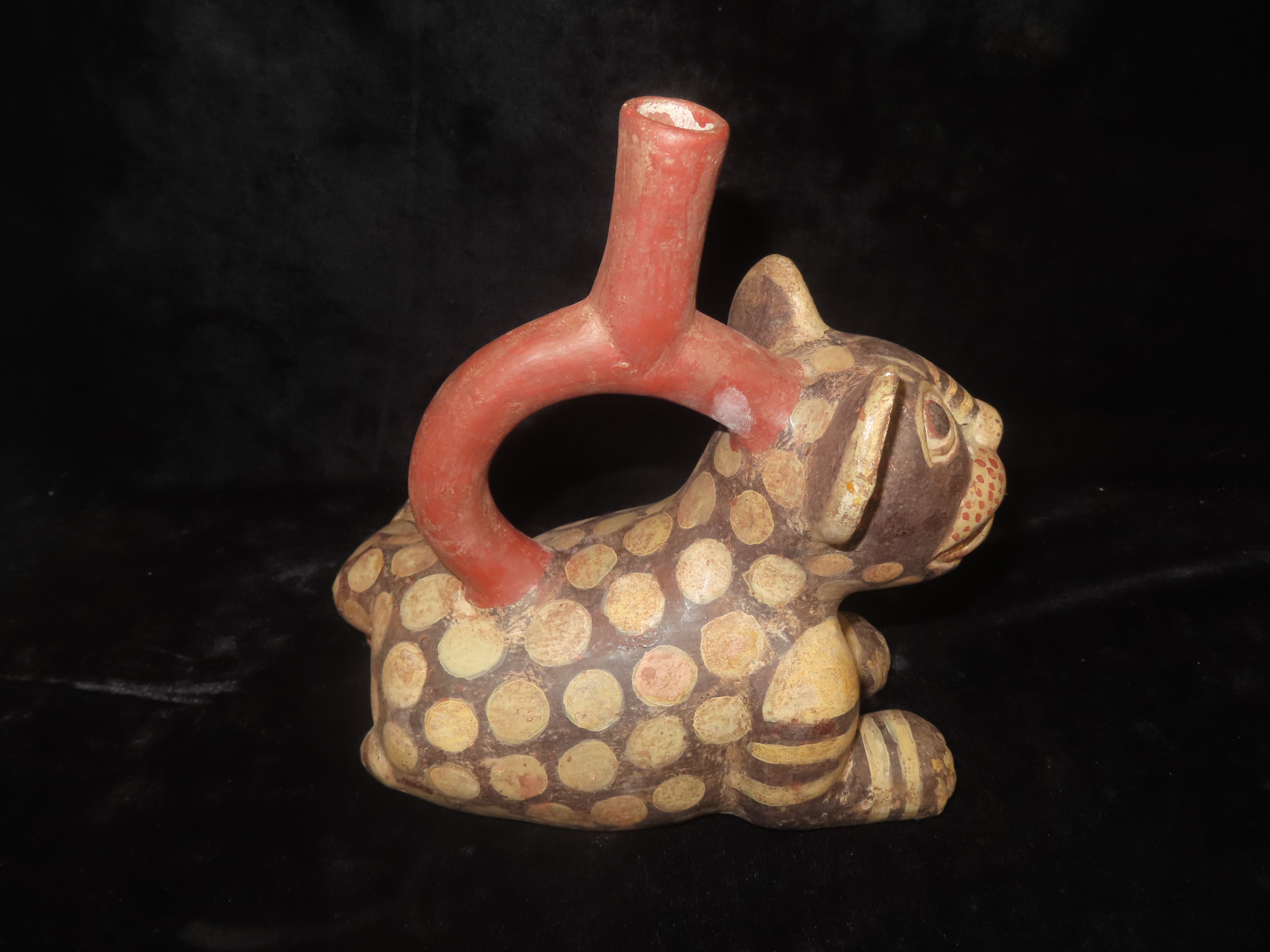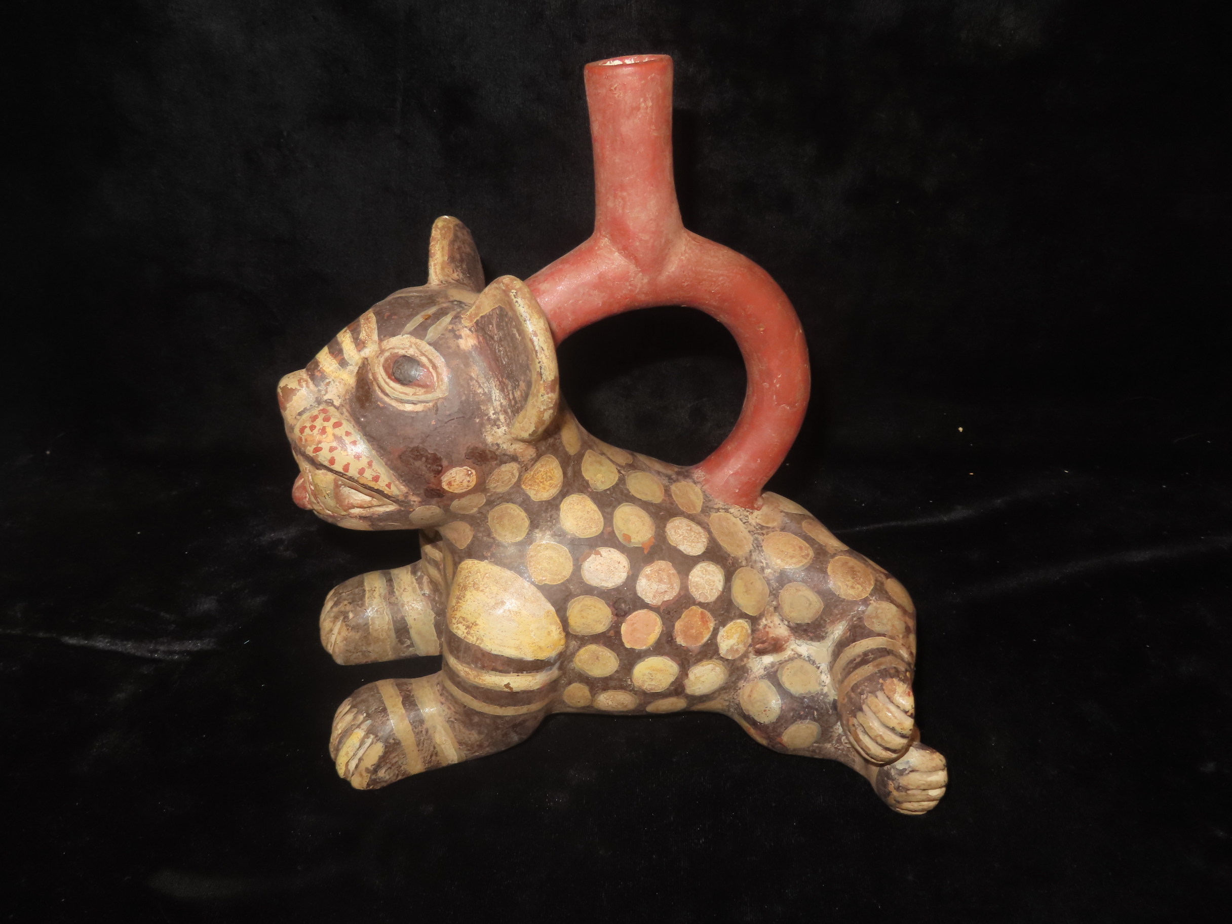 Pre-Columbian Moche Style Jaguar Effigy Stirrup Bottle, Solid, Peru, 9″ Long, #RK-P58