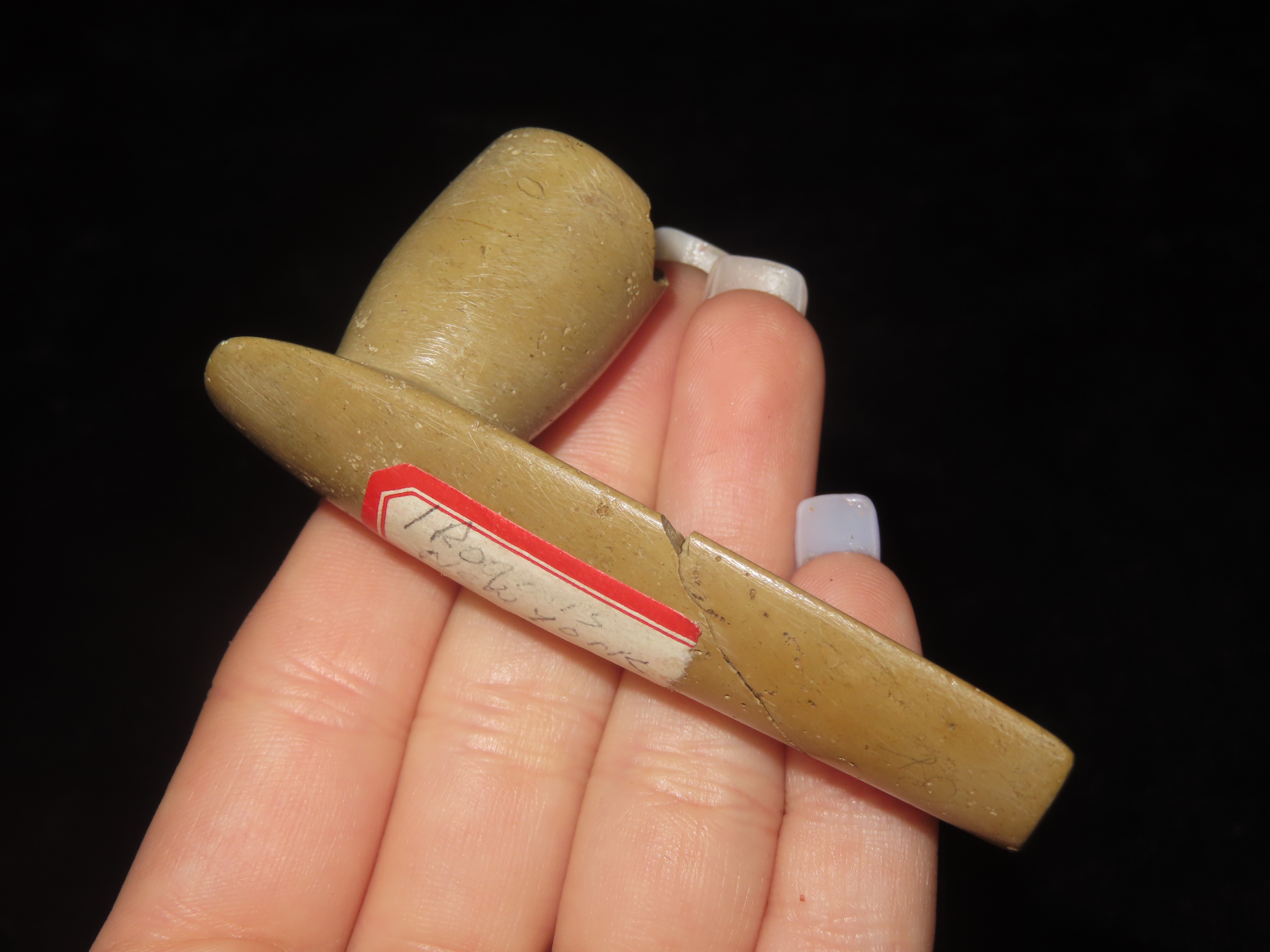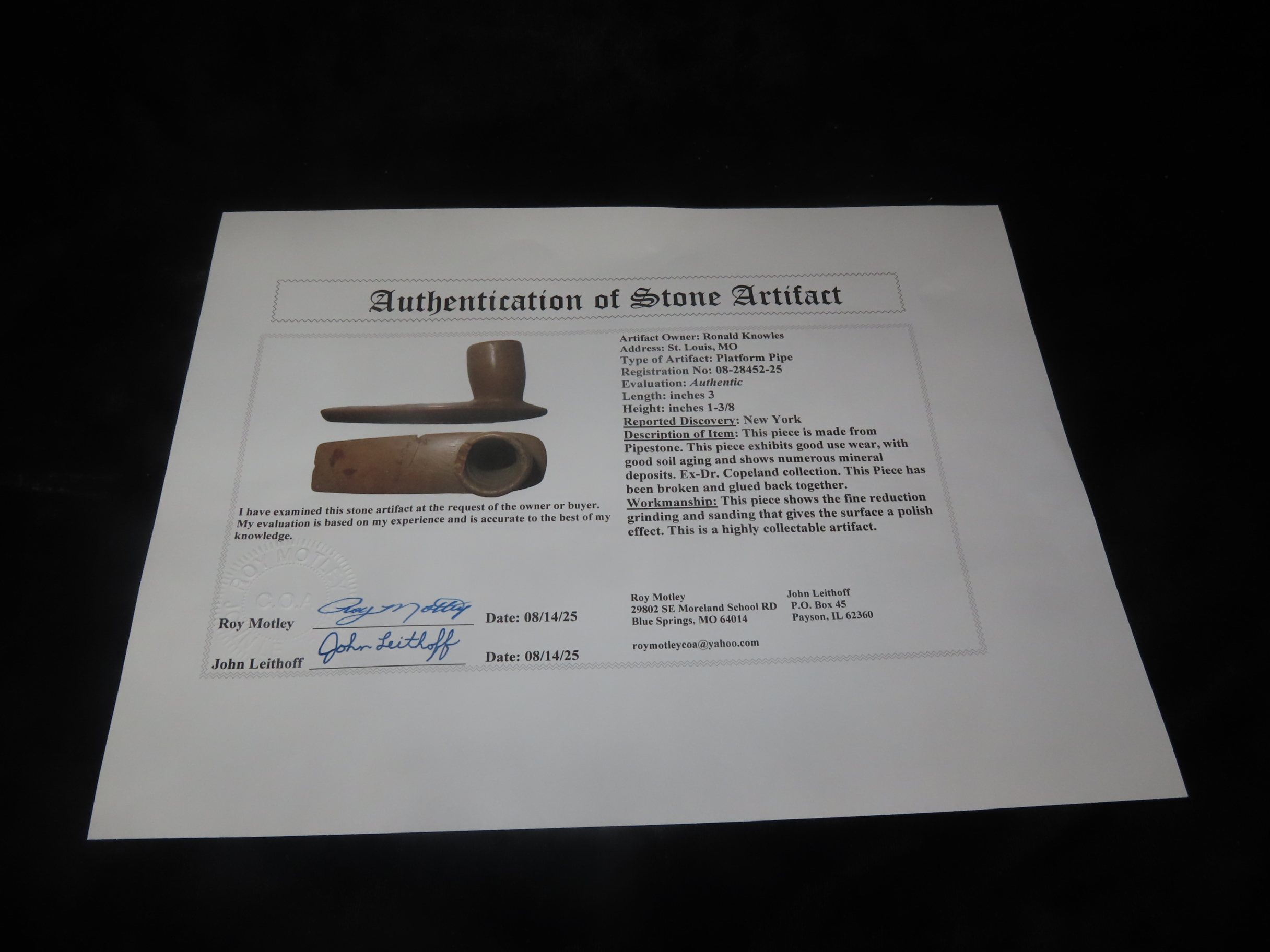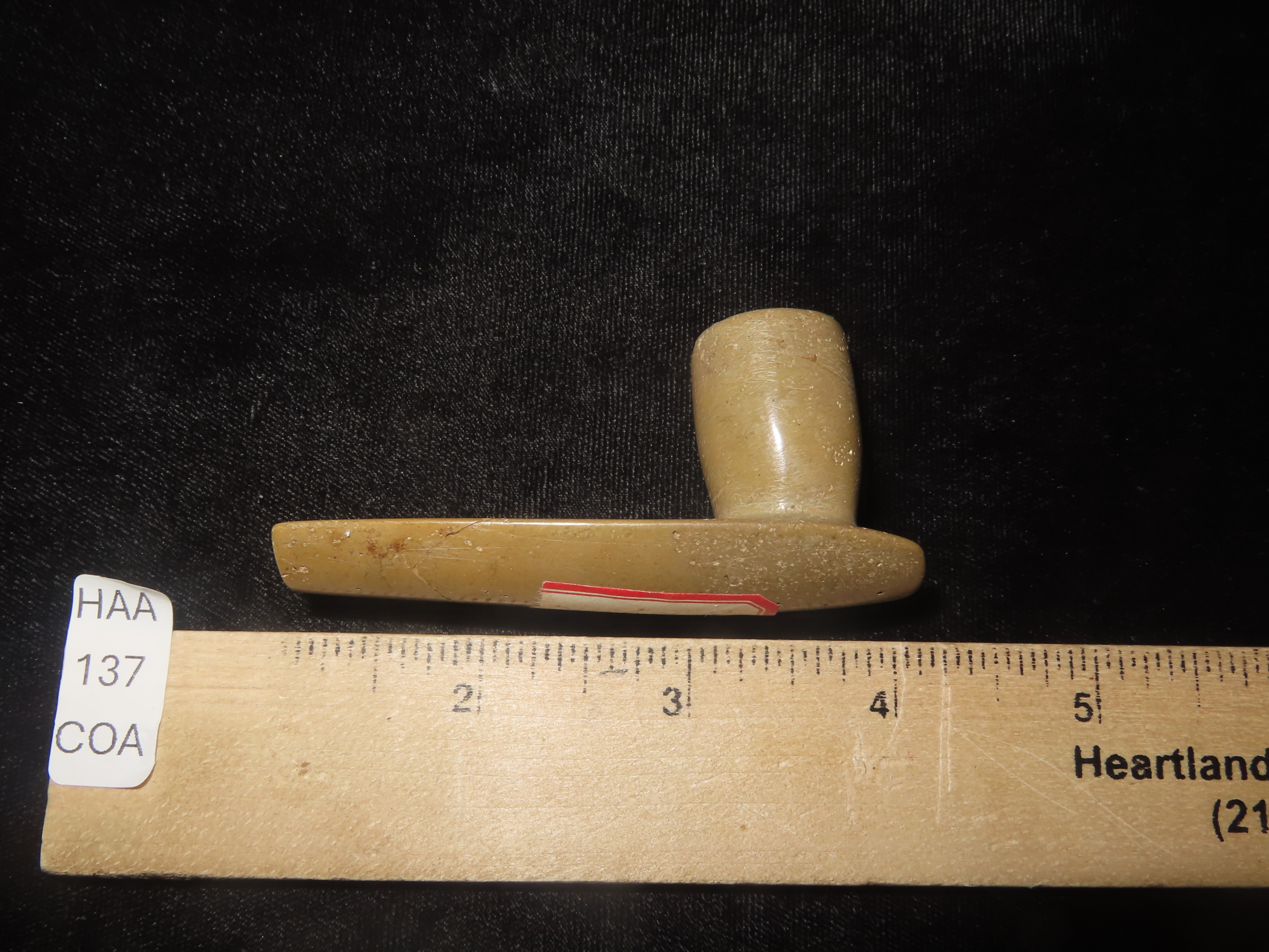 3″ Pipestone Platform Pipe, Motley COA, New York, Early Iroquois Style, Ex Dr, Copeland Collection, Broken & Glued on the Stem