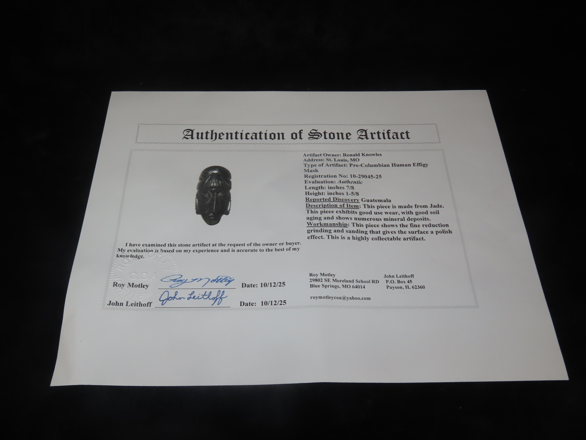 Highly Translucent Green Jade Mask, Guatemala, Motley COA, High Grade piece of Pre-Columbian Jade