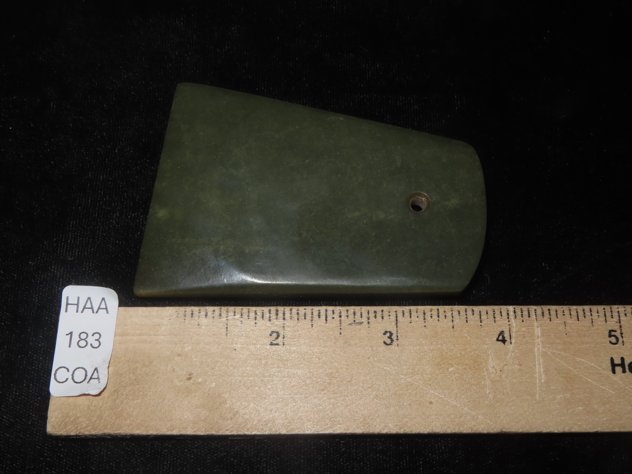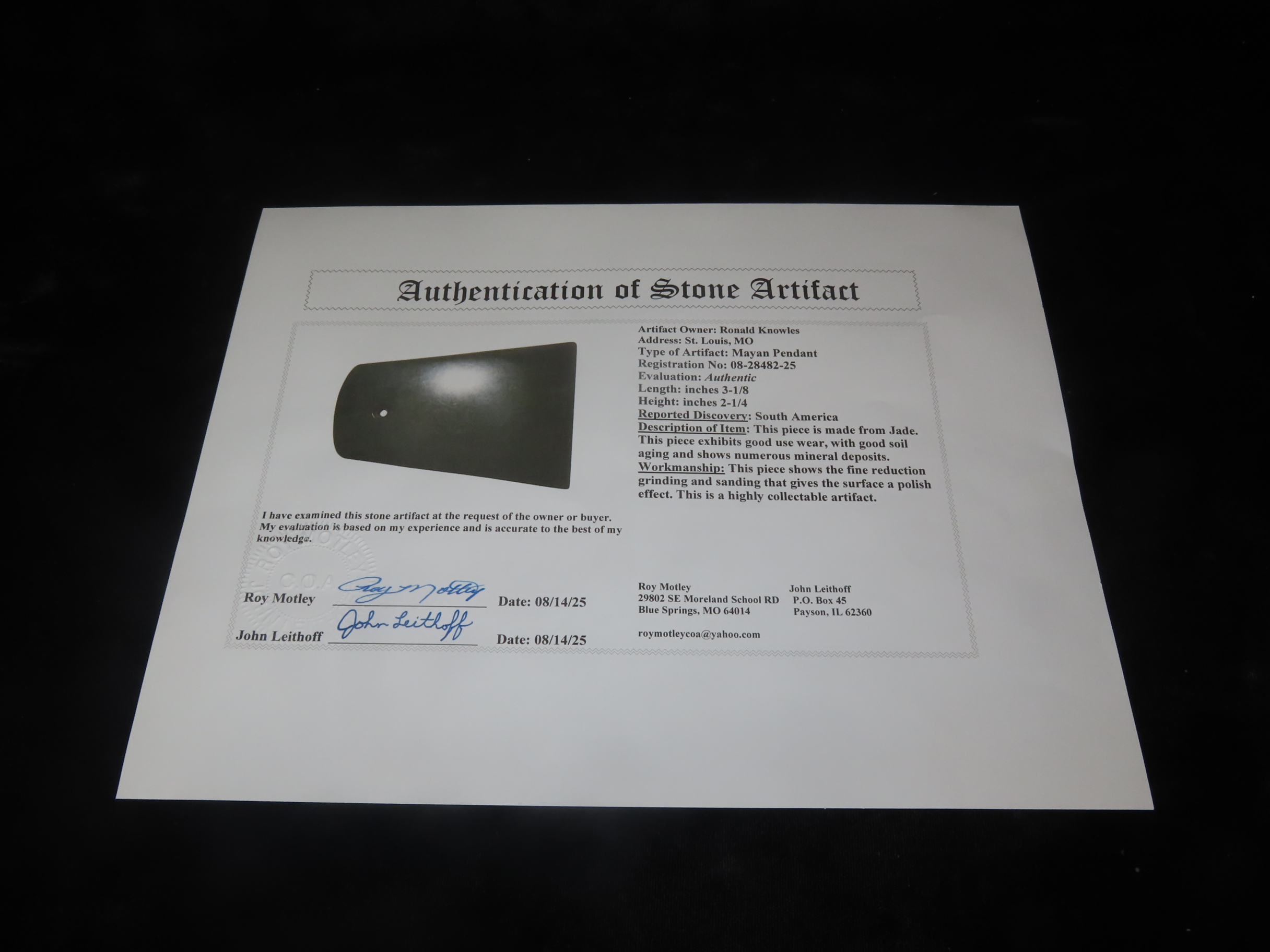 3 1/8″ Mayan Jade Pendant, South America, Motley COA, Highly Translucent