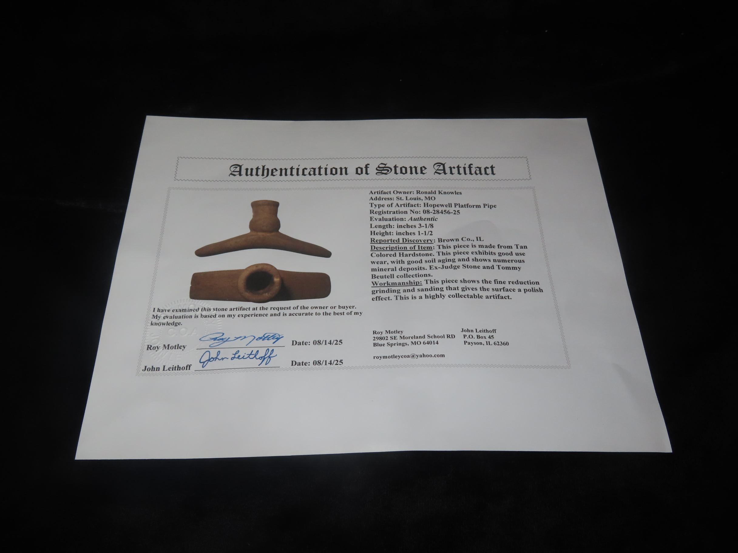 Outstanding Hopewell Platform Pipe, Motely COA, Brown County Illinois, Ex Judge Stone, Tommy Beutell