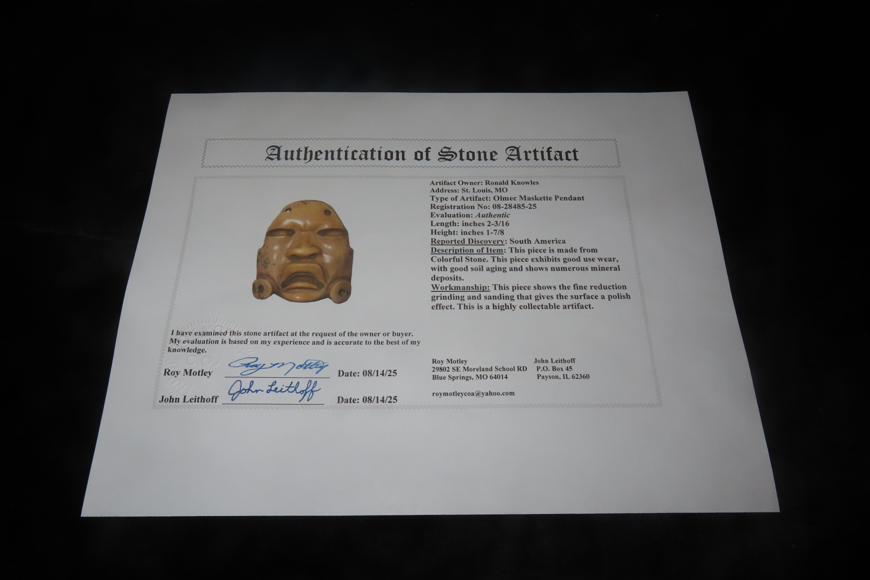 2 3/16″ Olmec Maskette Pendant, South America, Motley COA