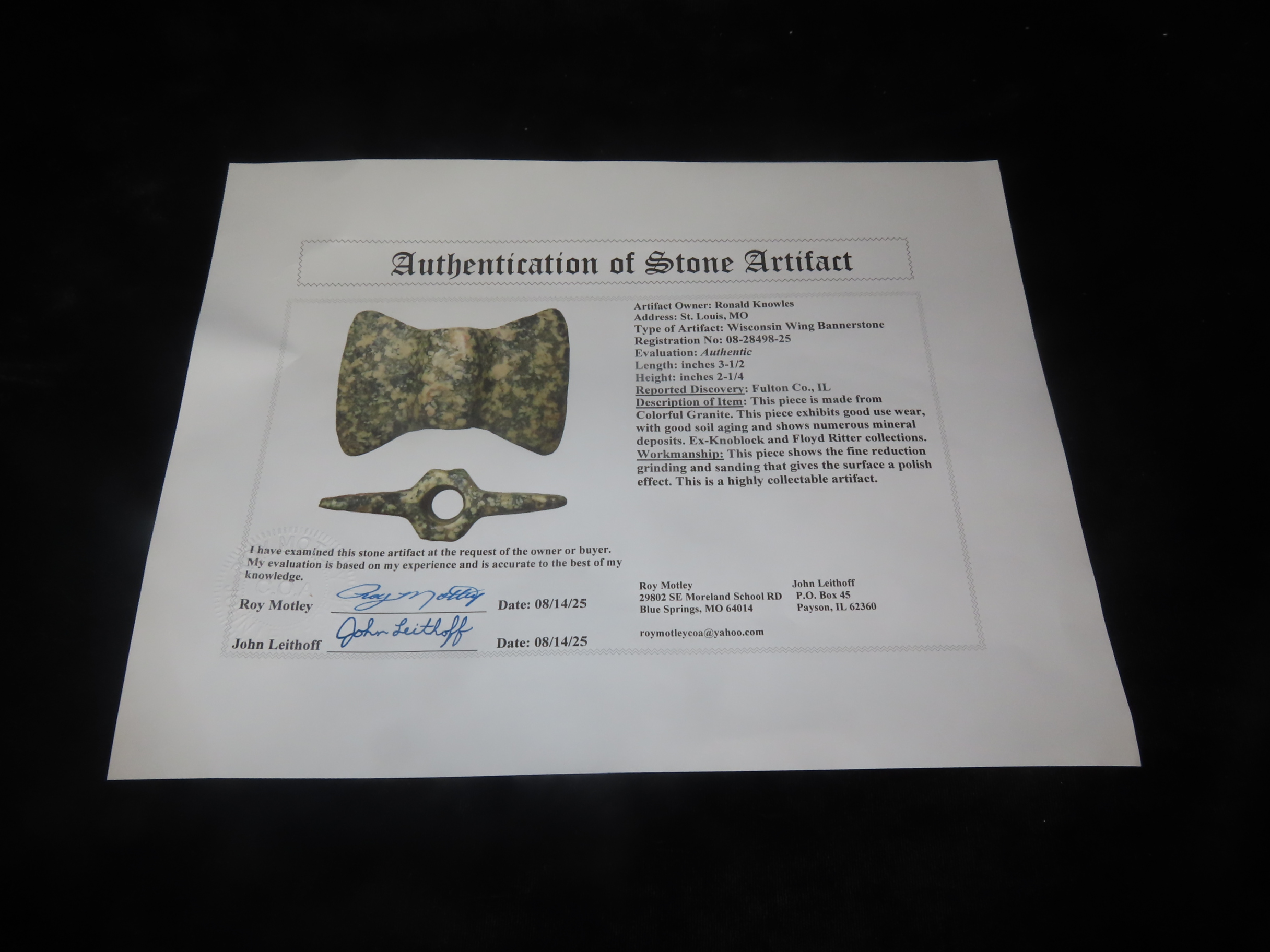 3 1/2″ Wisconsin Wing Bannerstone, Motley COA, Fulton County Illinois, Ex Knoblock, Ritter