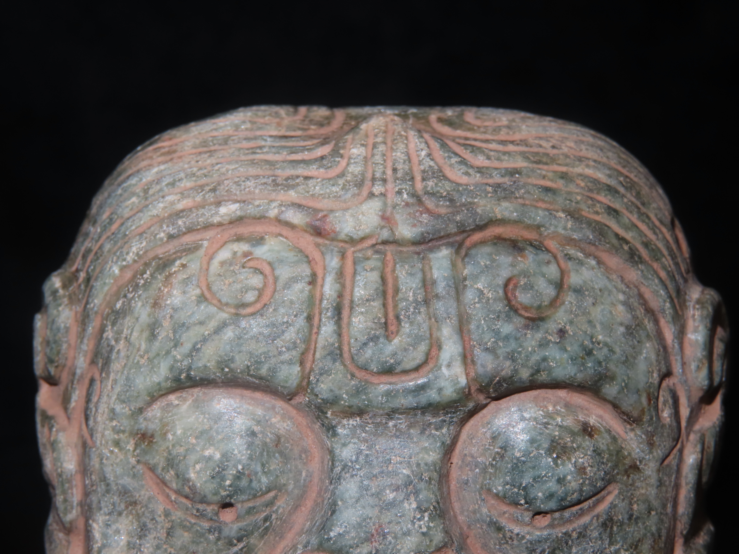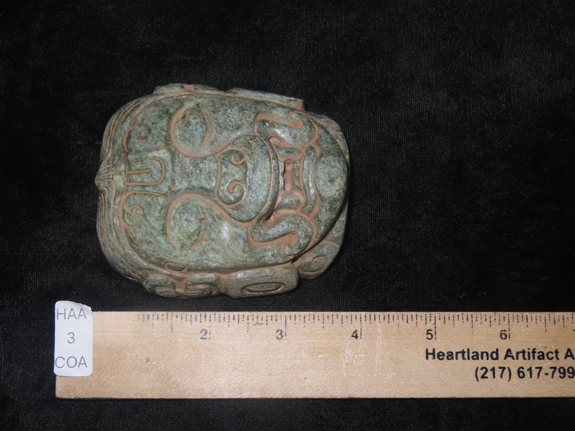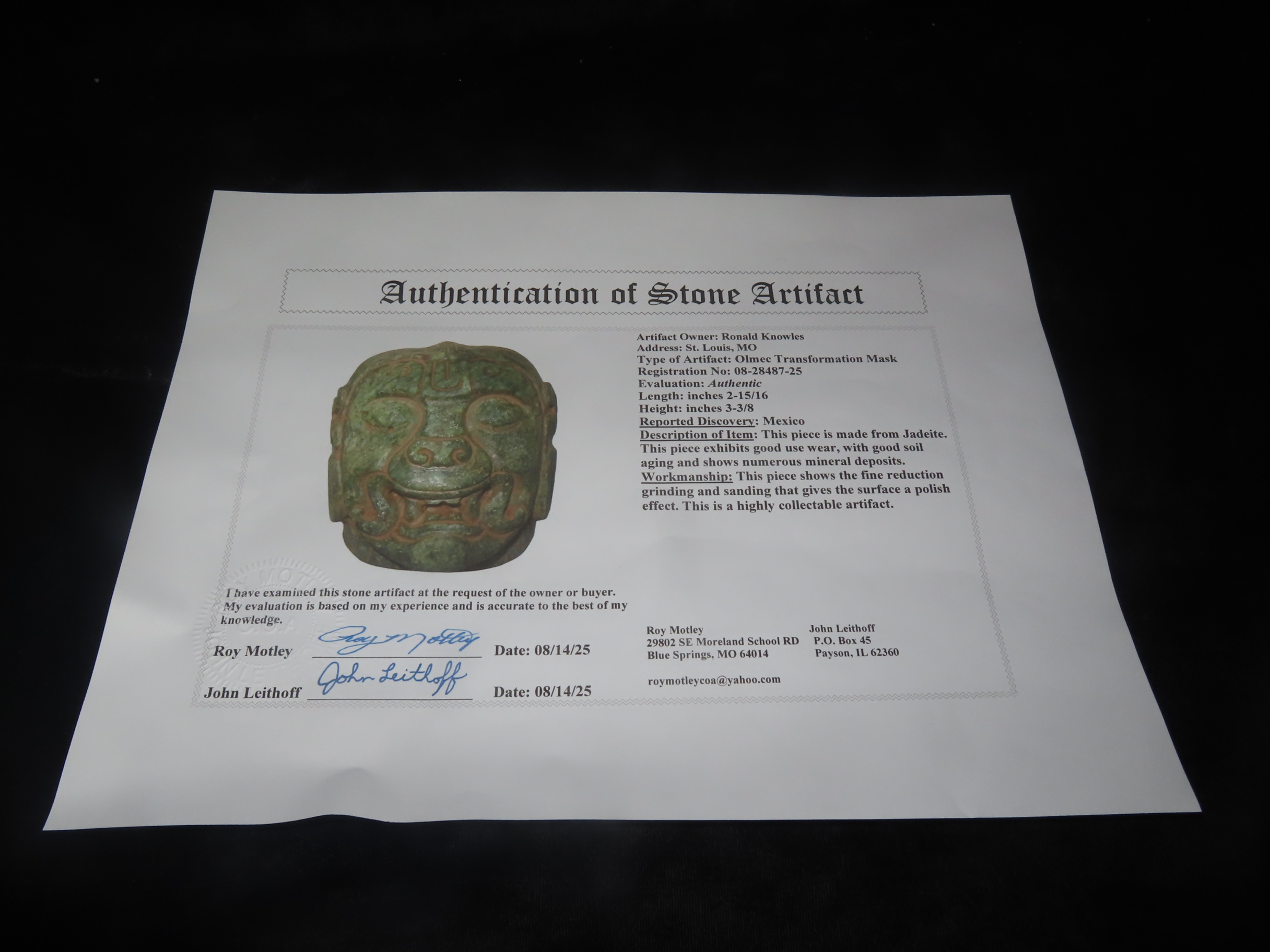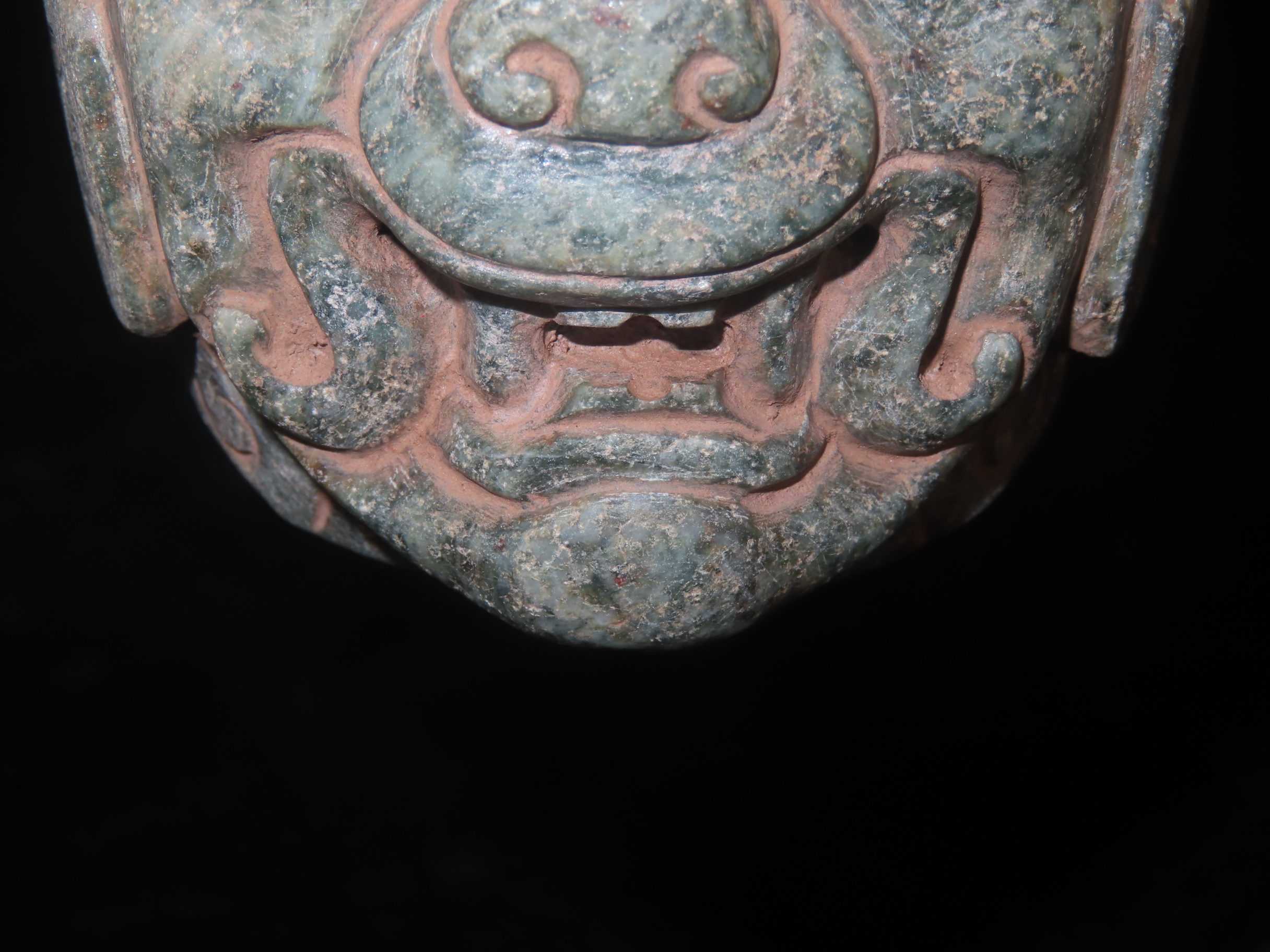 3 3/8″ Olmec Jaguar Transformation Mask, Mexico, Motley COA, Beautiful Green Jadeite, Nice Polish