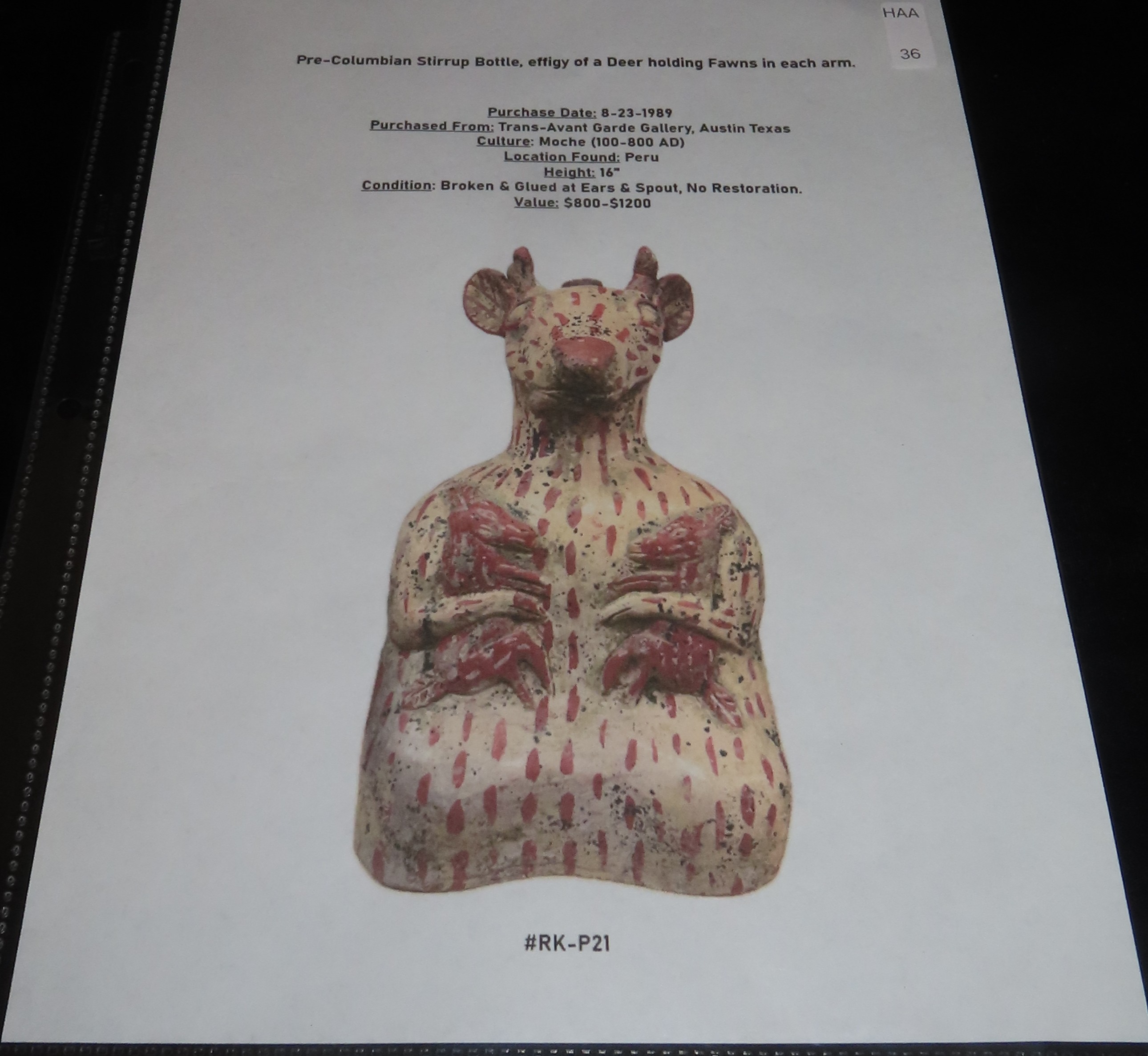 16″ Tall Pre-Columbian Moche Style Deer Effigy Stirrup Bottle Holding Fawns in Arms, Broken & Glued, Peru, #RK-P21