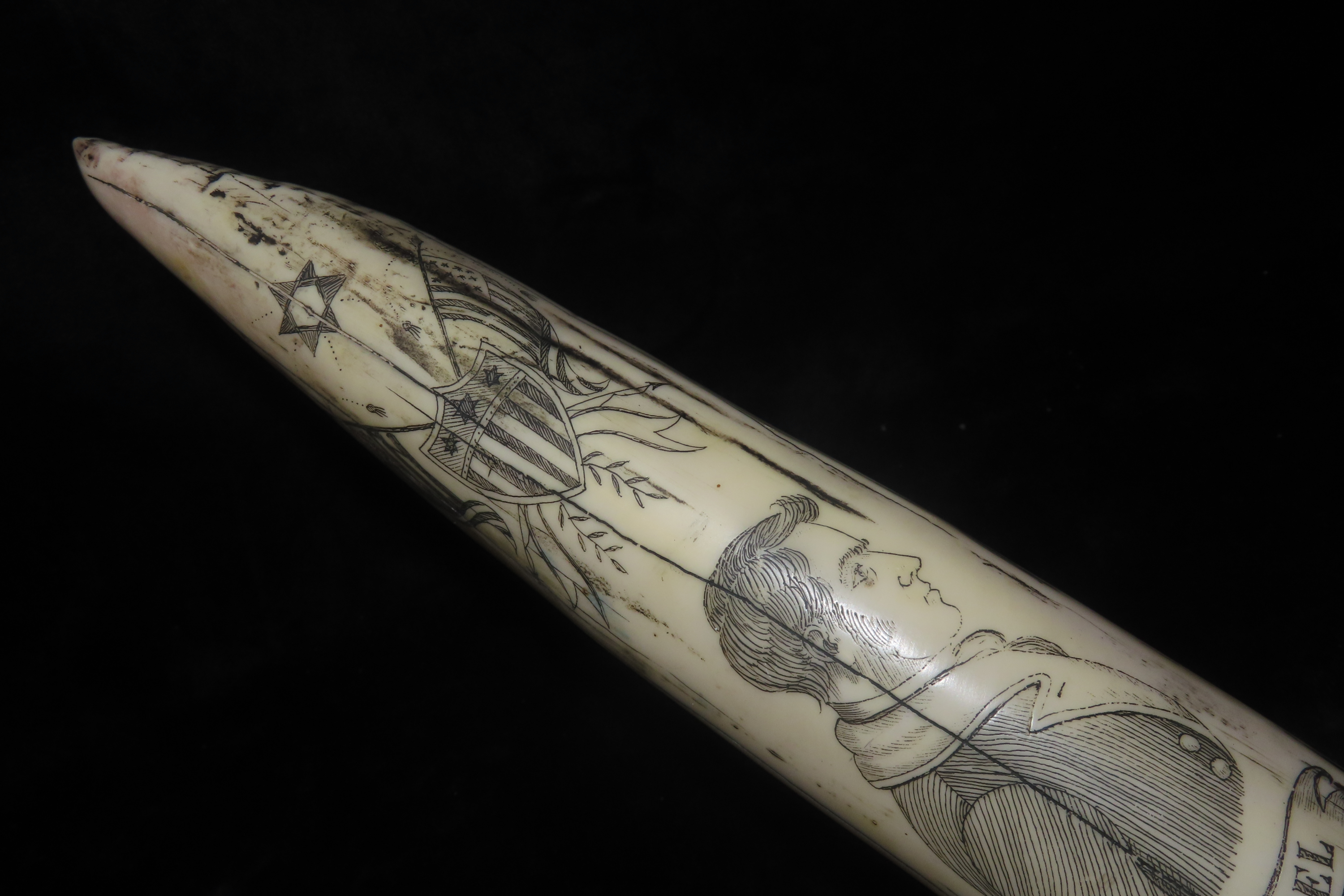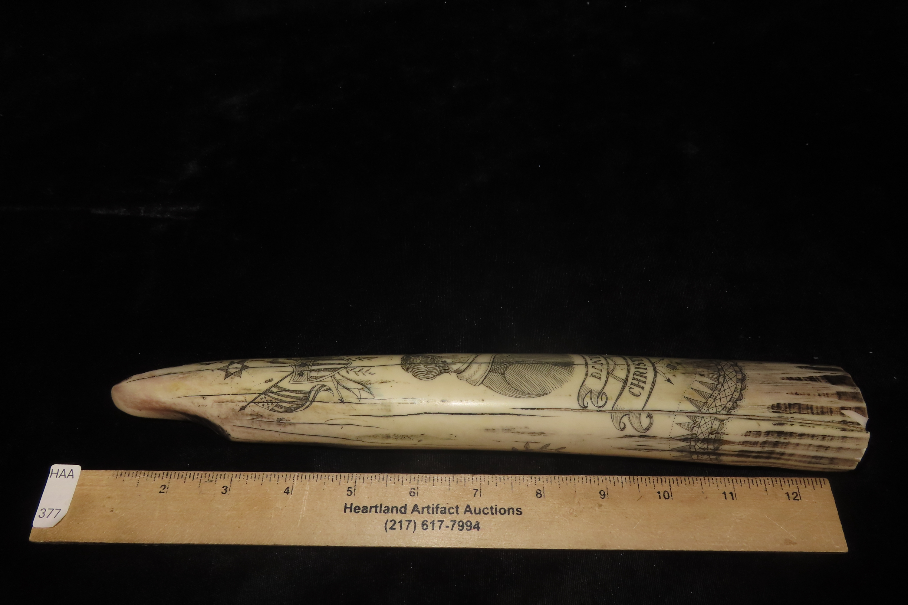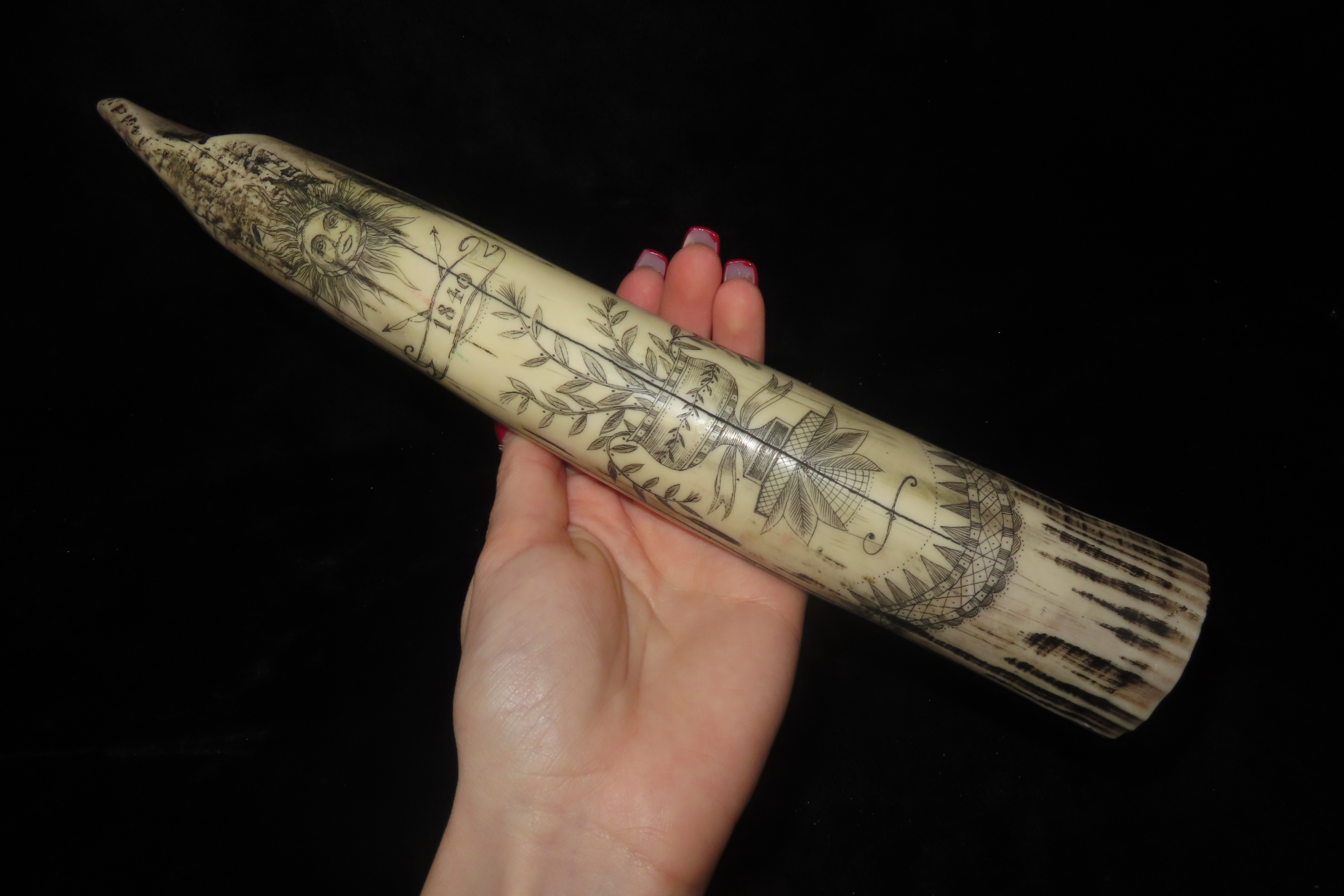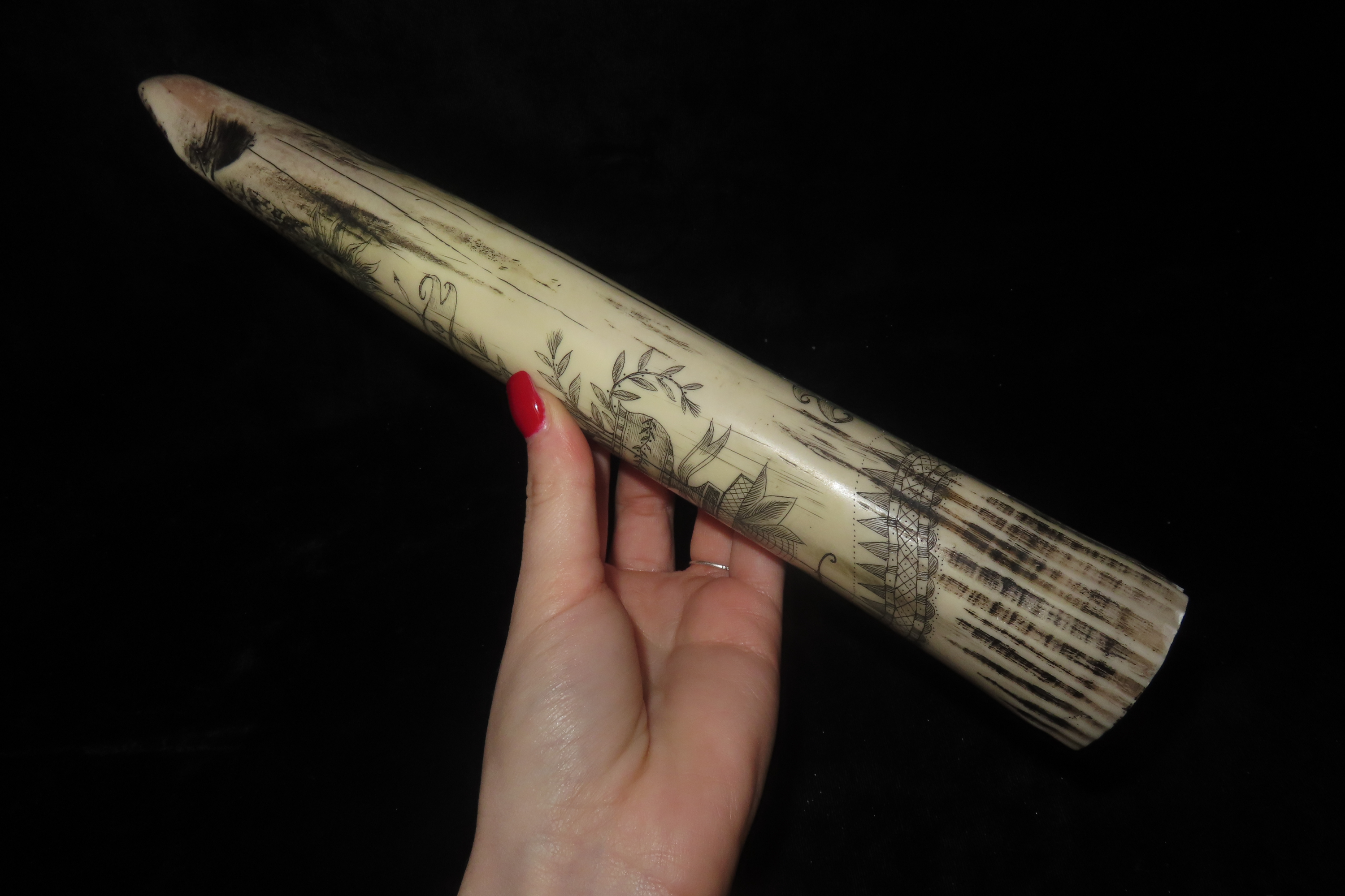 11 3/4″ Vintage Scrimshaw Walrus Tusk Carving, Reproduction, Intricate Design