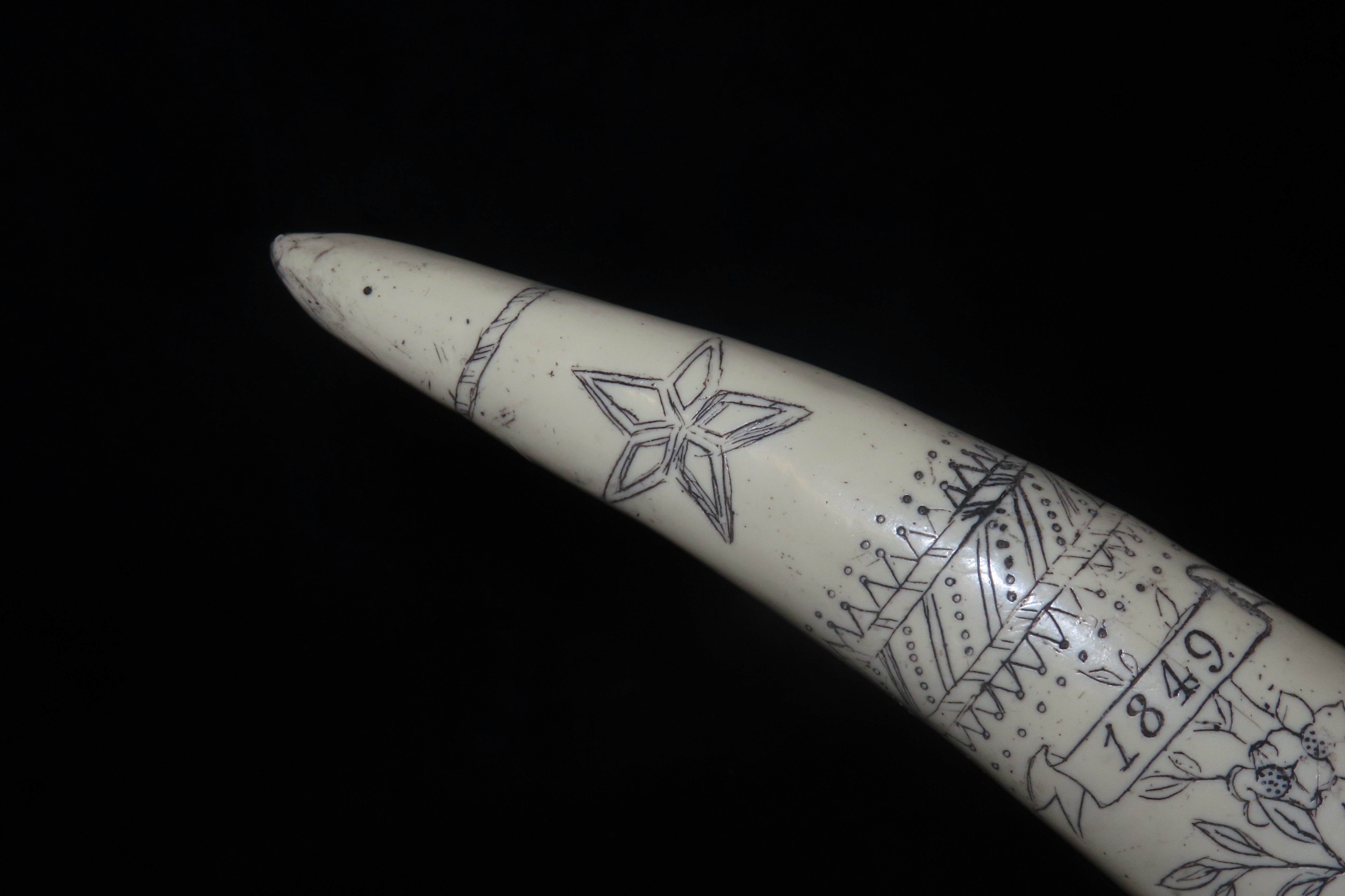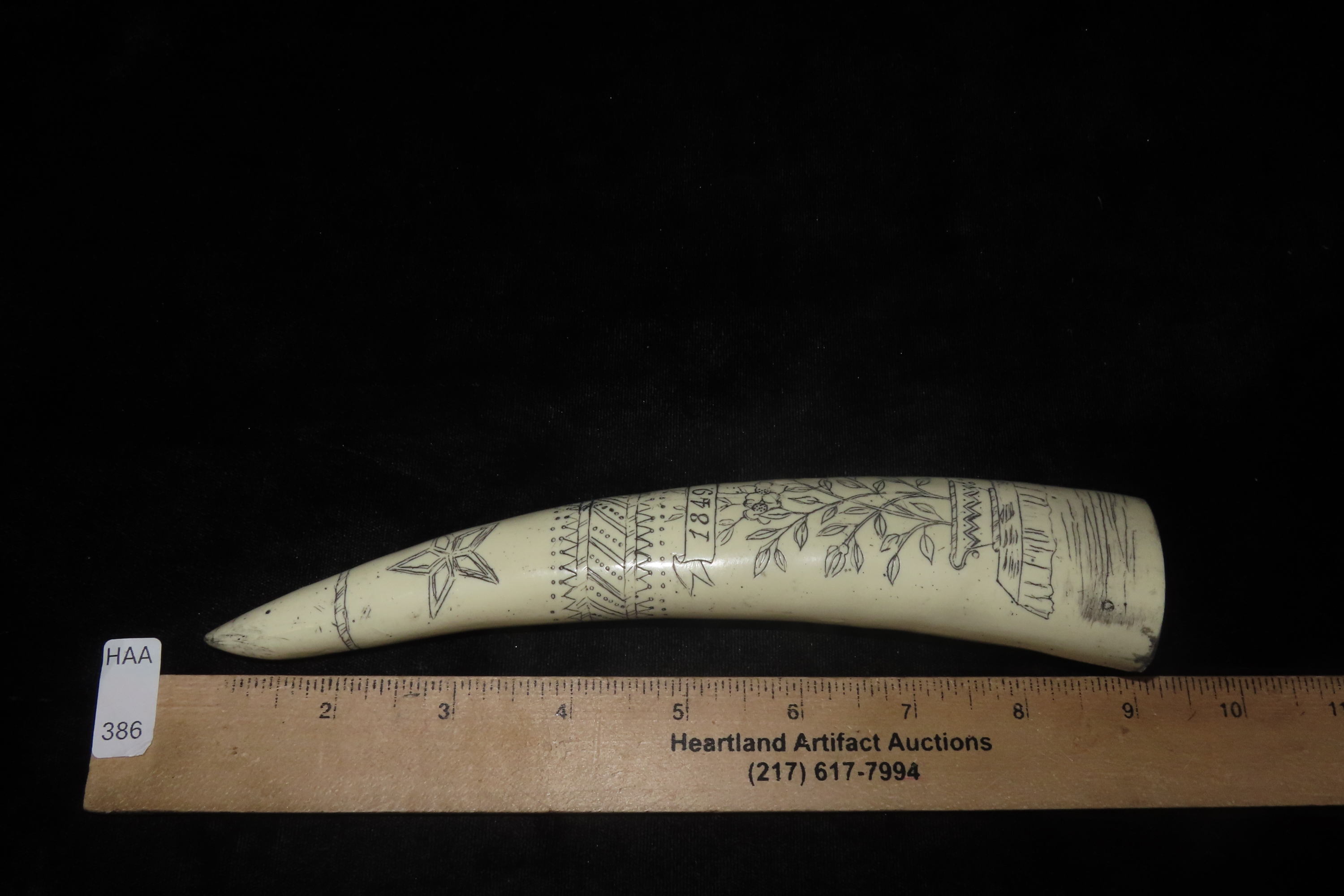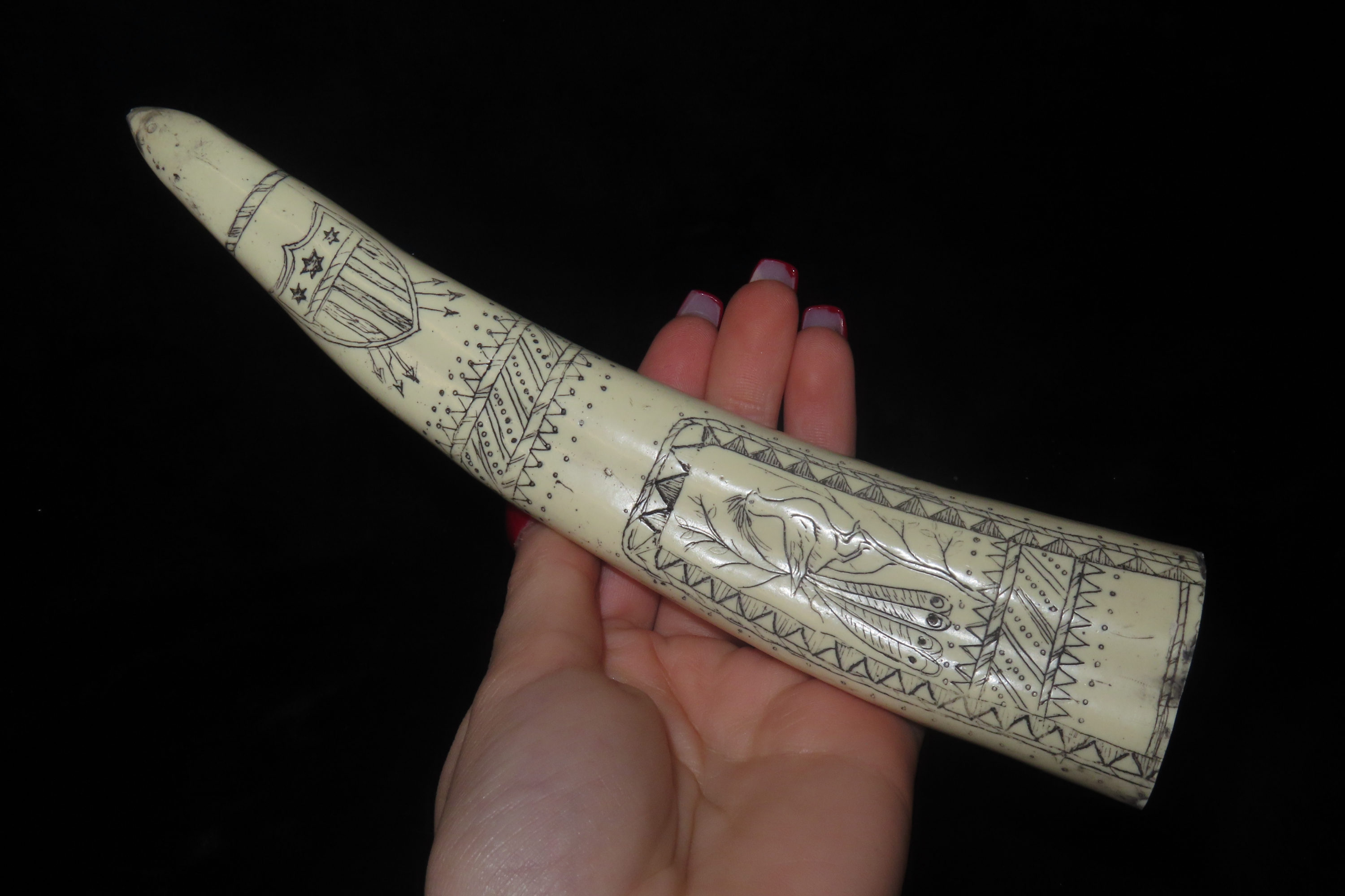 8 1/4″ Vintage Scrimshaw Walrus Tusk Carving, Reproduction, Intricate Design