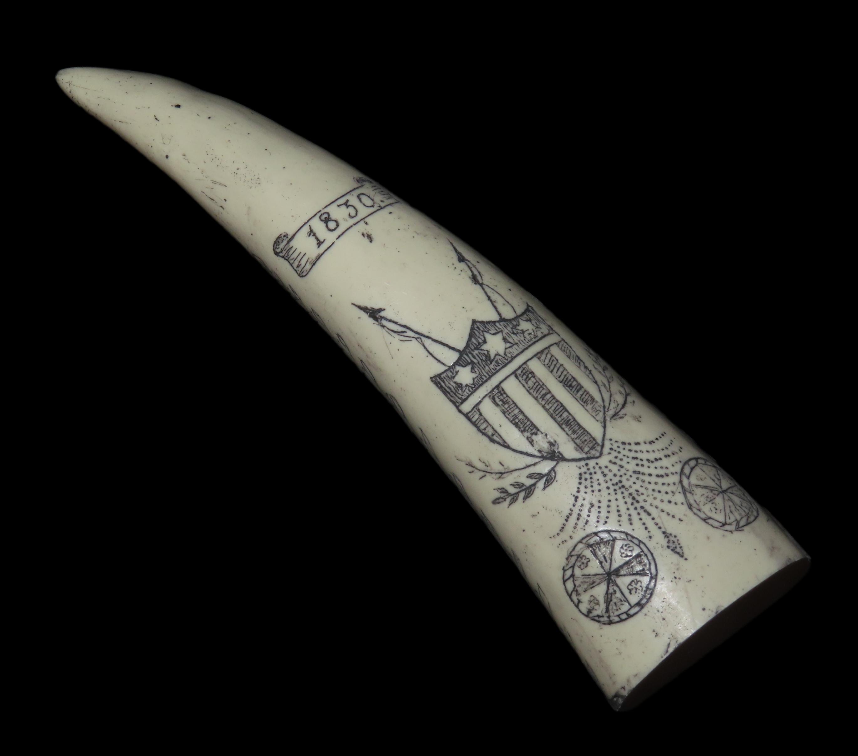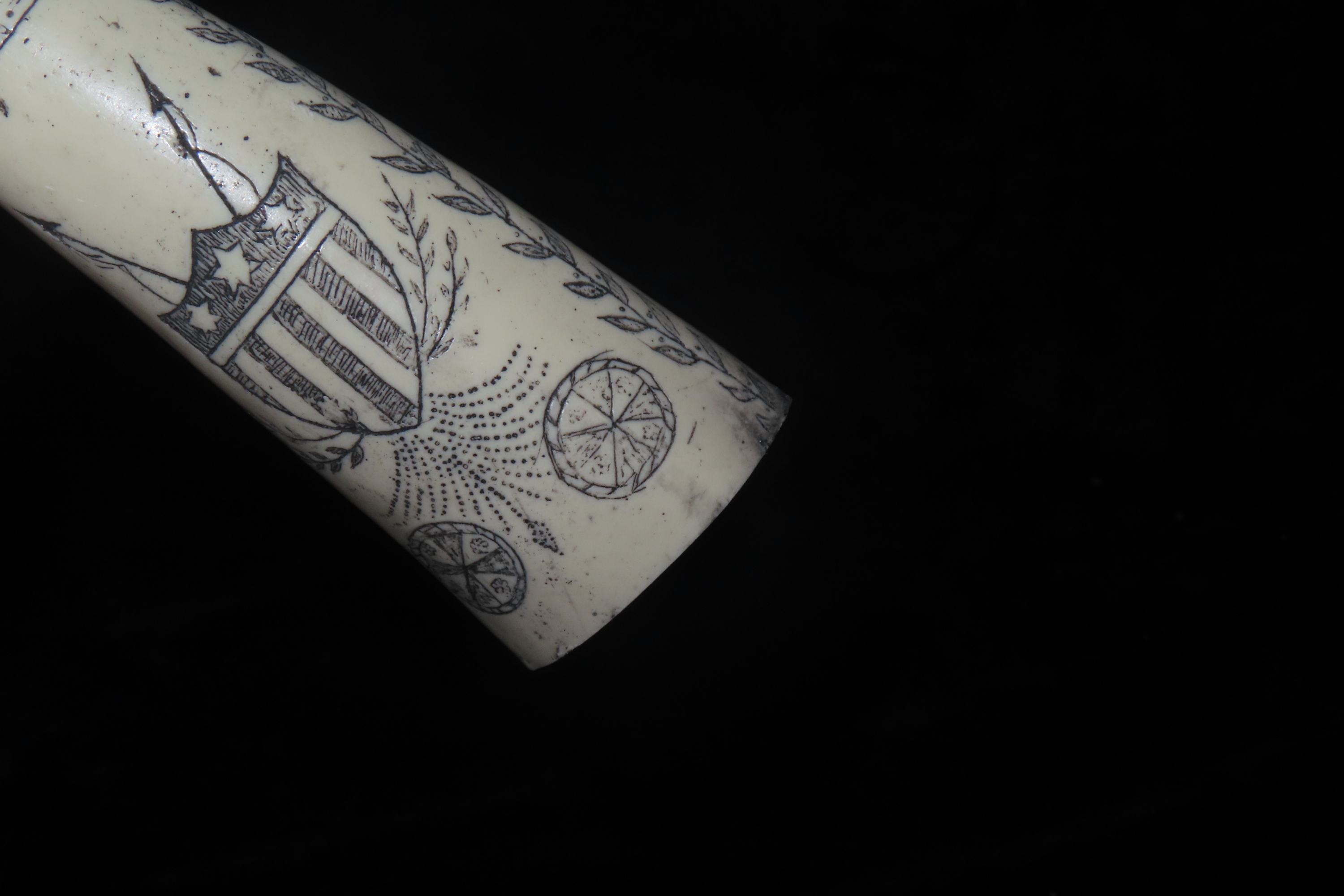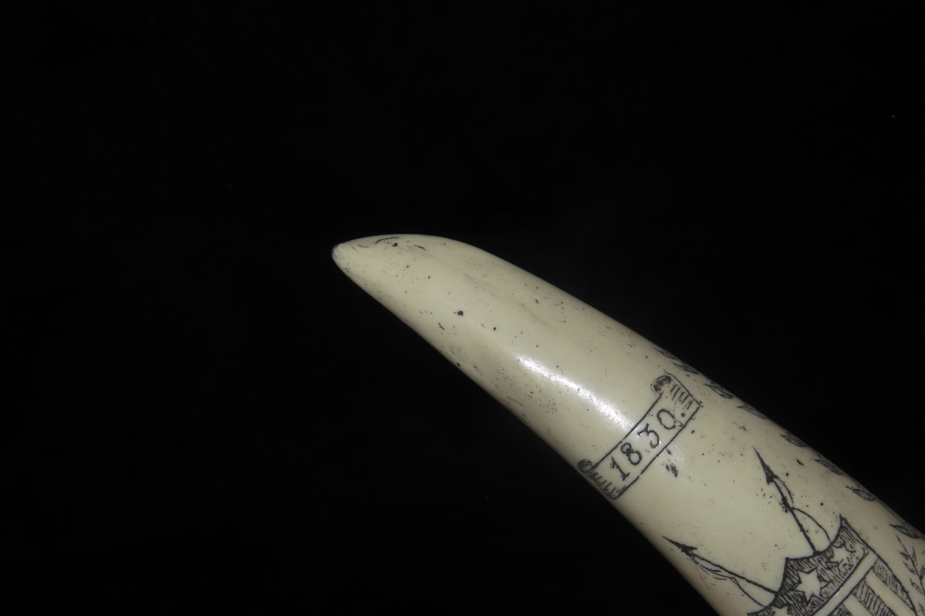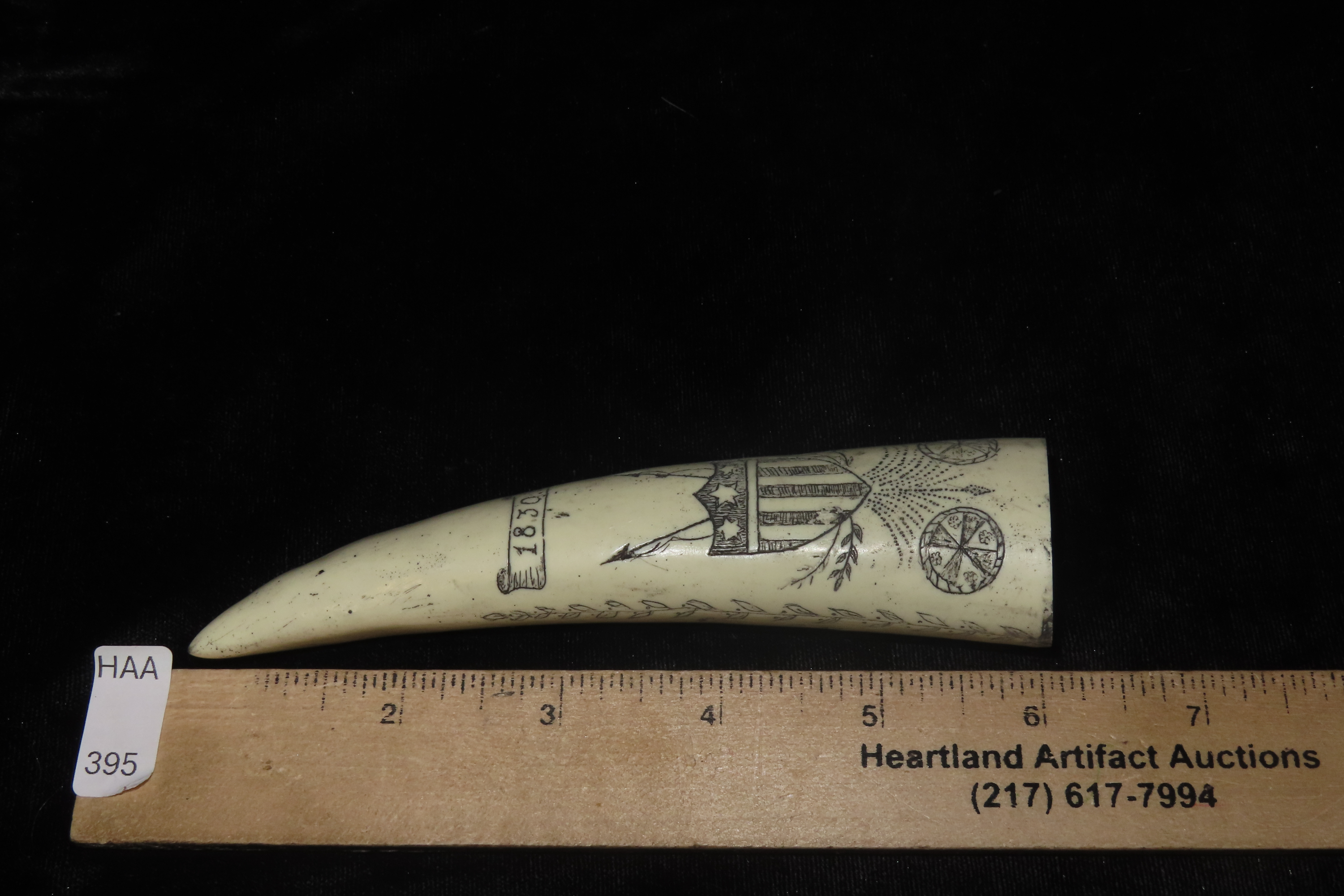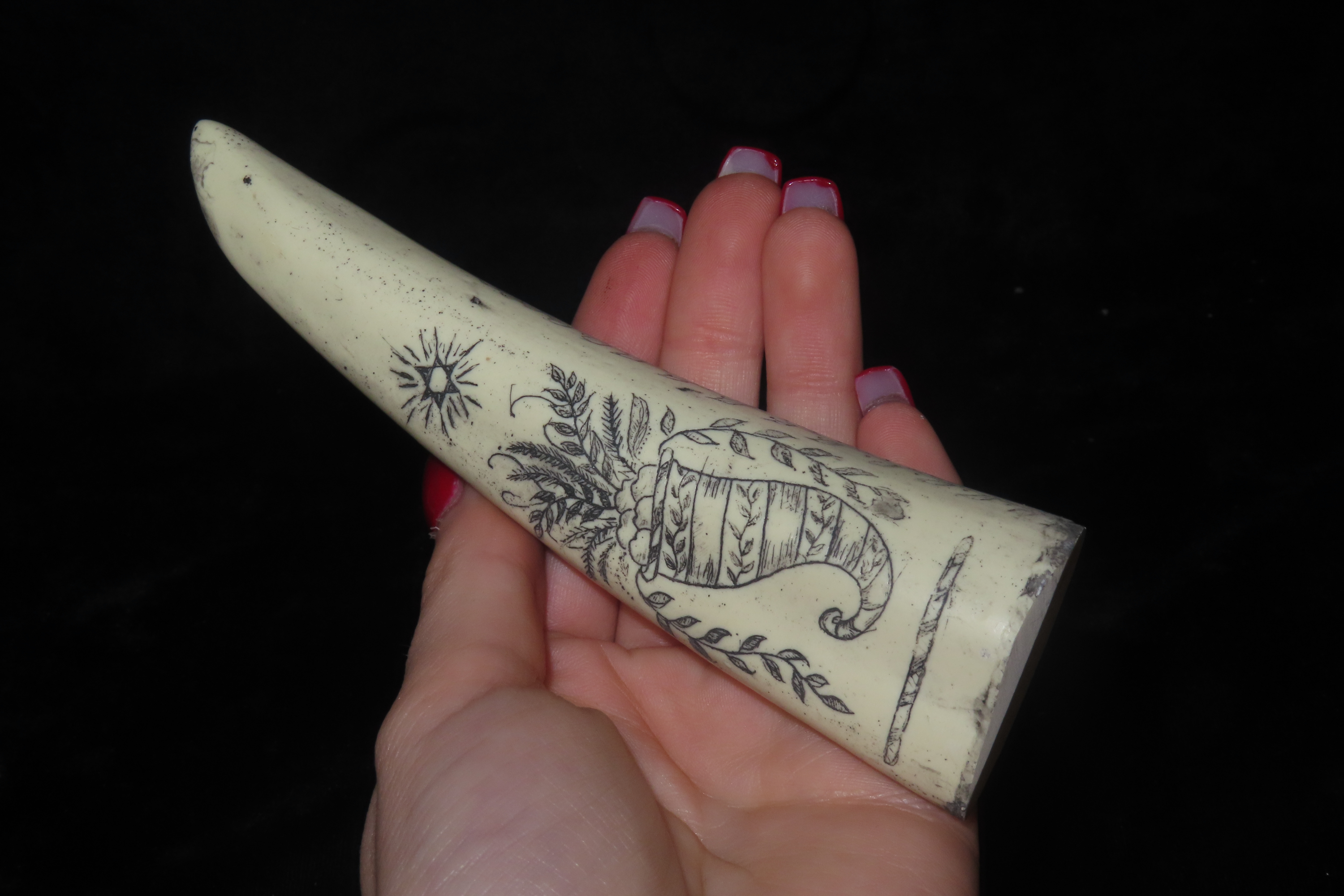 5 1/2″ Vintage Scrimshaw Walrus Tusk Carving, Reproduction, Intricate Design