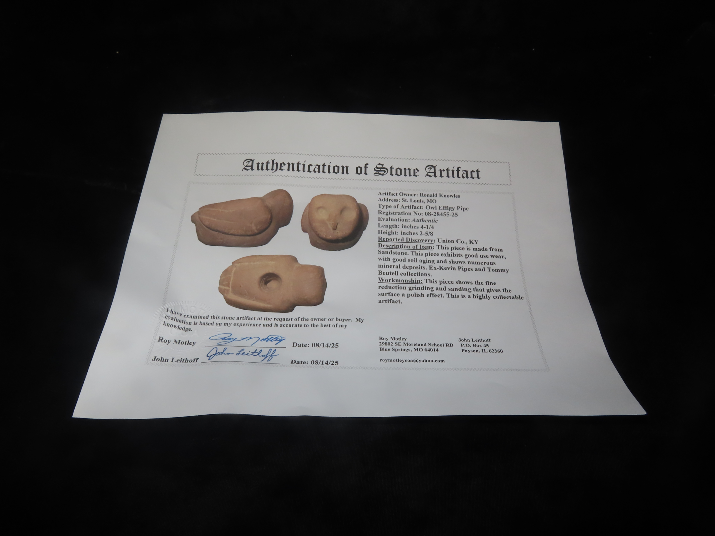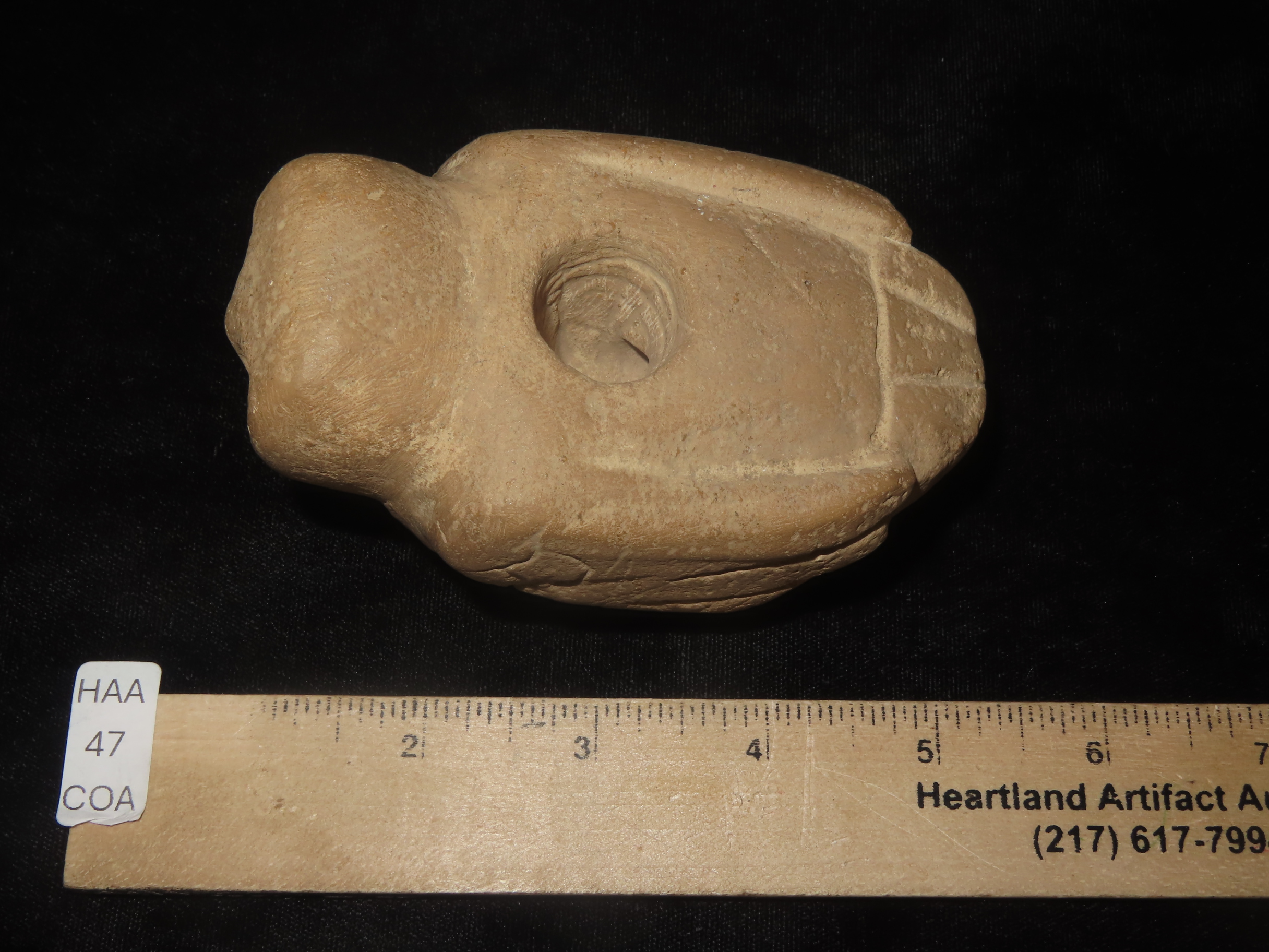 4 1/4″ Owl Effigy Pipe, Motley COA, Union County Kentucky