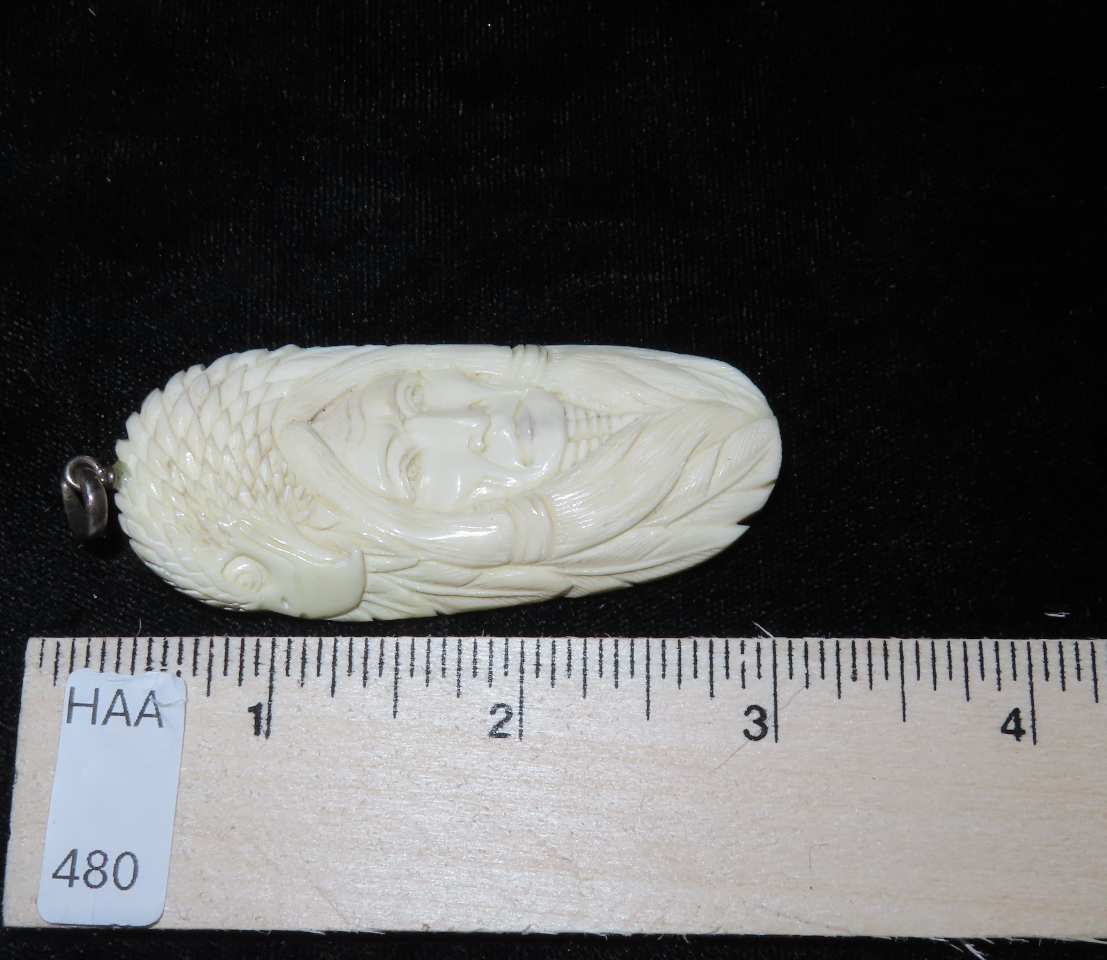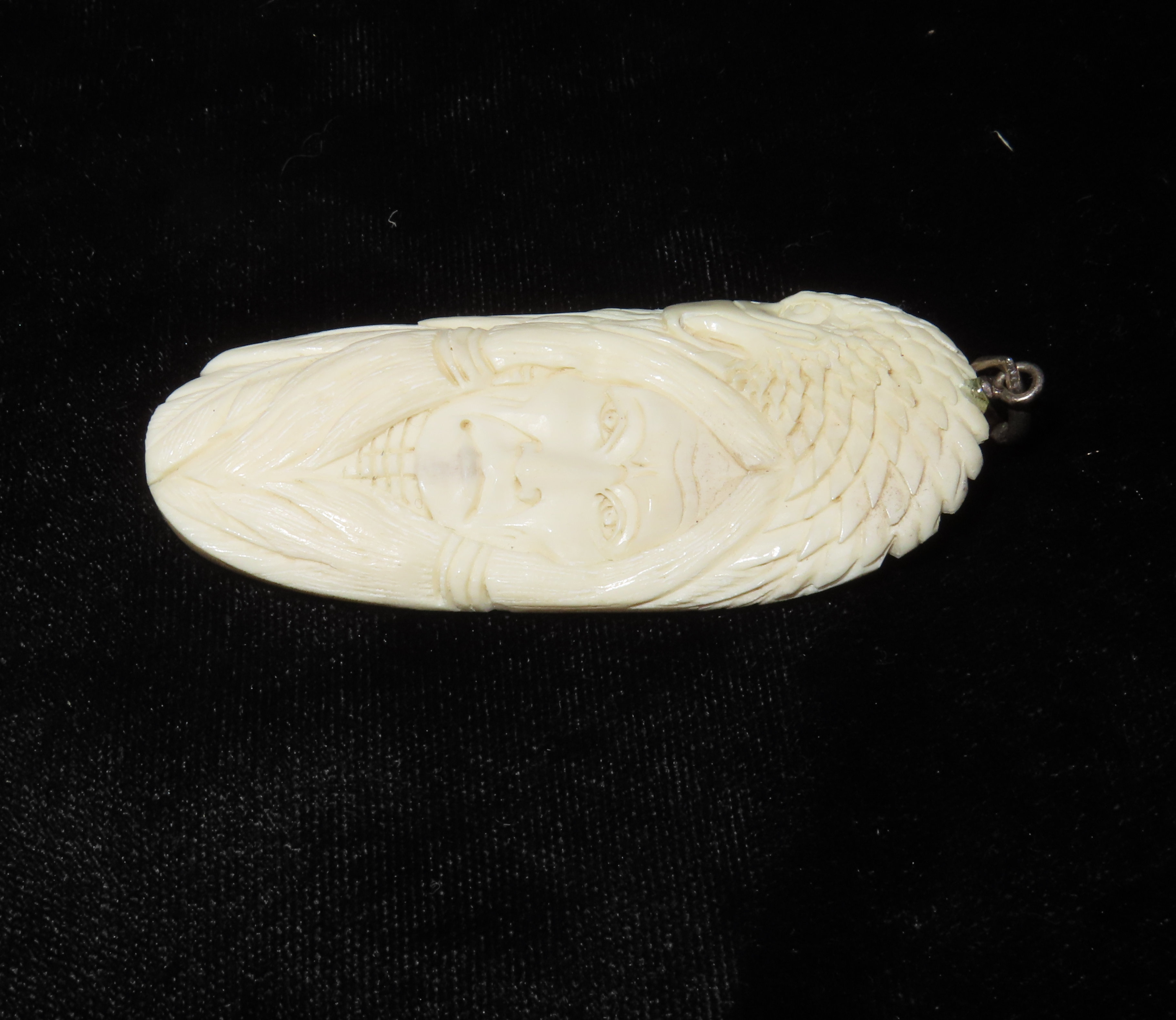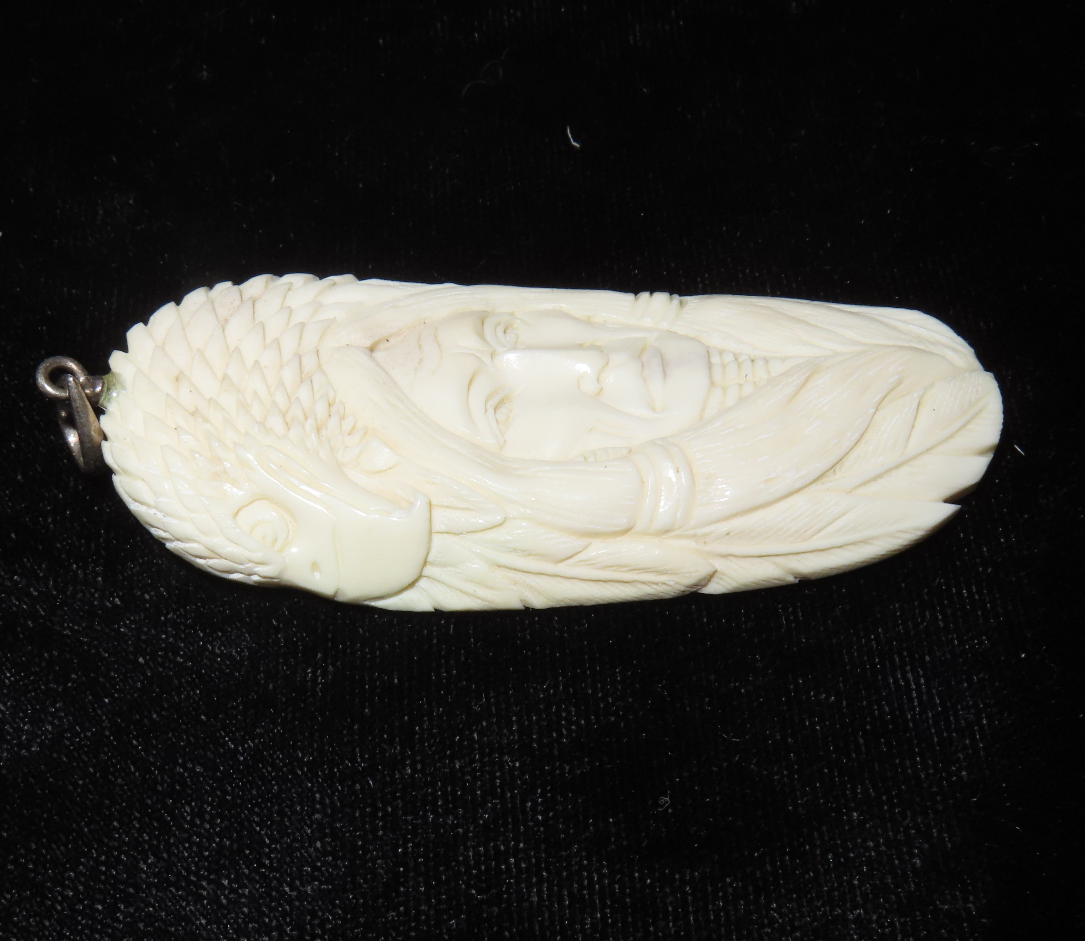 Carved Bone Indian & Eagle Pendant from Alaska, Very Intricate, Great Detail, 1950’s
