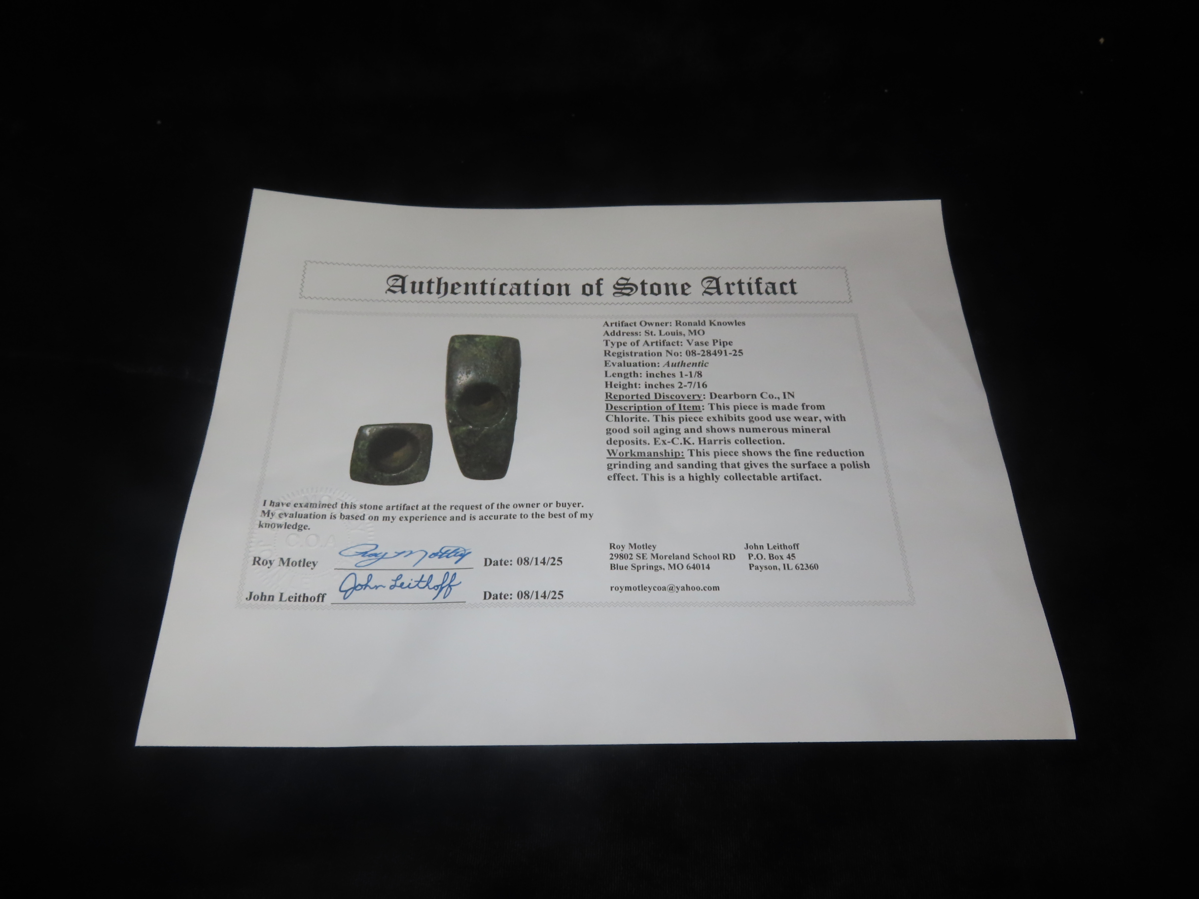 Amazing 2 7/16″ Chlorite Vase Pipe. Motley COA. Dearborn County Indiana, ex C.K. Harris
