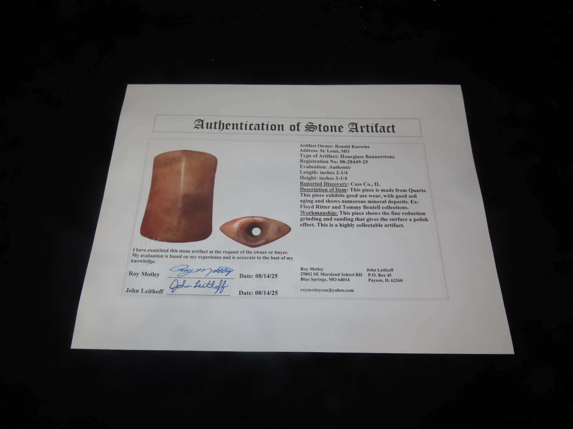 3 1/4″ Quartz Hourglass bannerstone, Motley COA, Cass County Illinois, Ex Ritter, Beutell