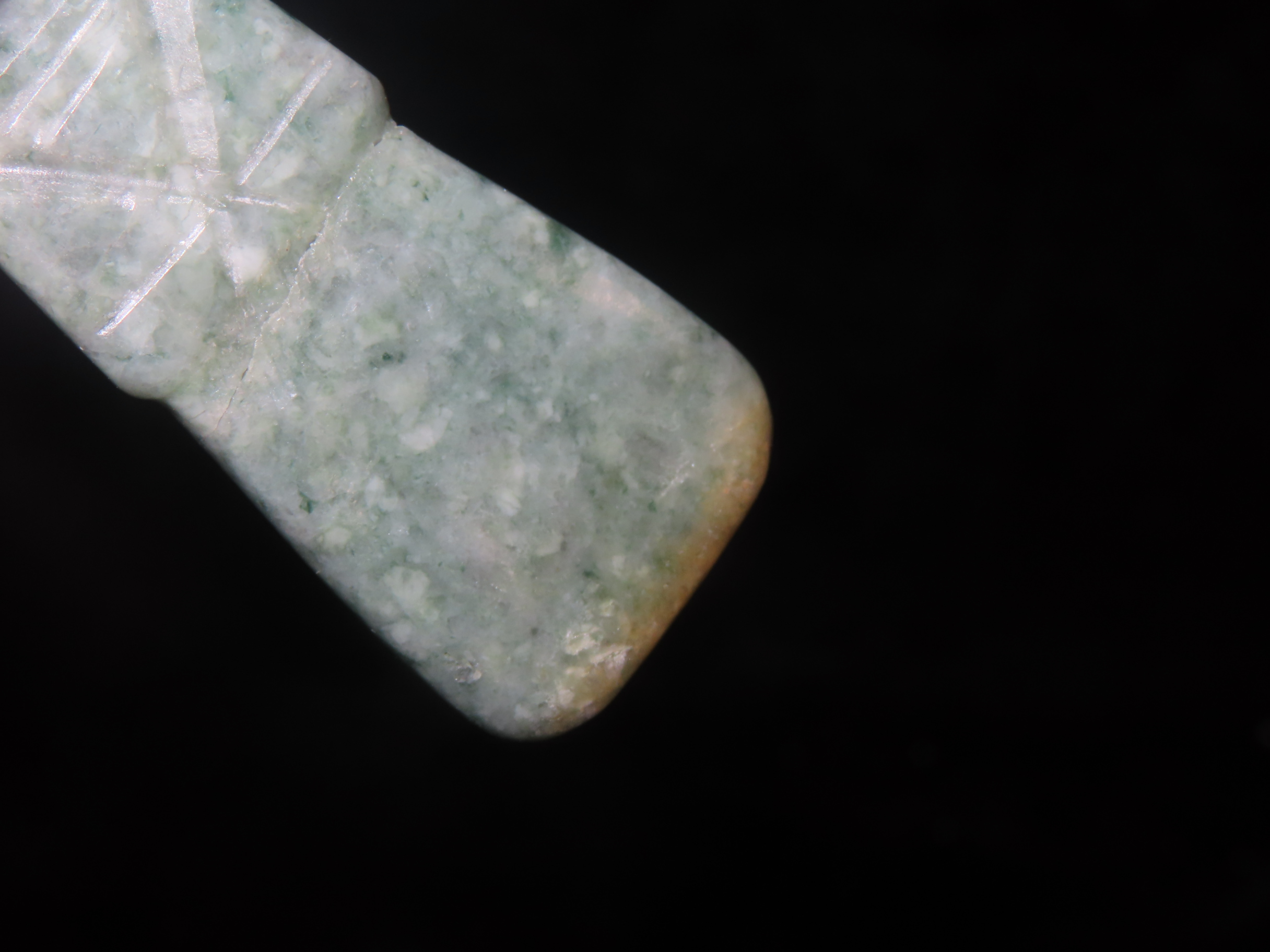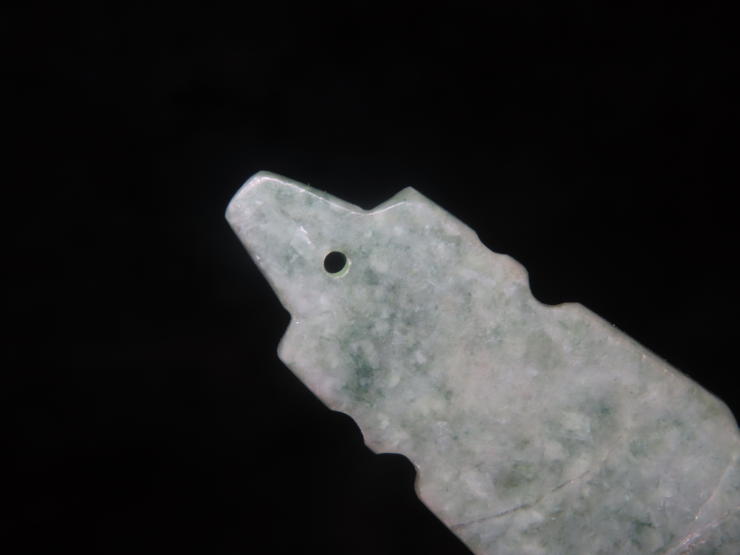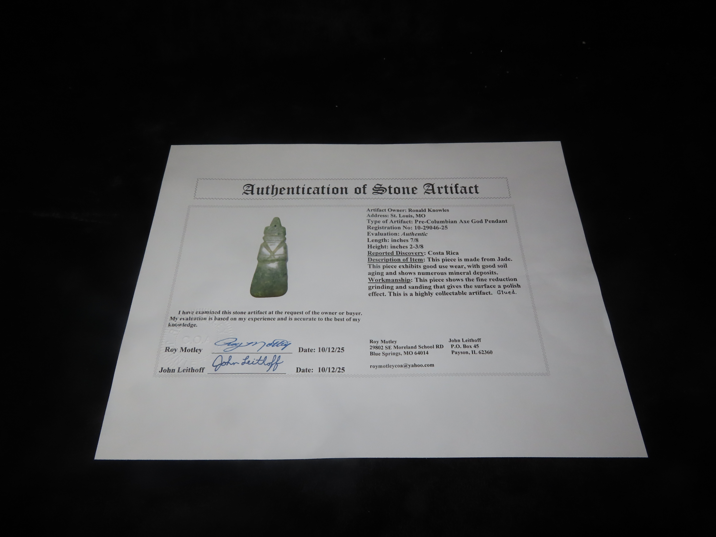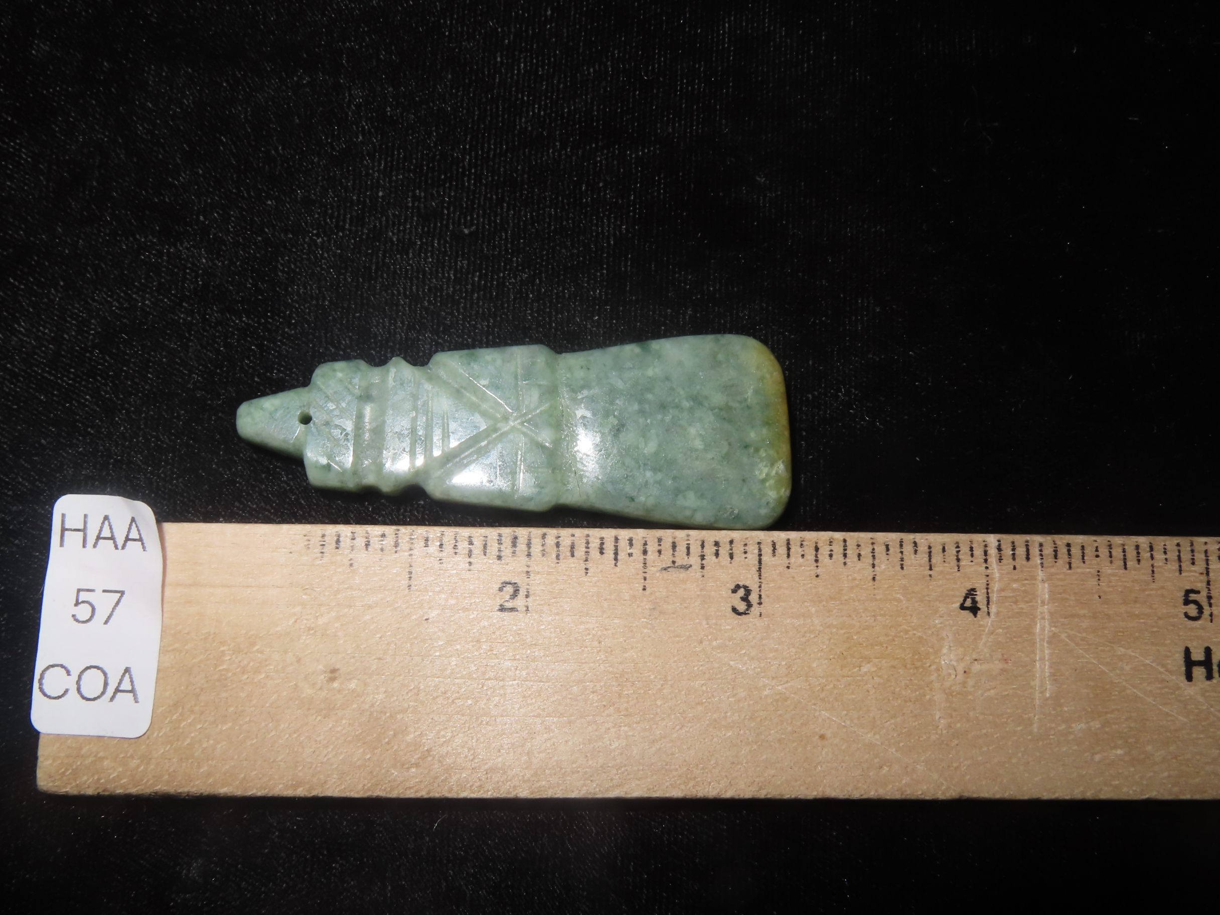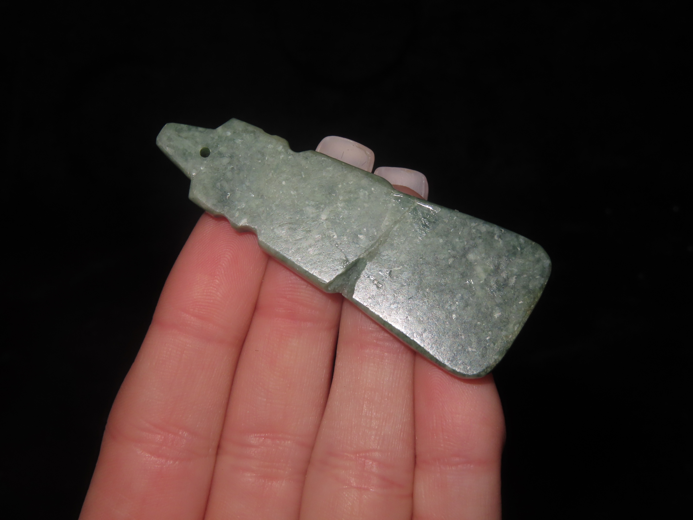 2 3/8″ Jade Axe God Pendant, Costa Rica, Motley COA, Nice Polish, Broken & Glued