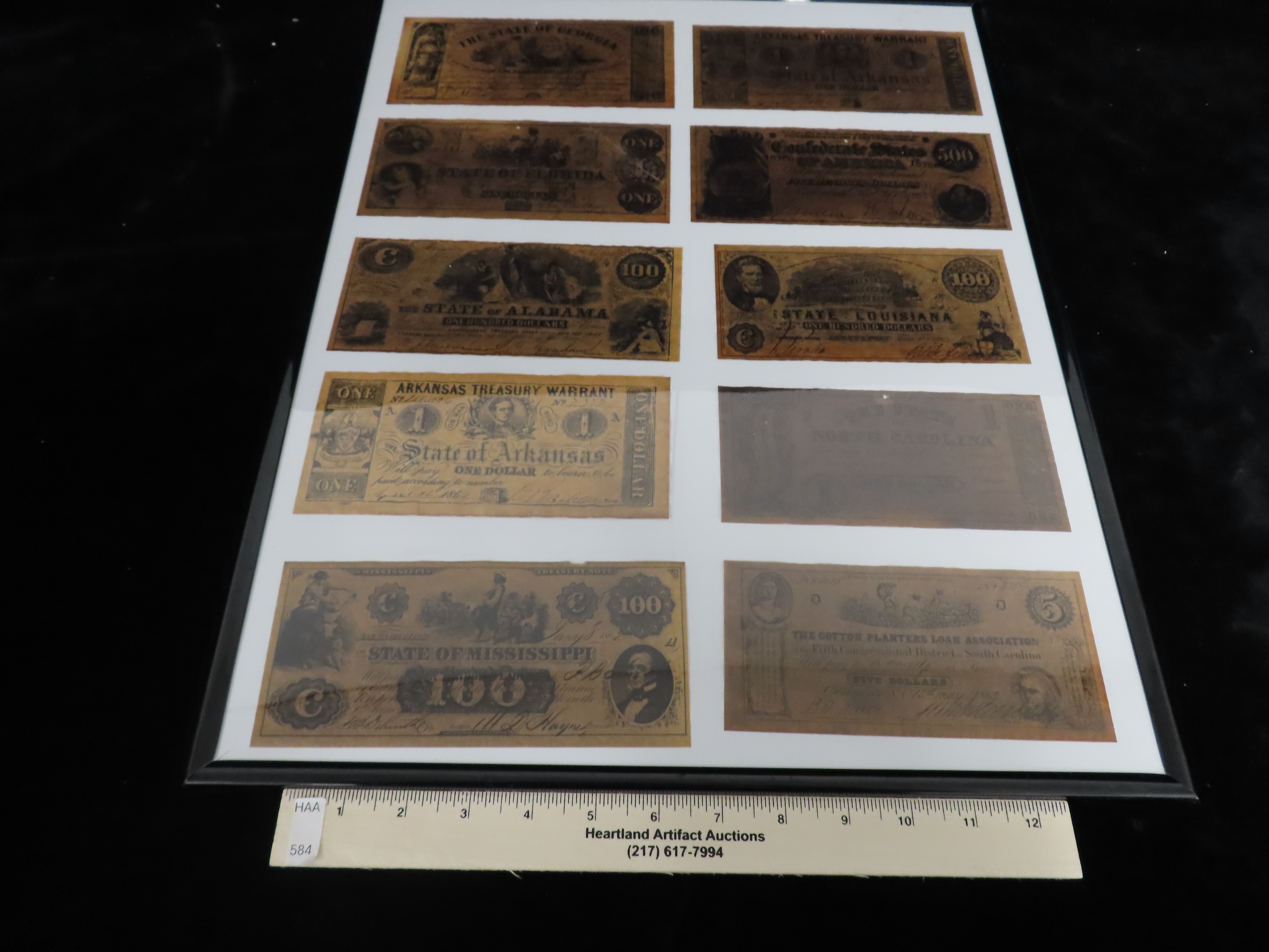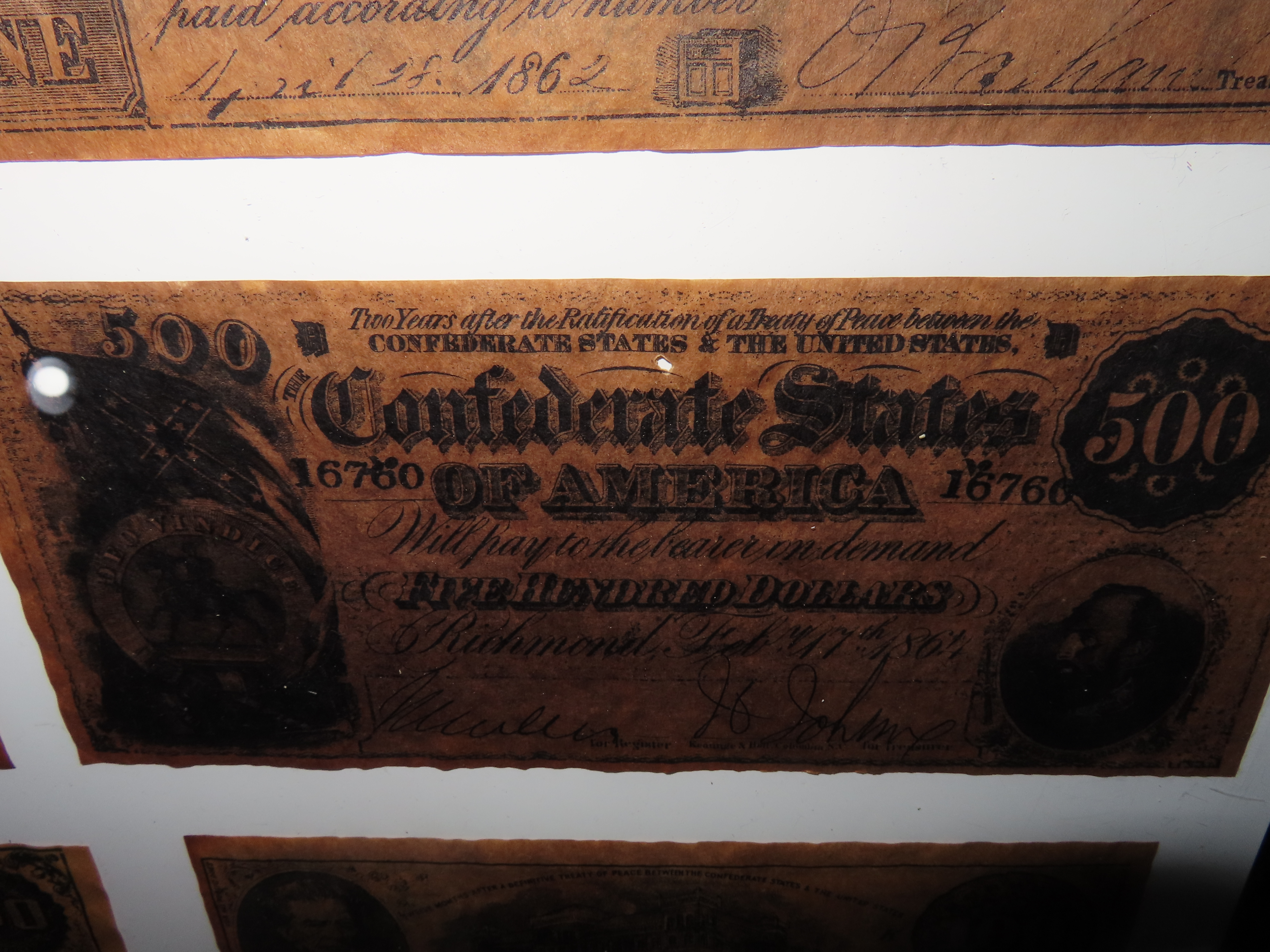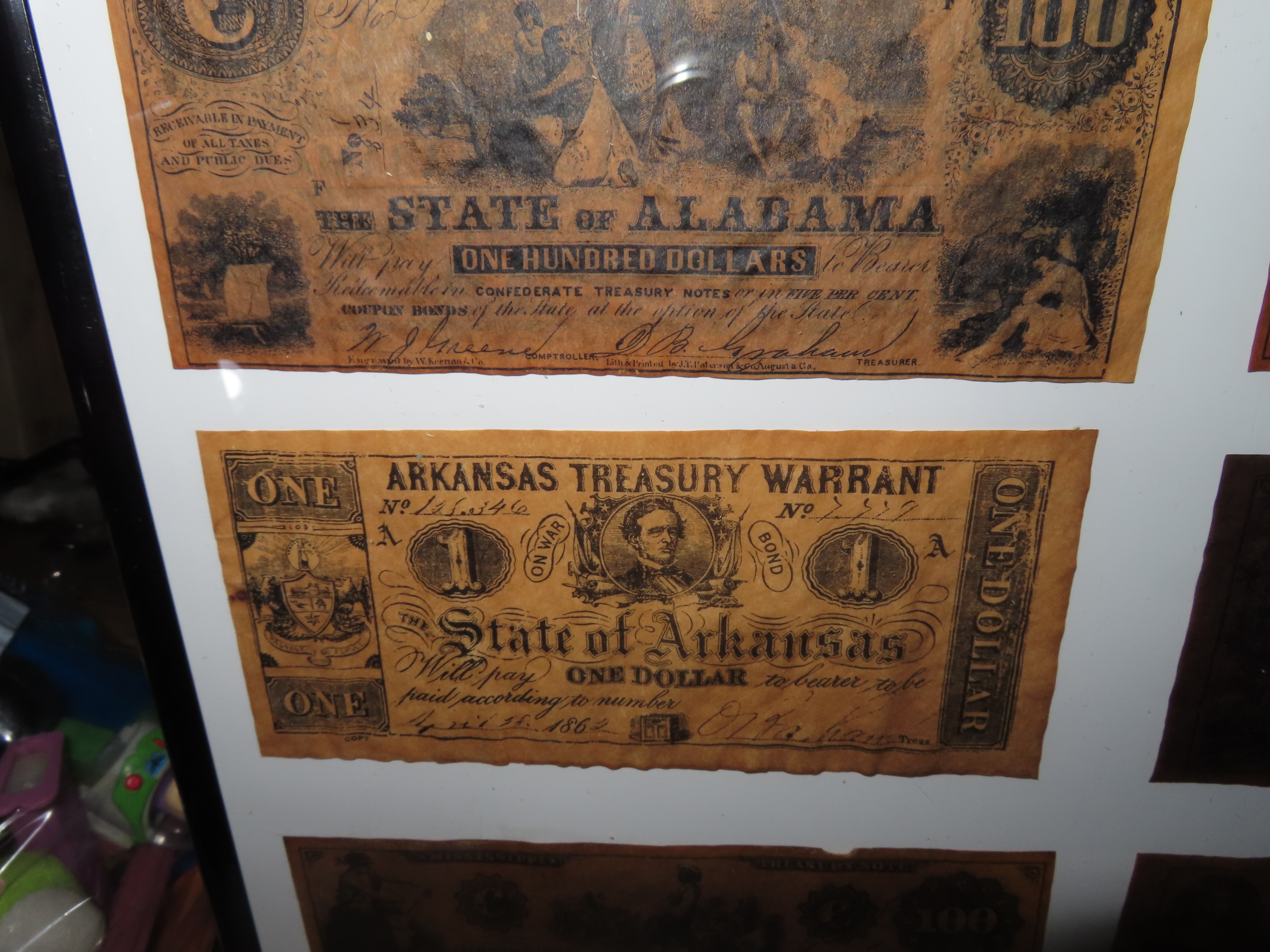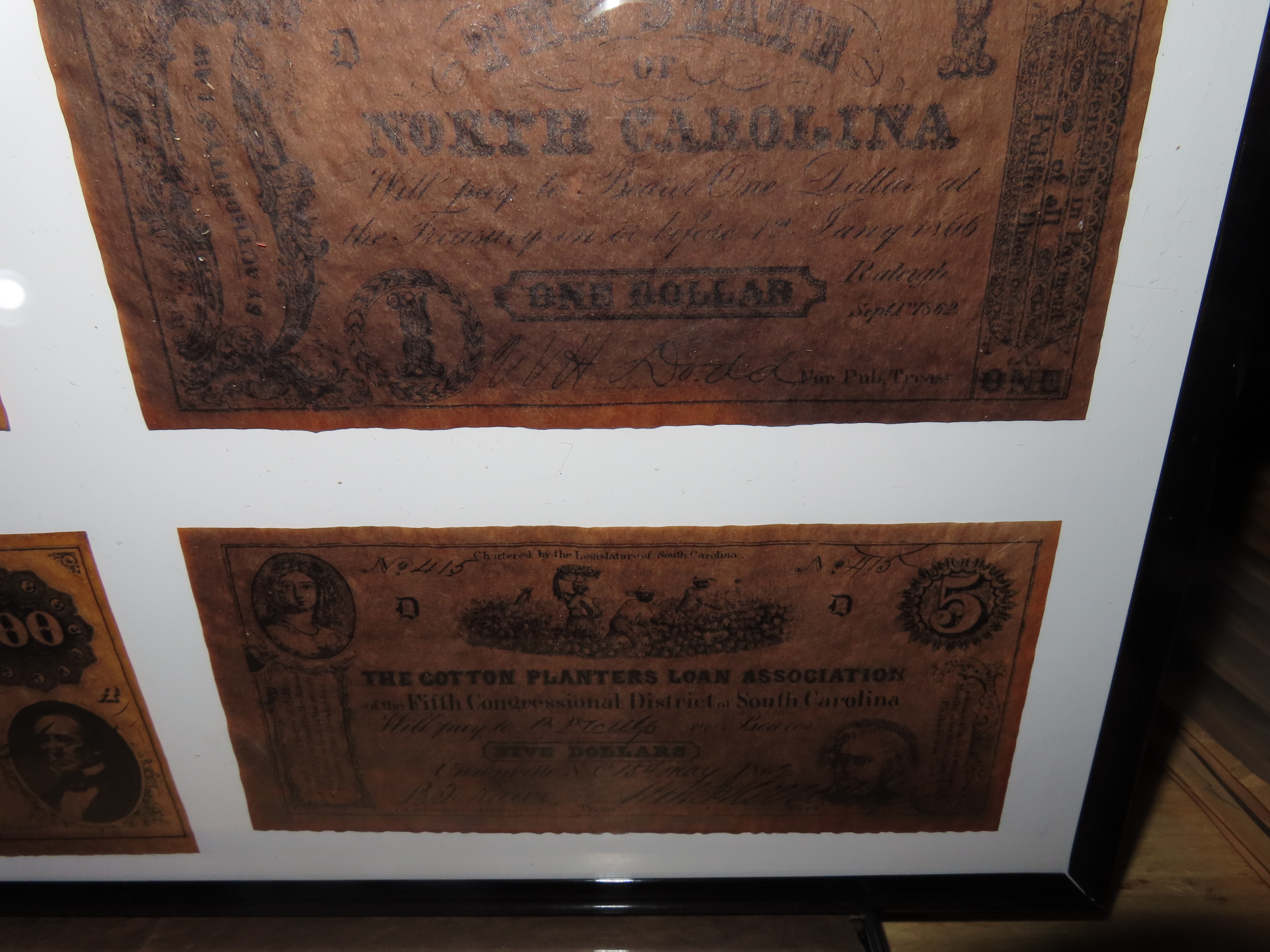 20″ x 16″ Framed Copies of Confederate Currency, Notes, Bills, $1, $5, $100, $500