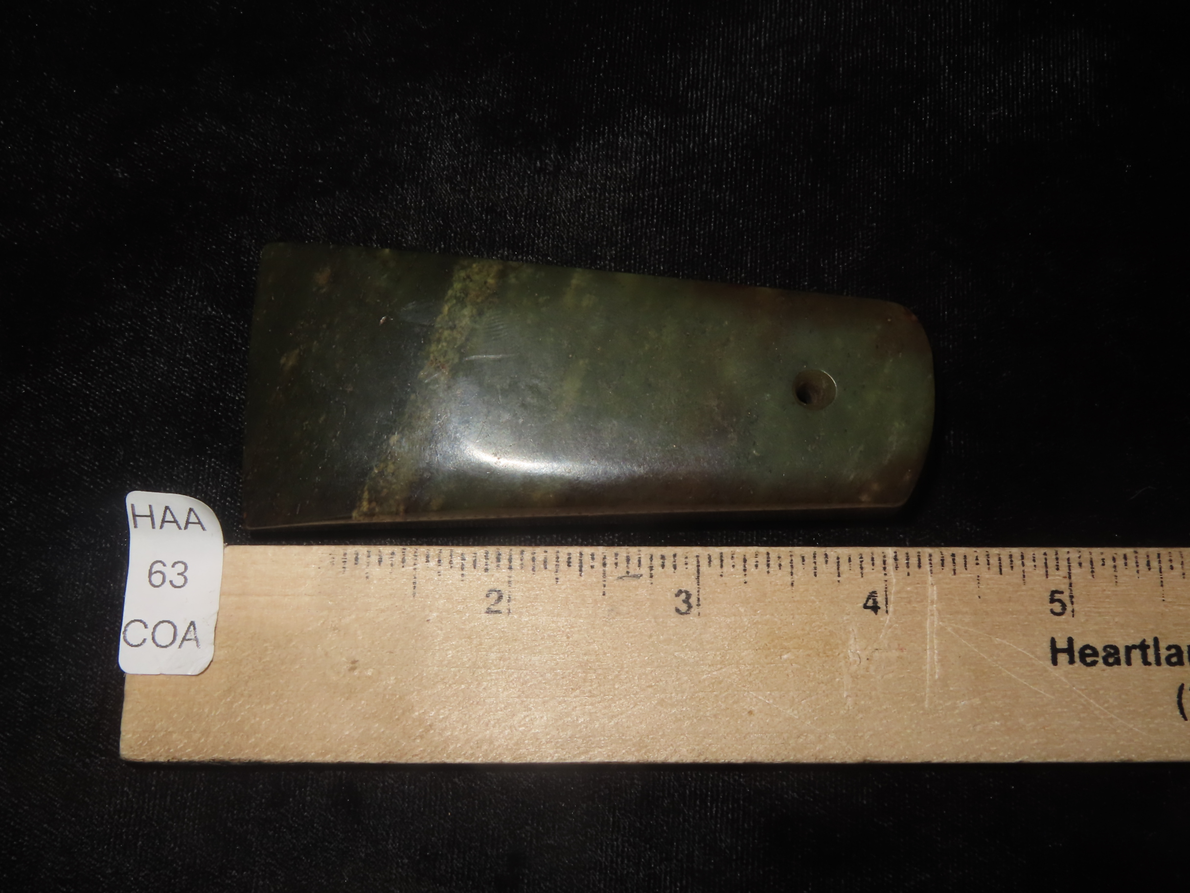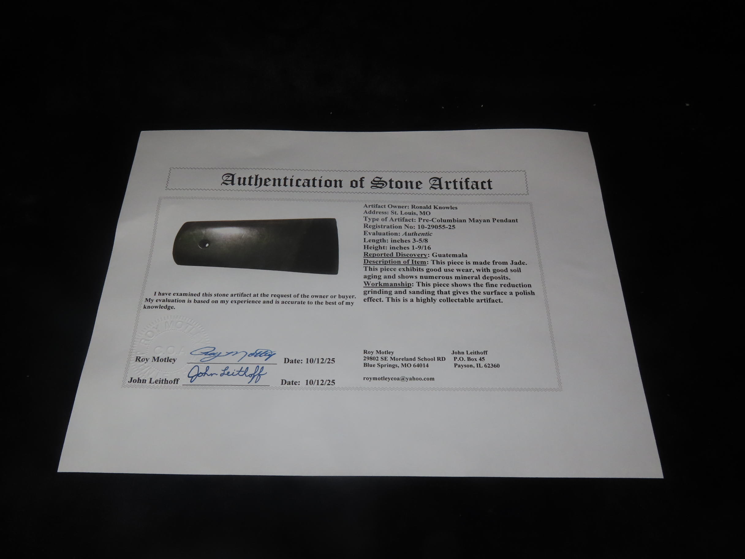 3 5/8″ Mayan Jade Pendant, Guatemala, Motley COA, Highly Translucent & Great Polish