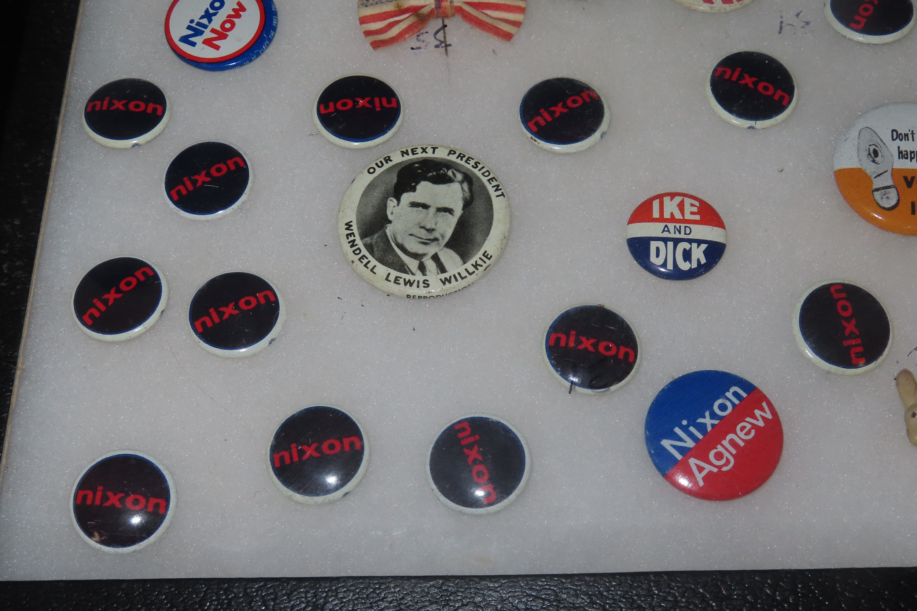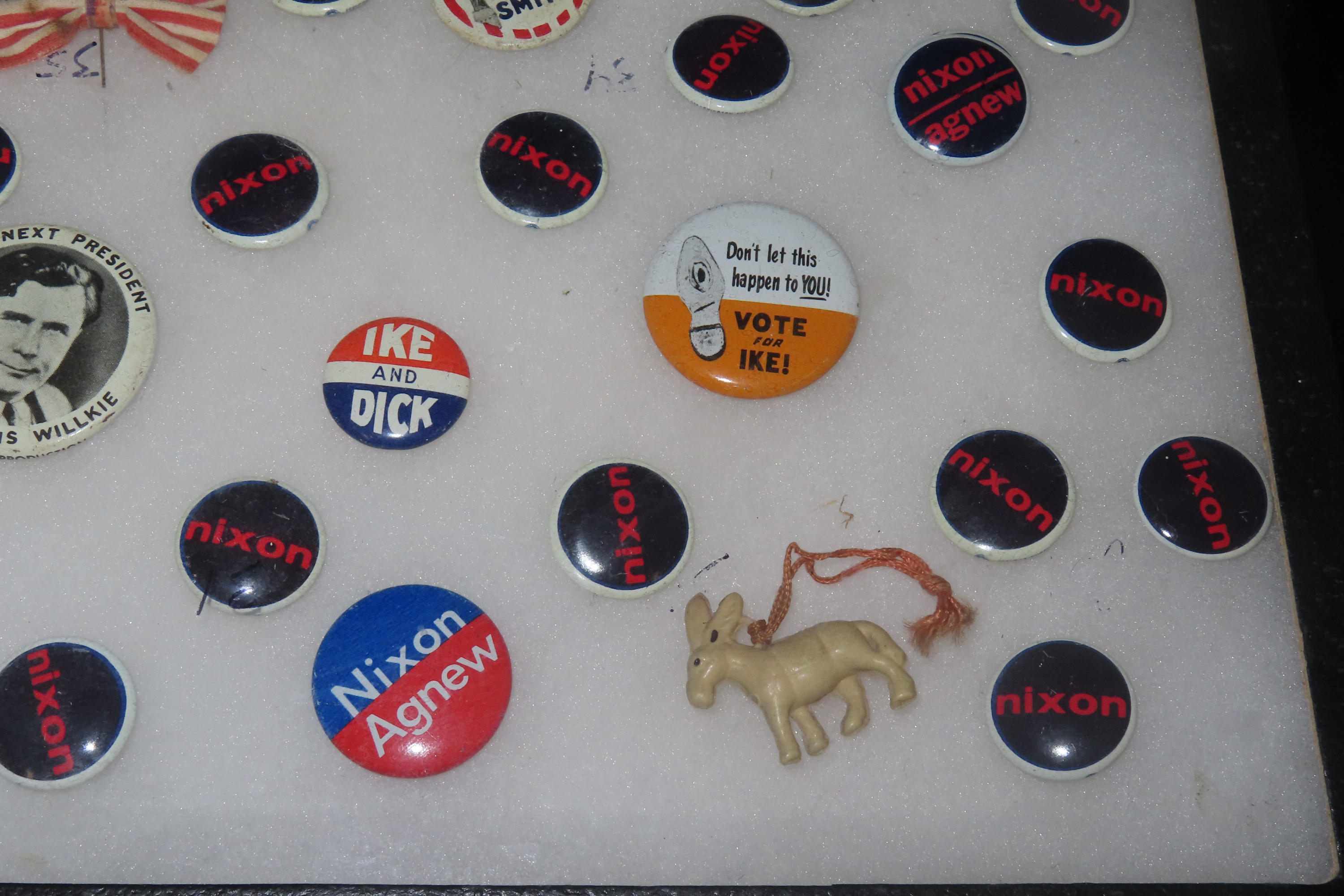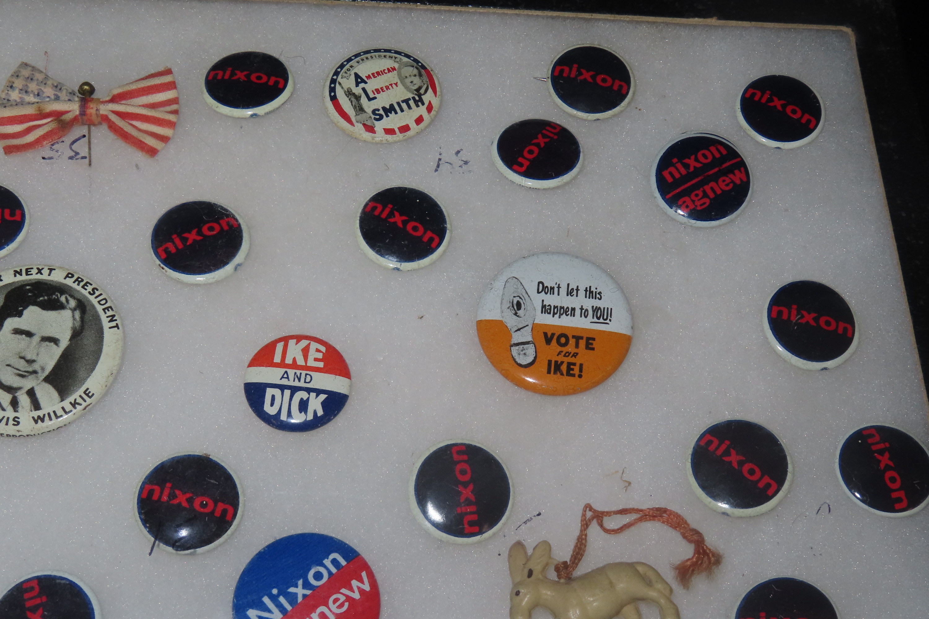 Framed Collection of Vintage Political Buttons, Advertising, Pins, etc.