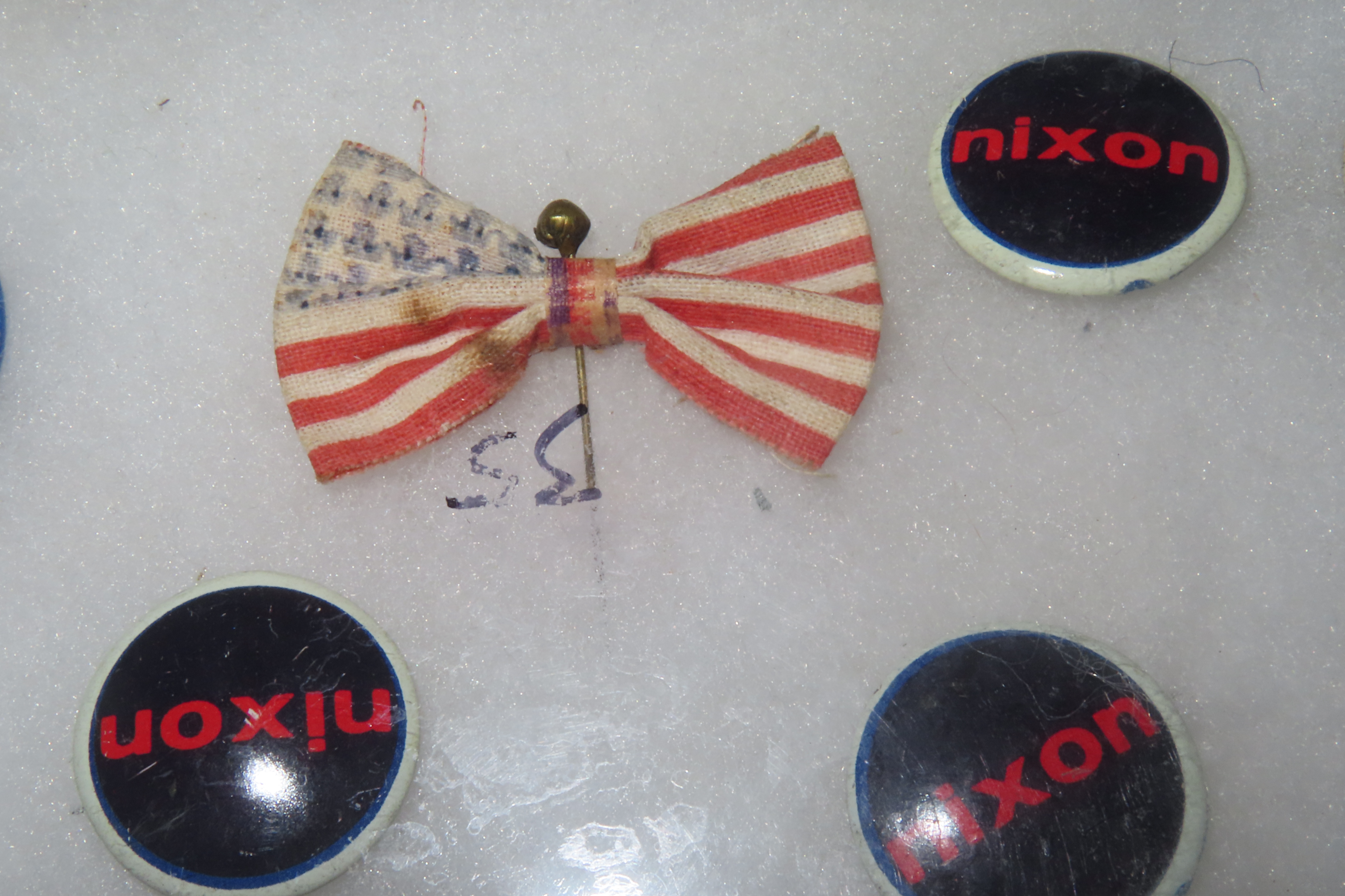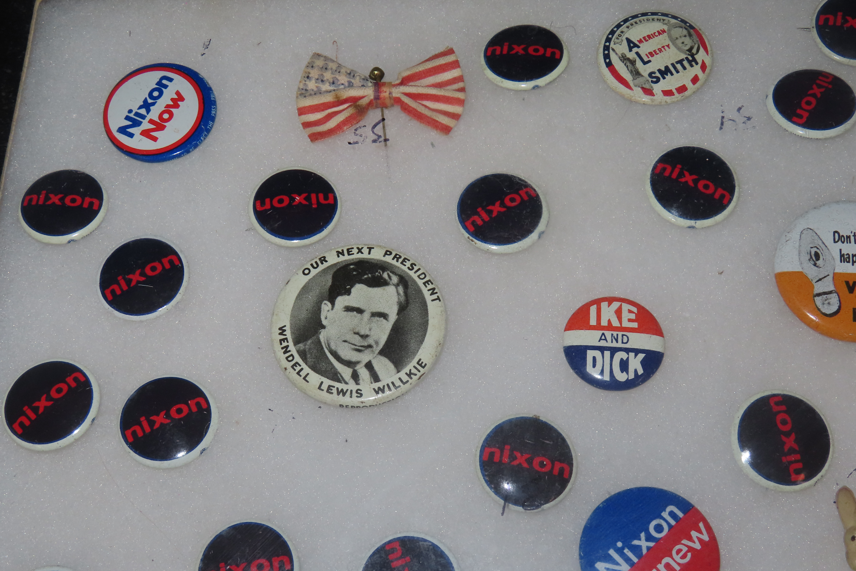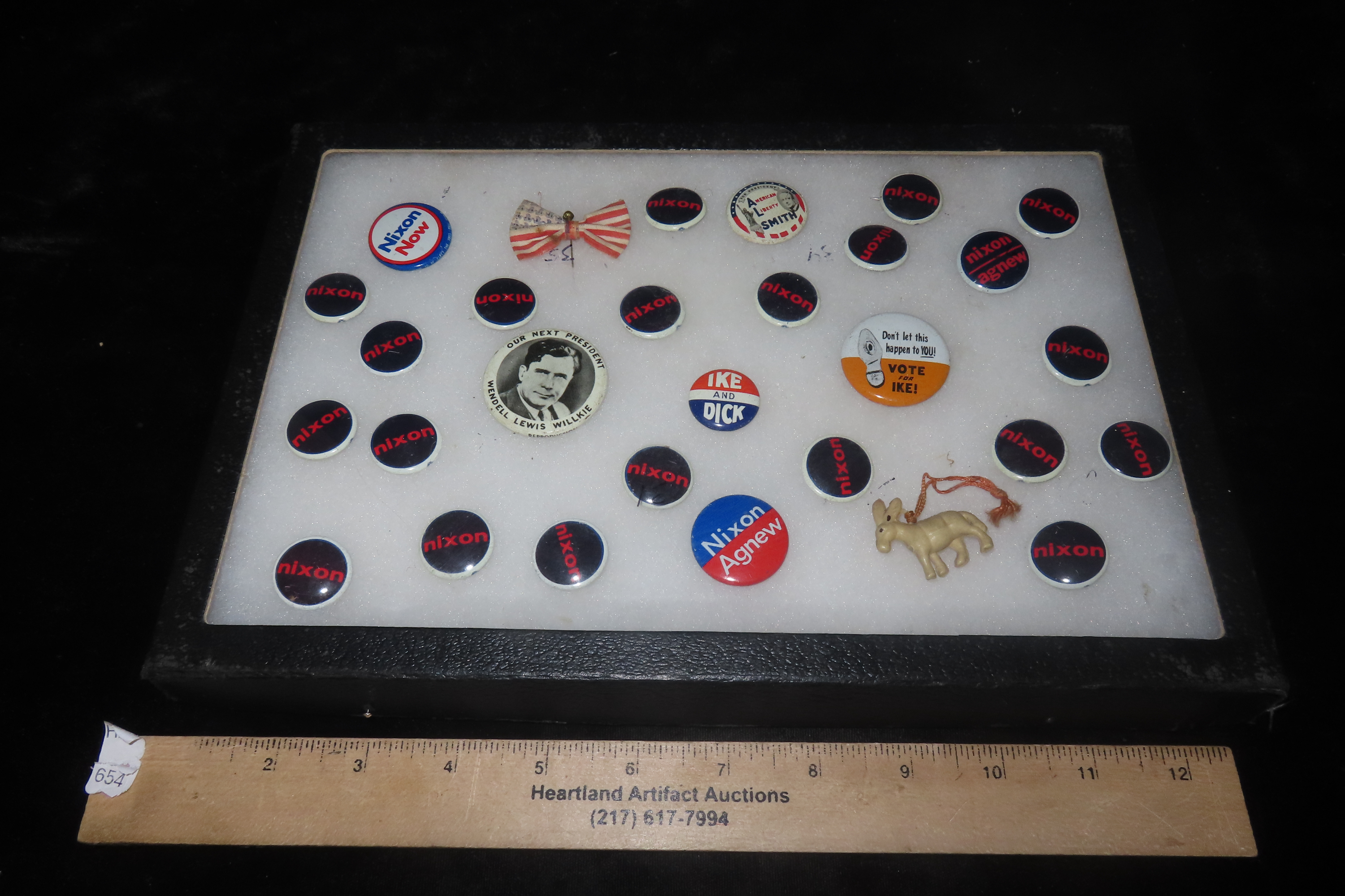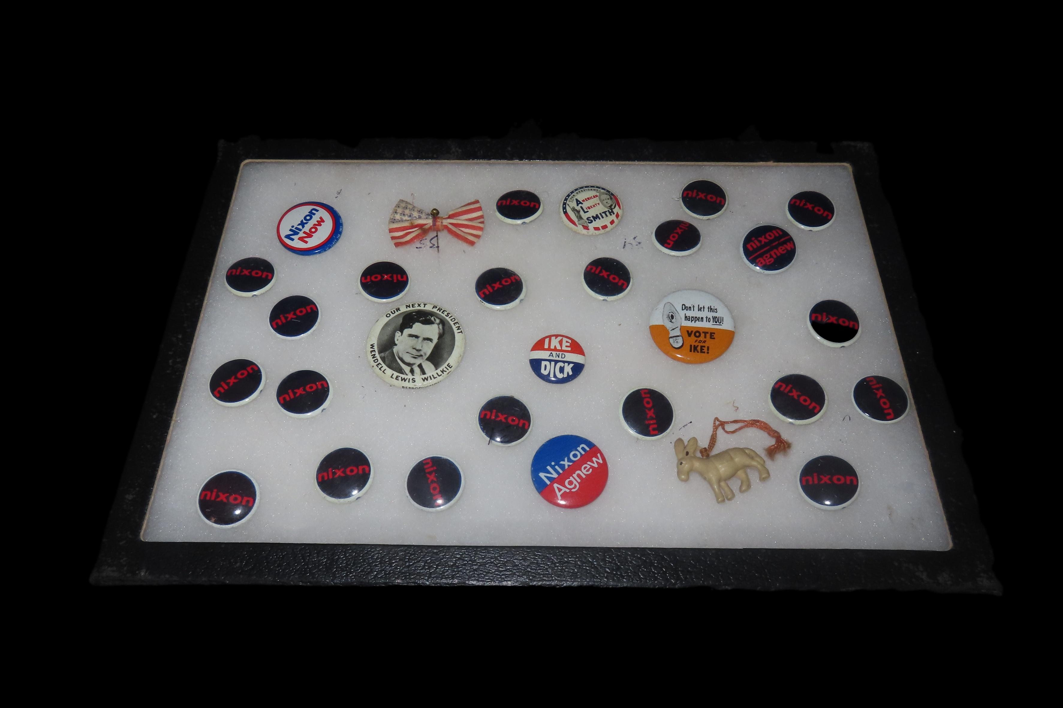 Framed Collection of Vintage Political Buttons, Advertising, Pins, etc.