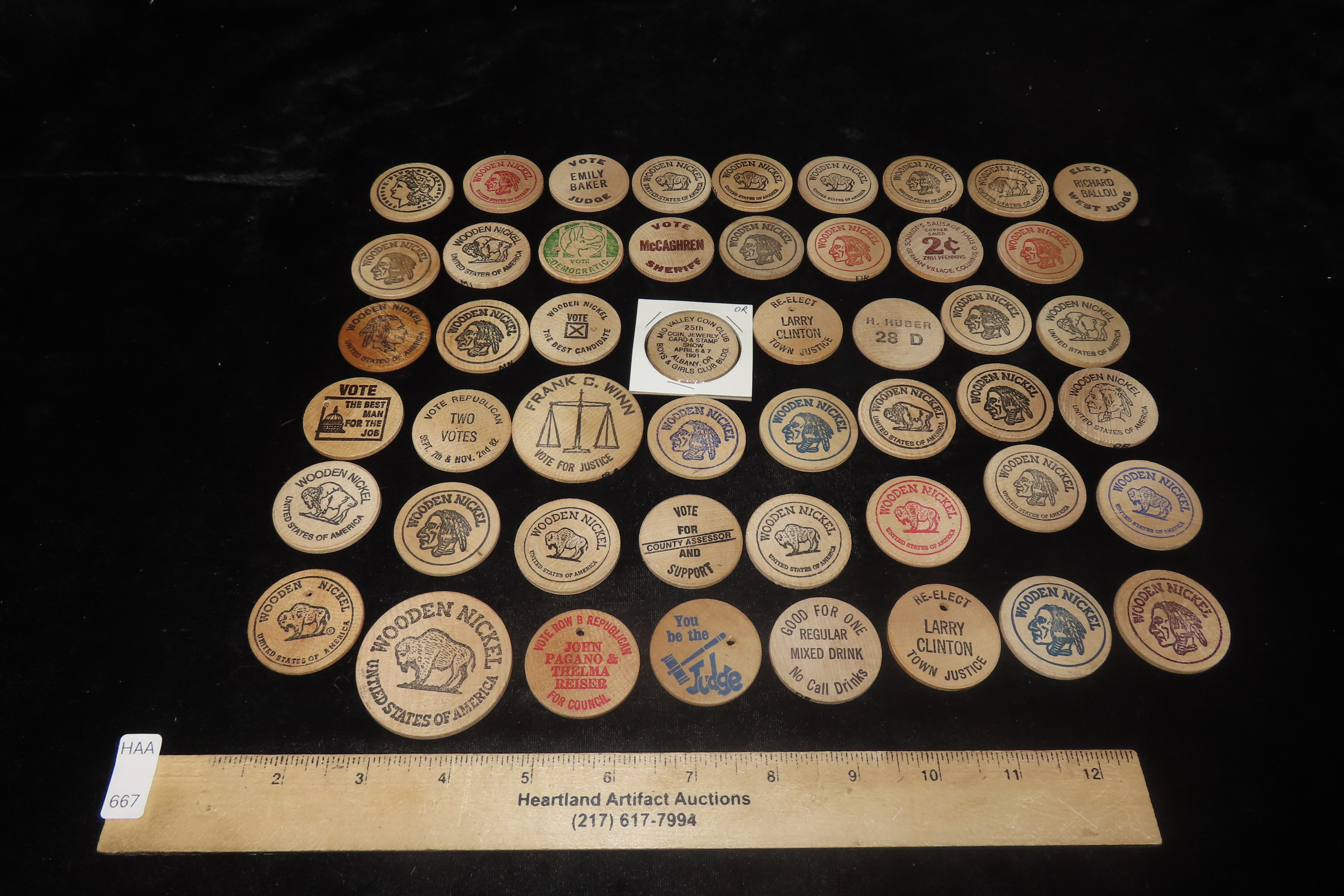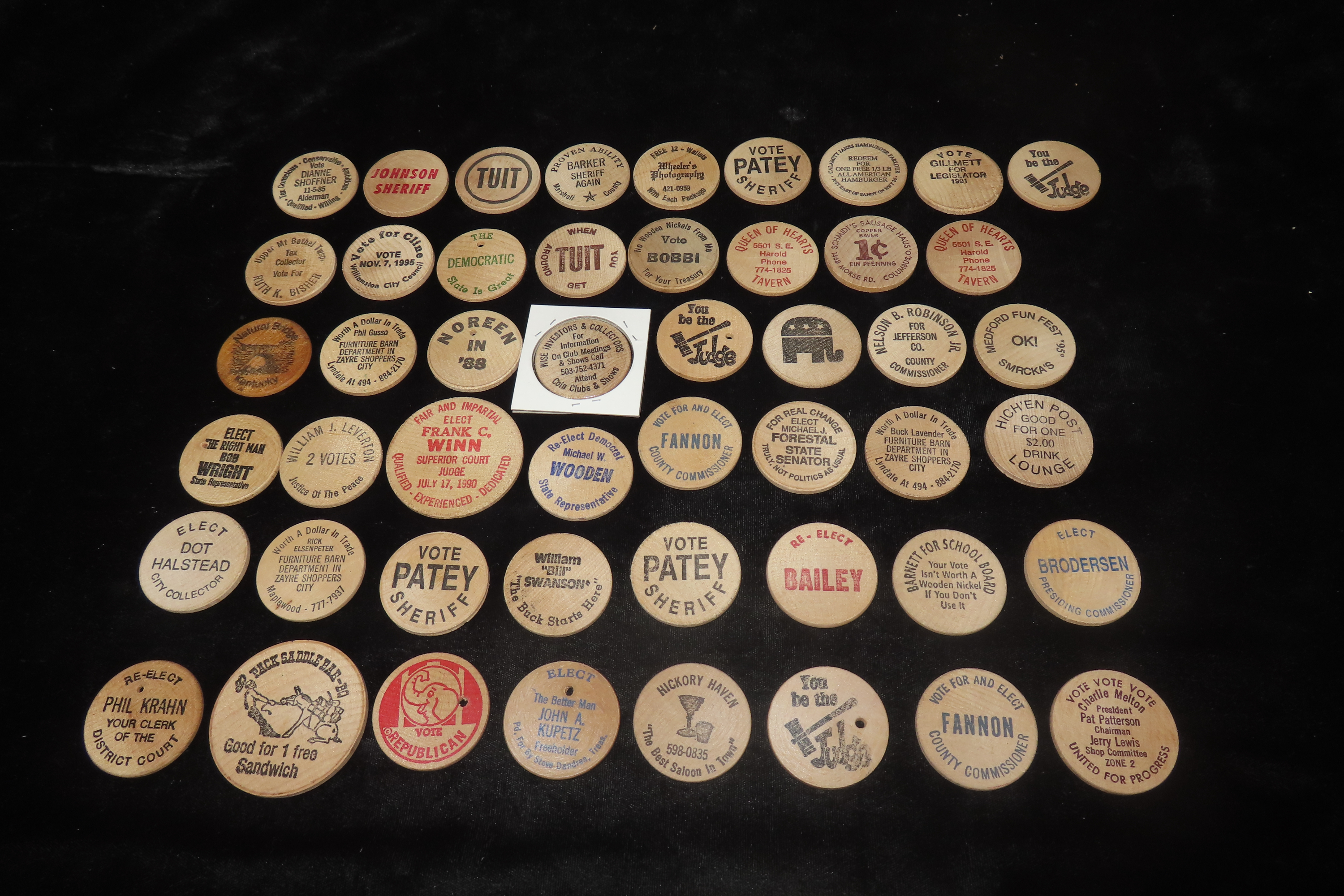 Large lot of Vintage Advertising Wooden Nickels, Tavers, Political, Sheriff, Senator, Judge, All kinds of Different Examples