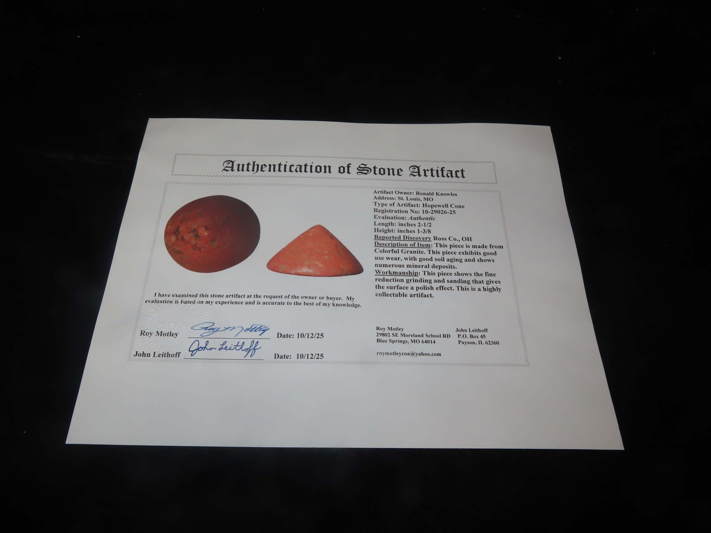2 1/2″ Hopewell Cone, Motley COA, Ross County Ohio, Very Colorful Example with Great Polish