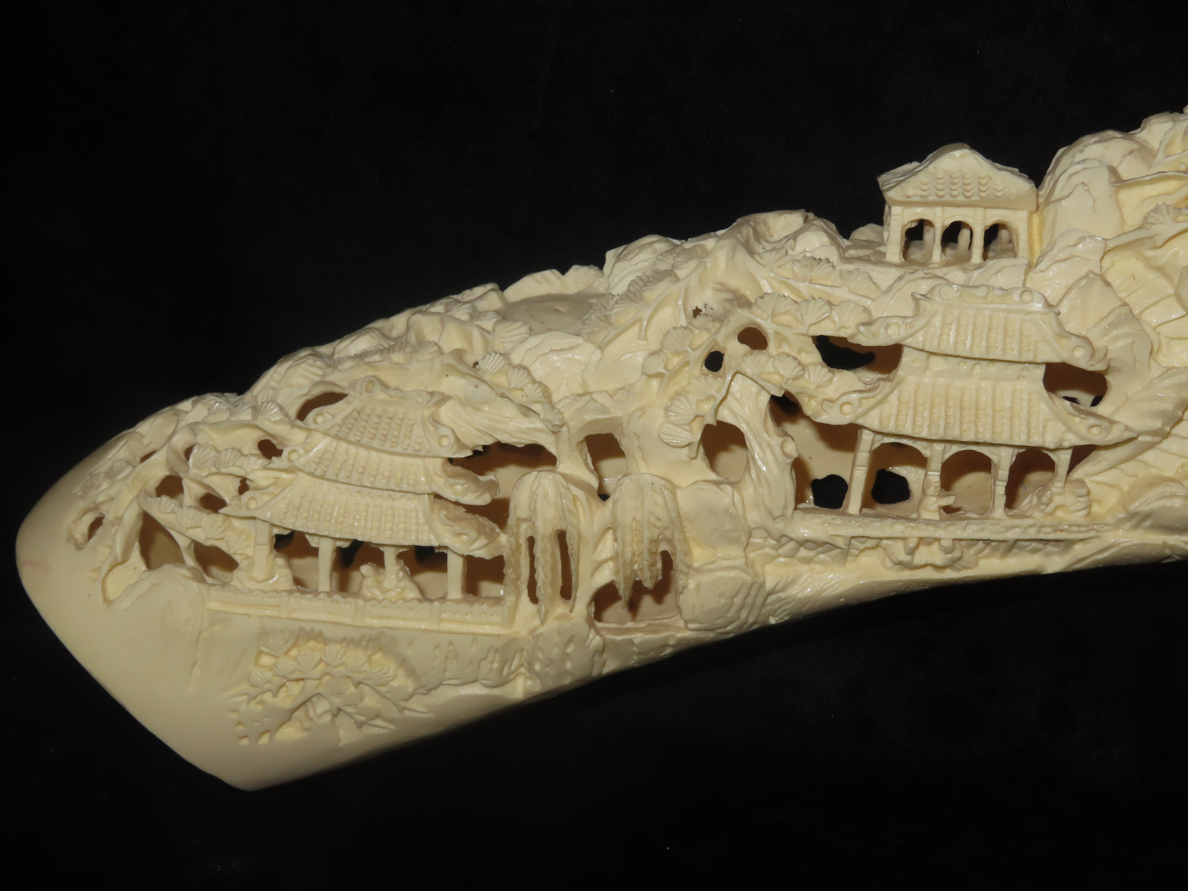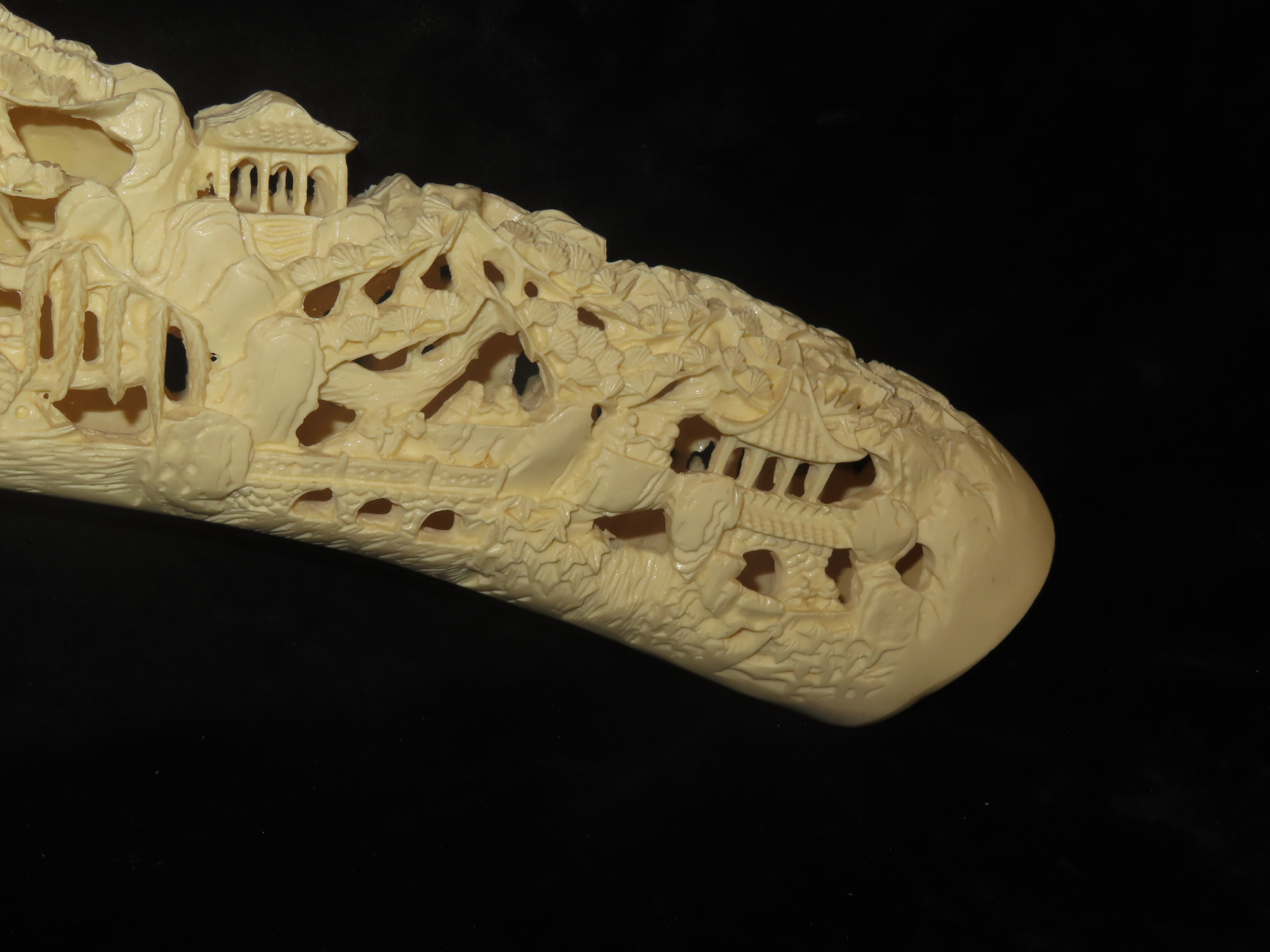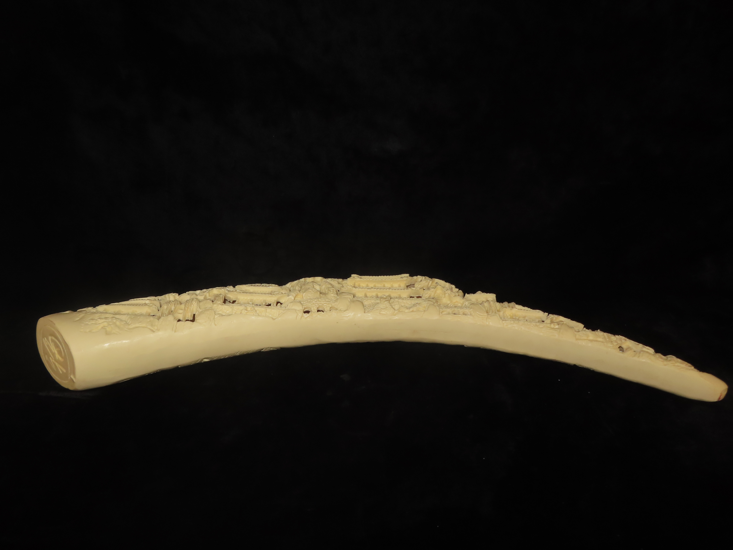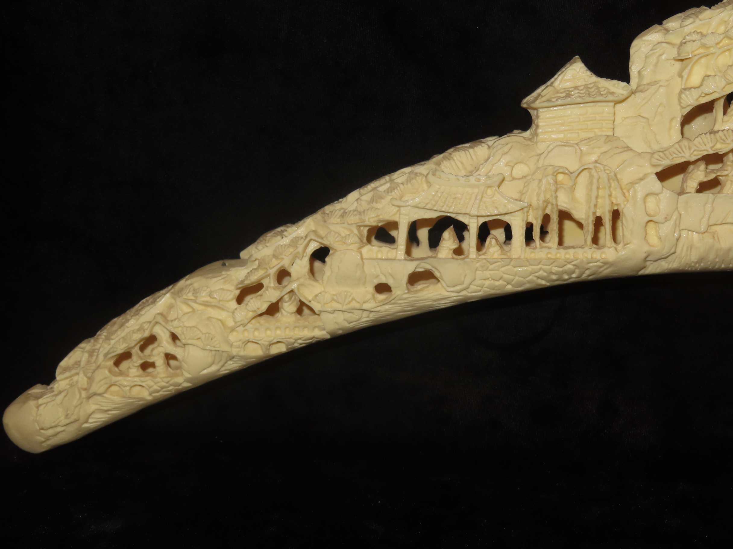 HUGE 29 1/4″ Faux Ivory Engraved Designed Resin Tusk, Intricately Designed Example, Cast Resin Plastic, Displays Nicely
