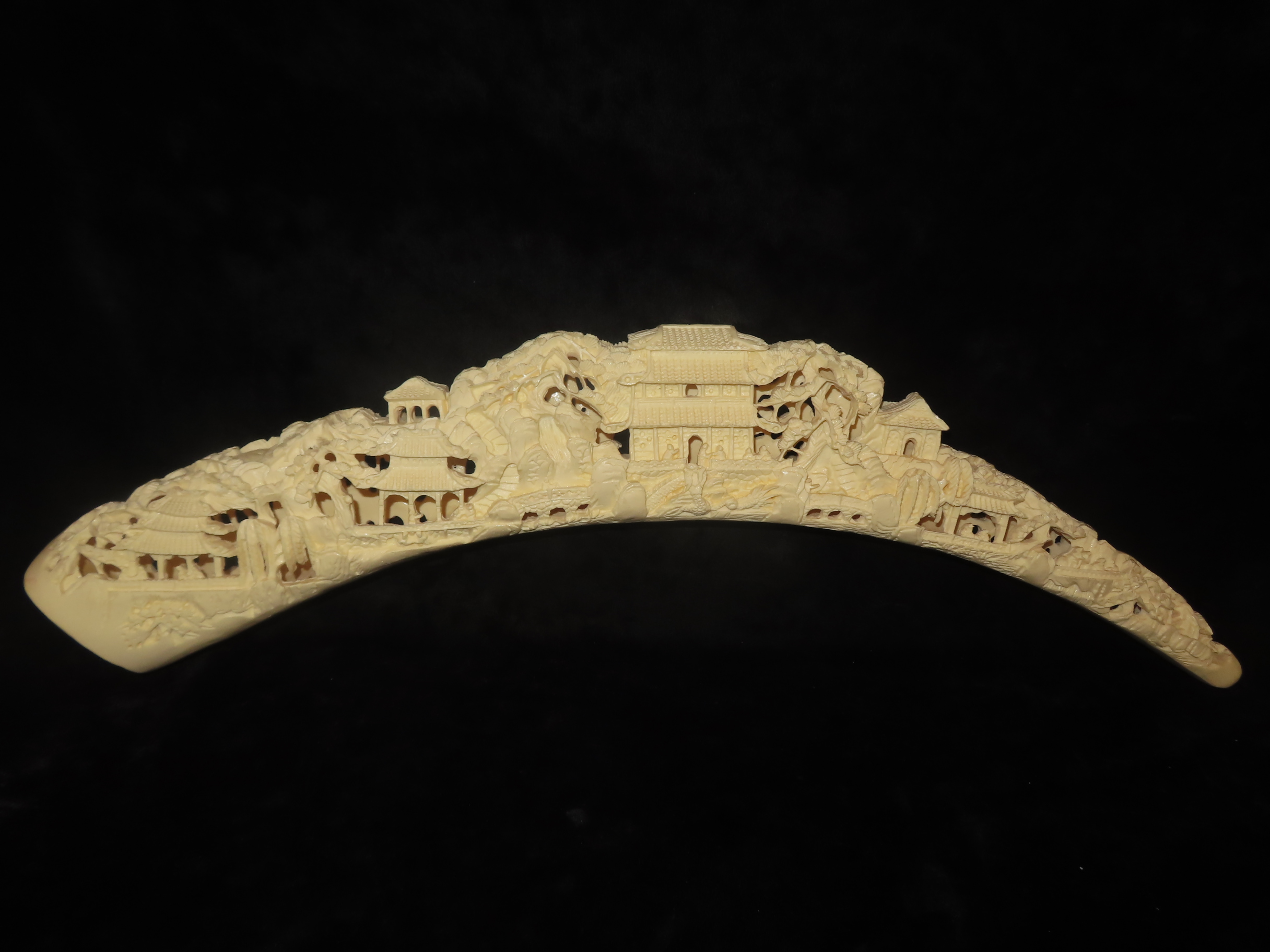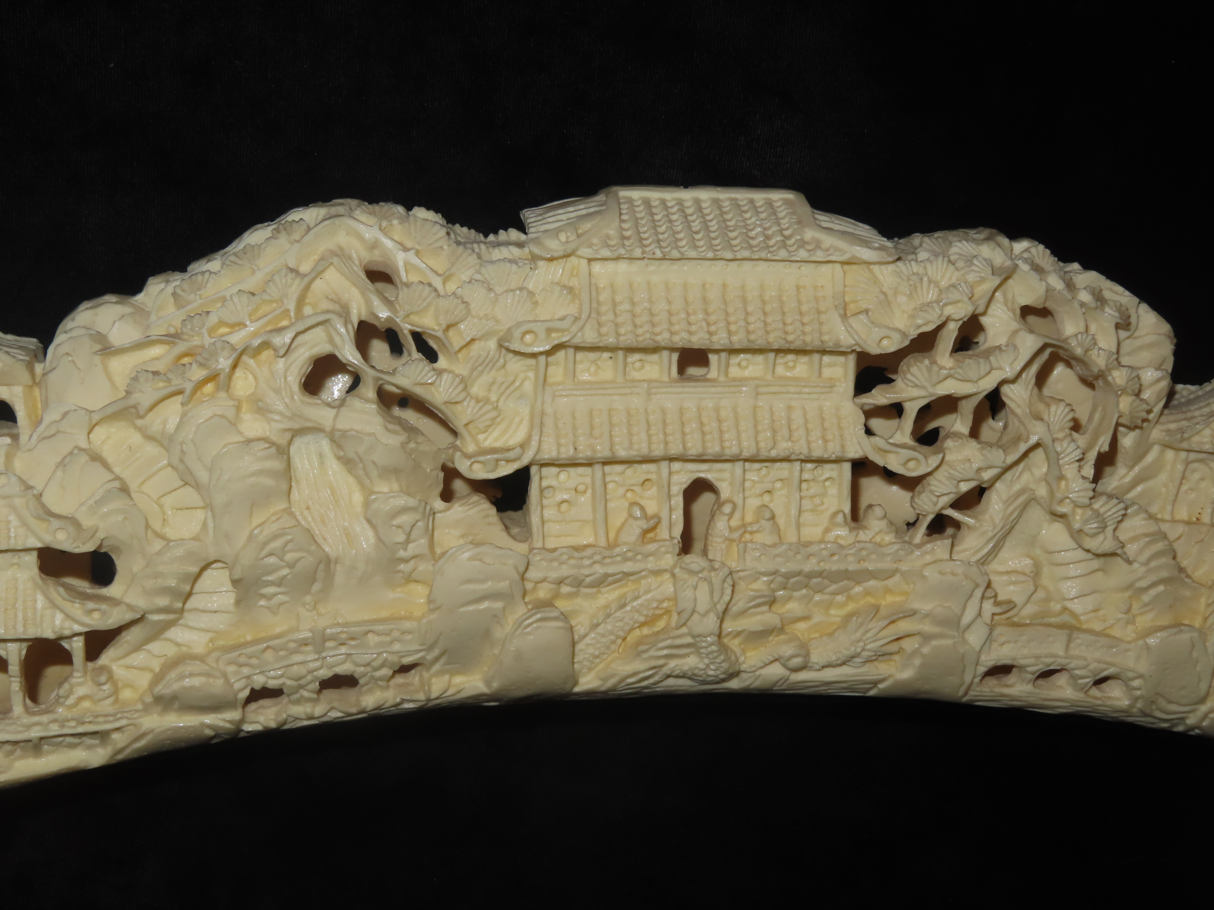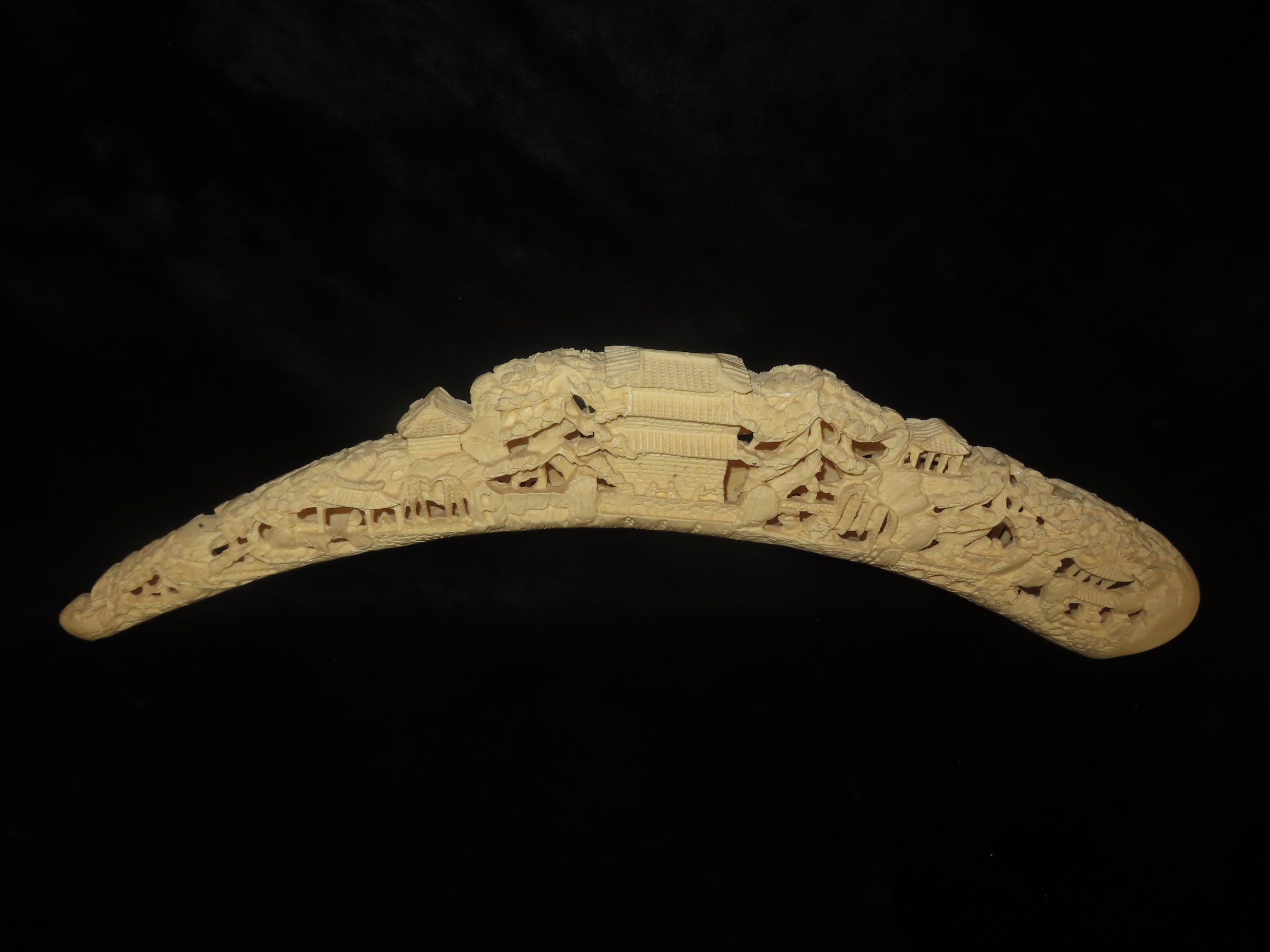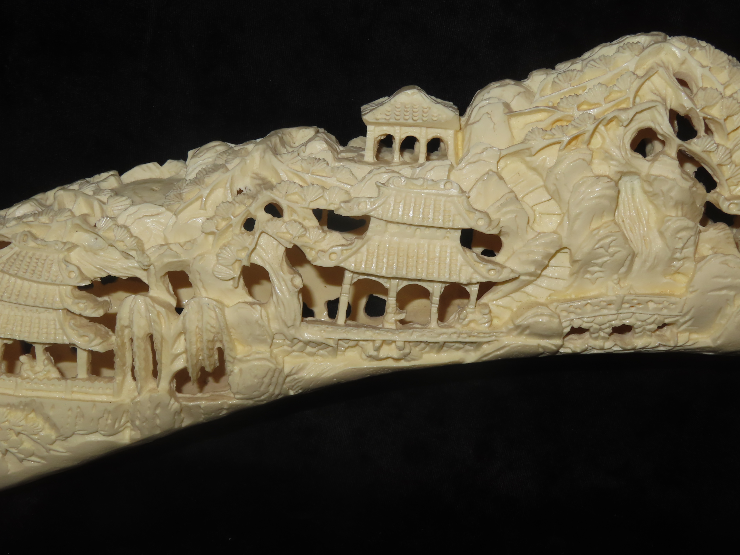 HUGE 29 1/4″ Faux Ivory Engraved Designed Resin Tusk, Intricately Designed Example, Cast Resin Plastic, Displays Nicely