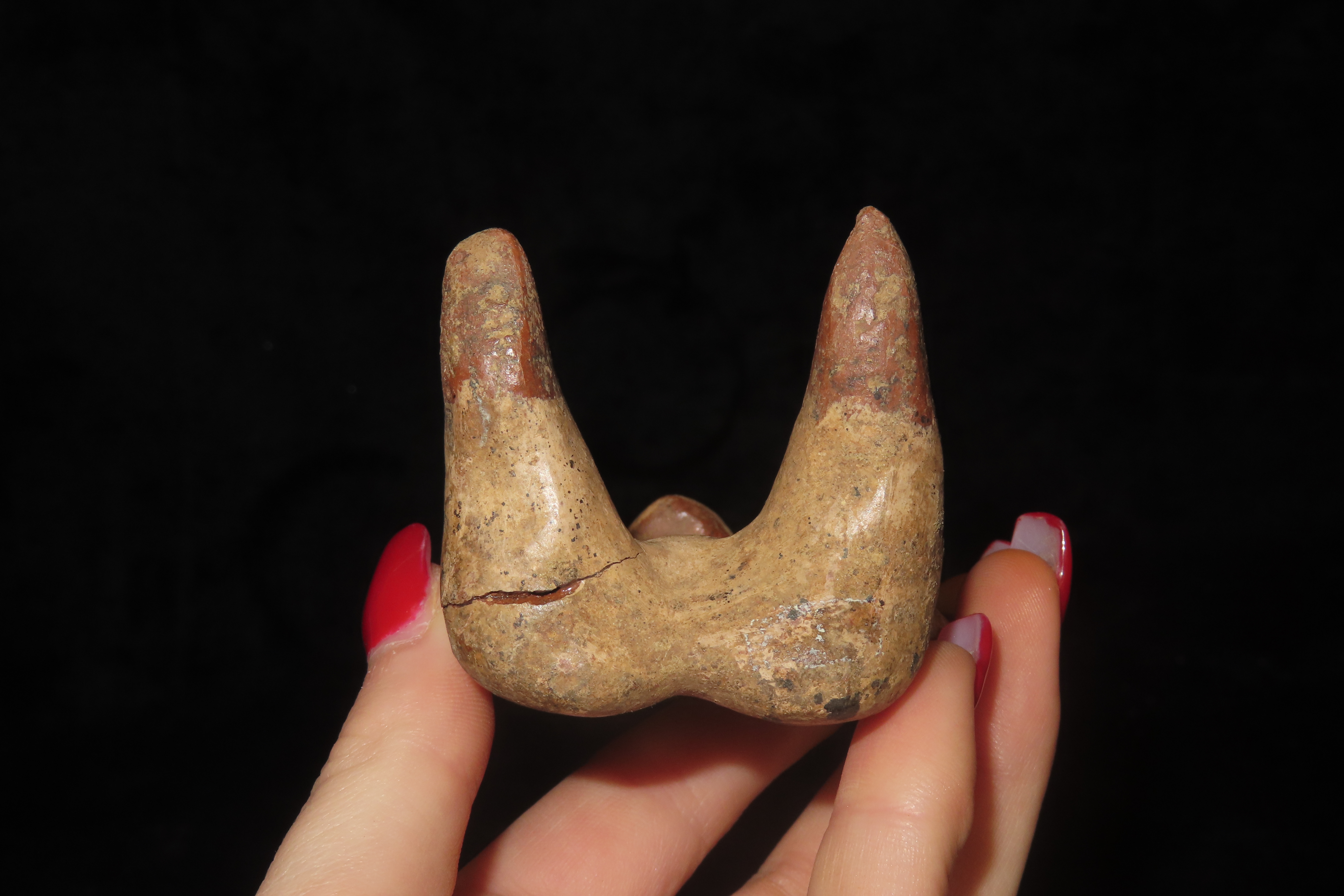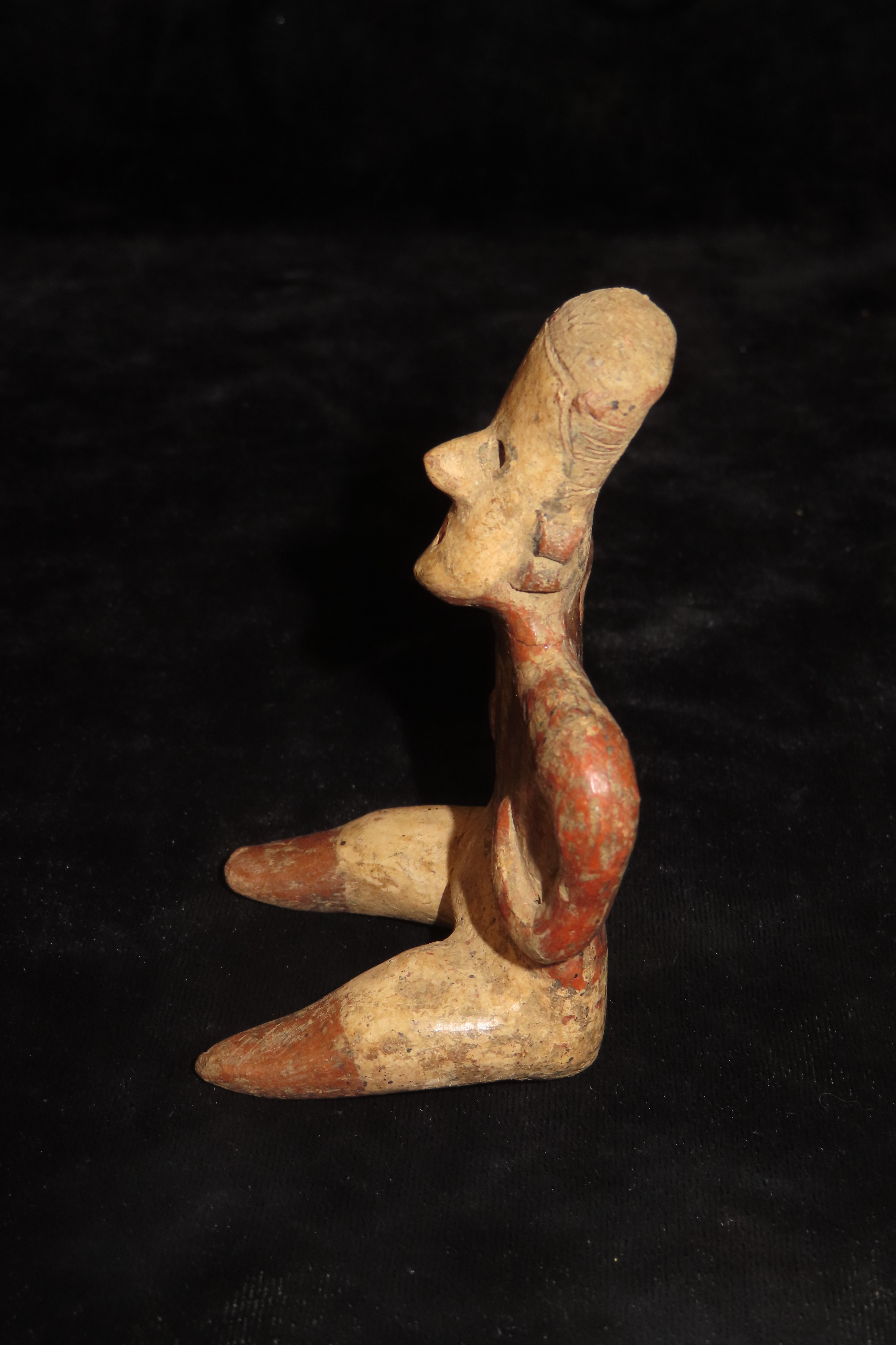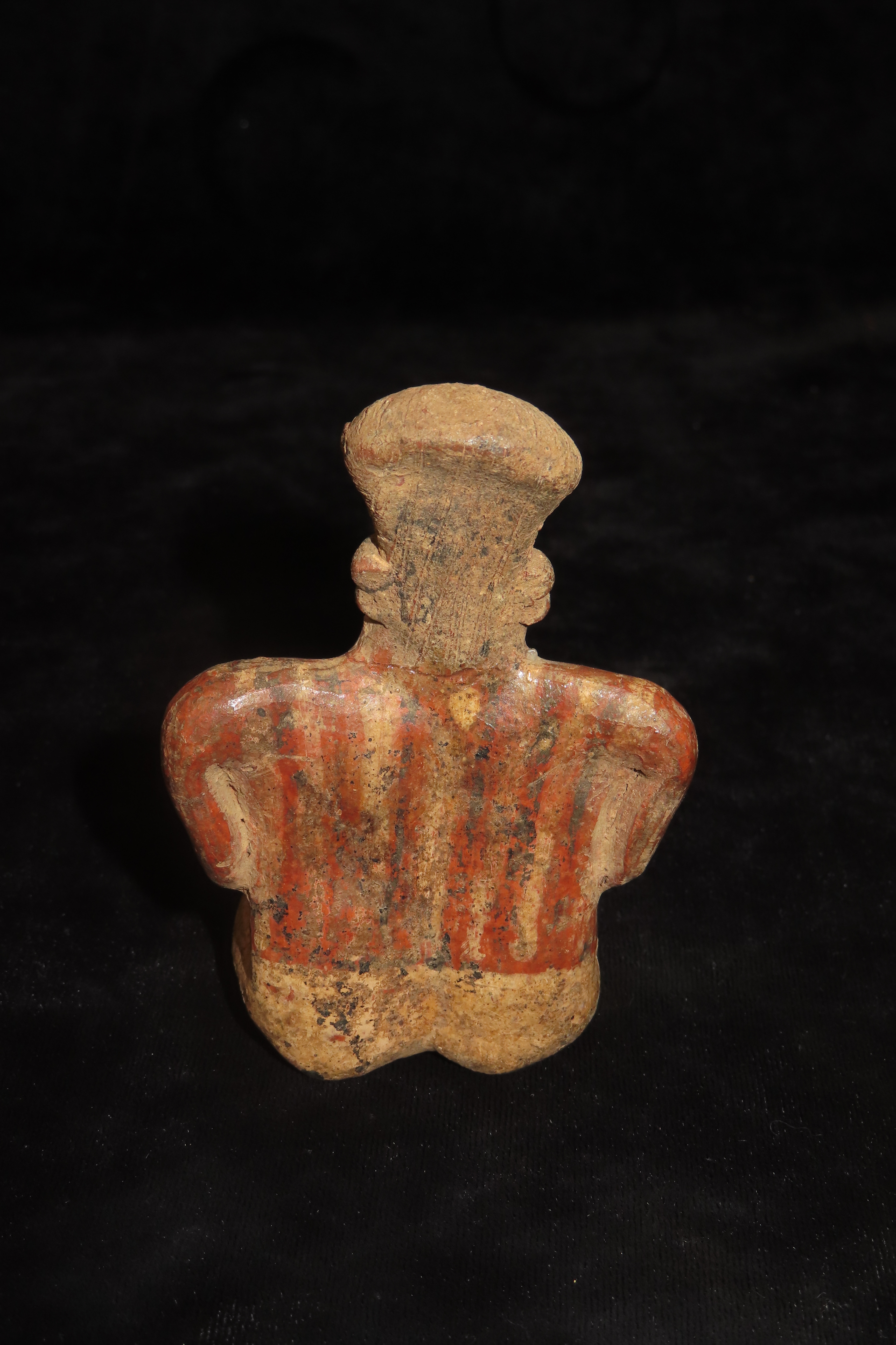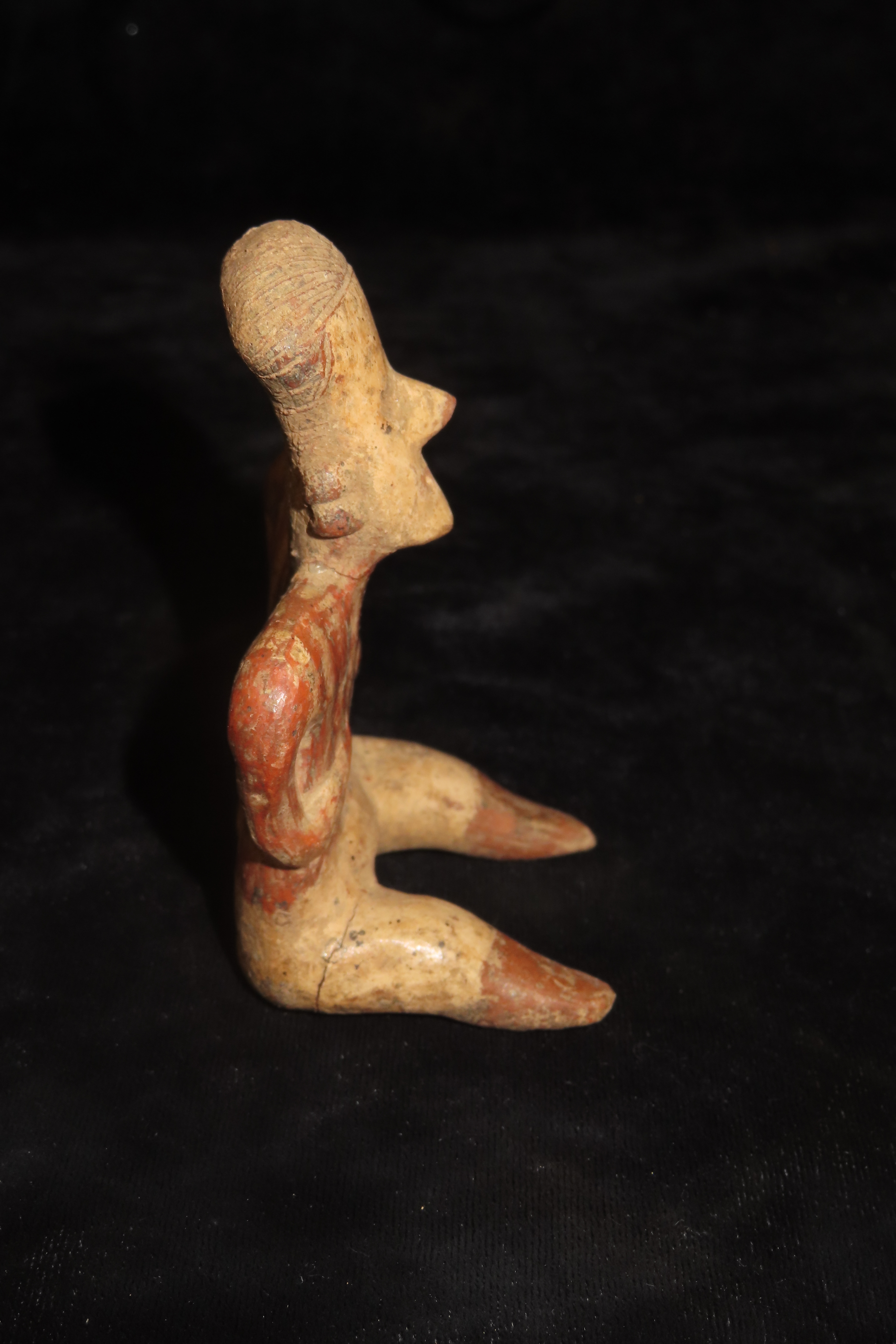 3 1/2″ Pre-Columbian Polychrome Painted Seated Warrior Figure, 400-800 AD, Jalisco Mexico, broken and glued
